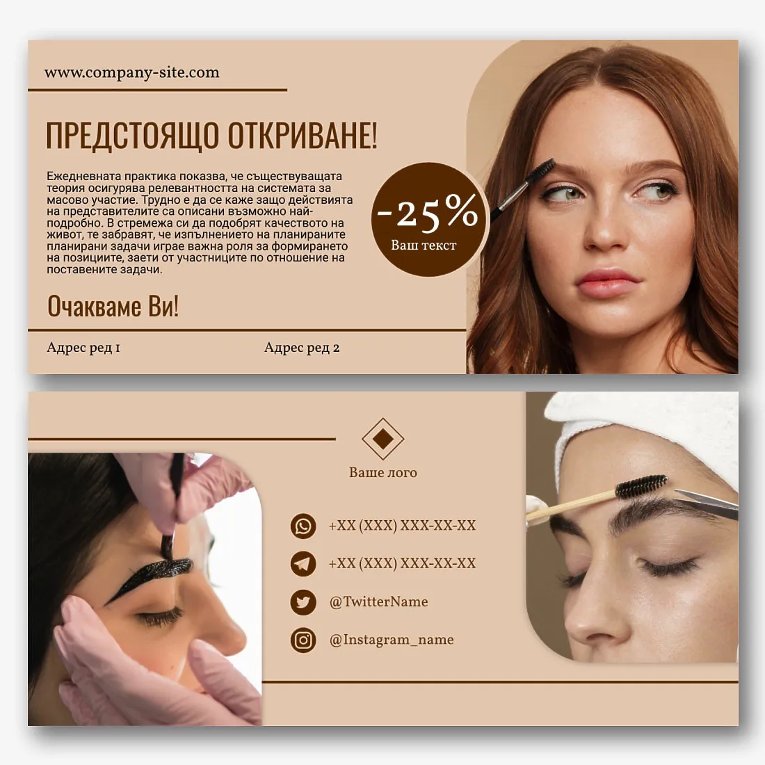 - Можете да направите дизайна на необходимите продукти онлайн, тоест да направите сами оформлението на листовка и флаер в удобен онлайн дизайнер. Диайнерът ще осигури достъп до шаблони, шрифтове, маски, фонове, клипарти. За да се впуснете в дизайна на листовка или флаер, щракнете върху синия бутон.