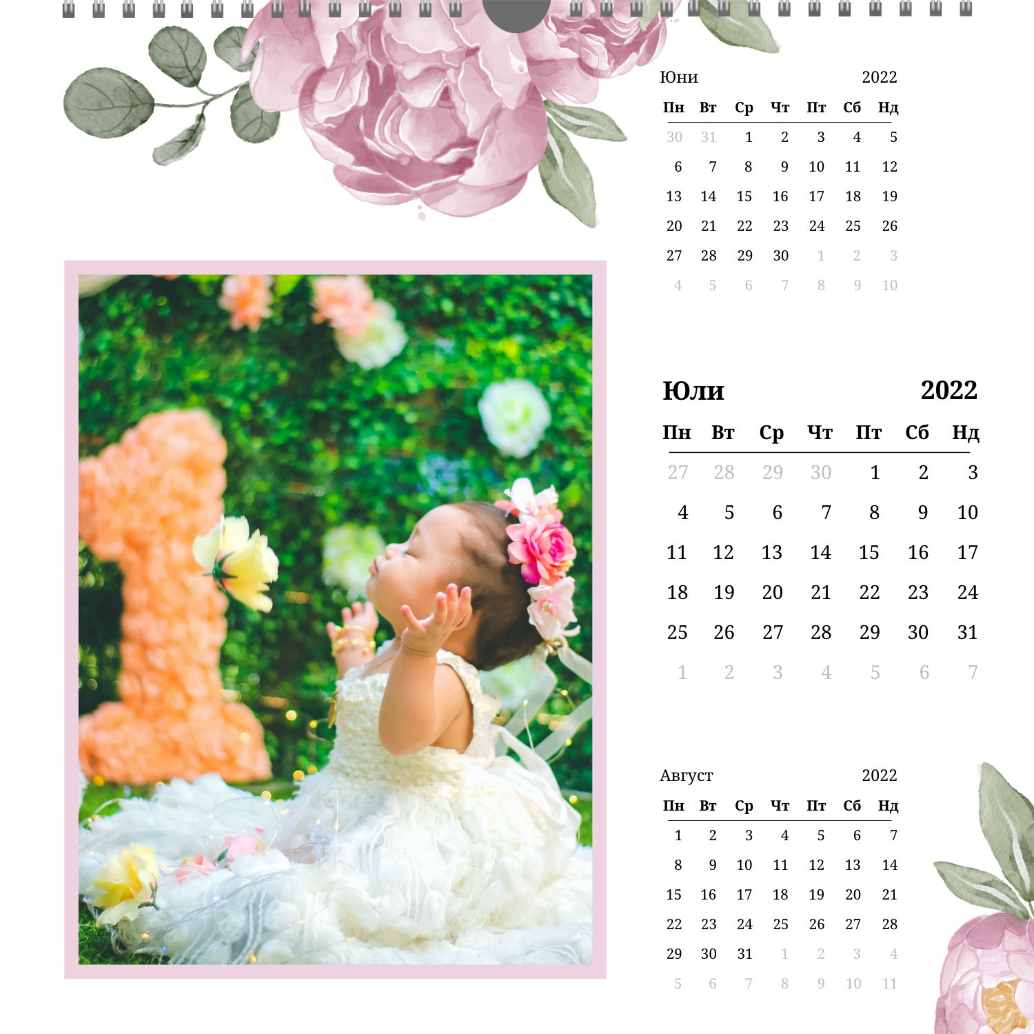 Освен това можете да направите оригинален подарък за рождения ден на любим човек или приятел, като започнете календариумът не от 1 януари, а от всеки месец, който Ви е необходим. С помощта на онлайн дизайнера на фото календари можете сами да създадете календариум от всяка дата, да промените неговия шрифт, стил и цветове.