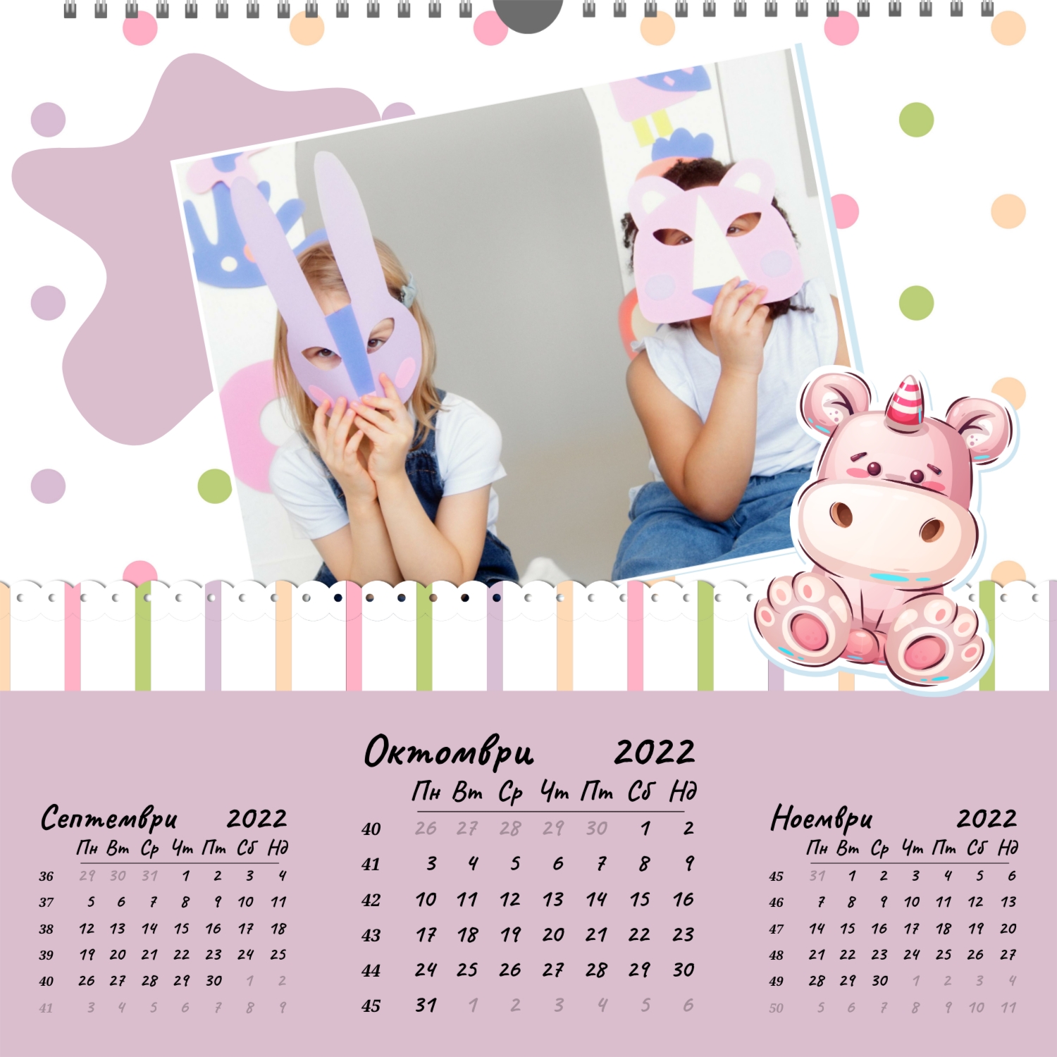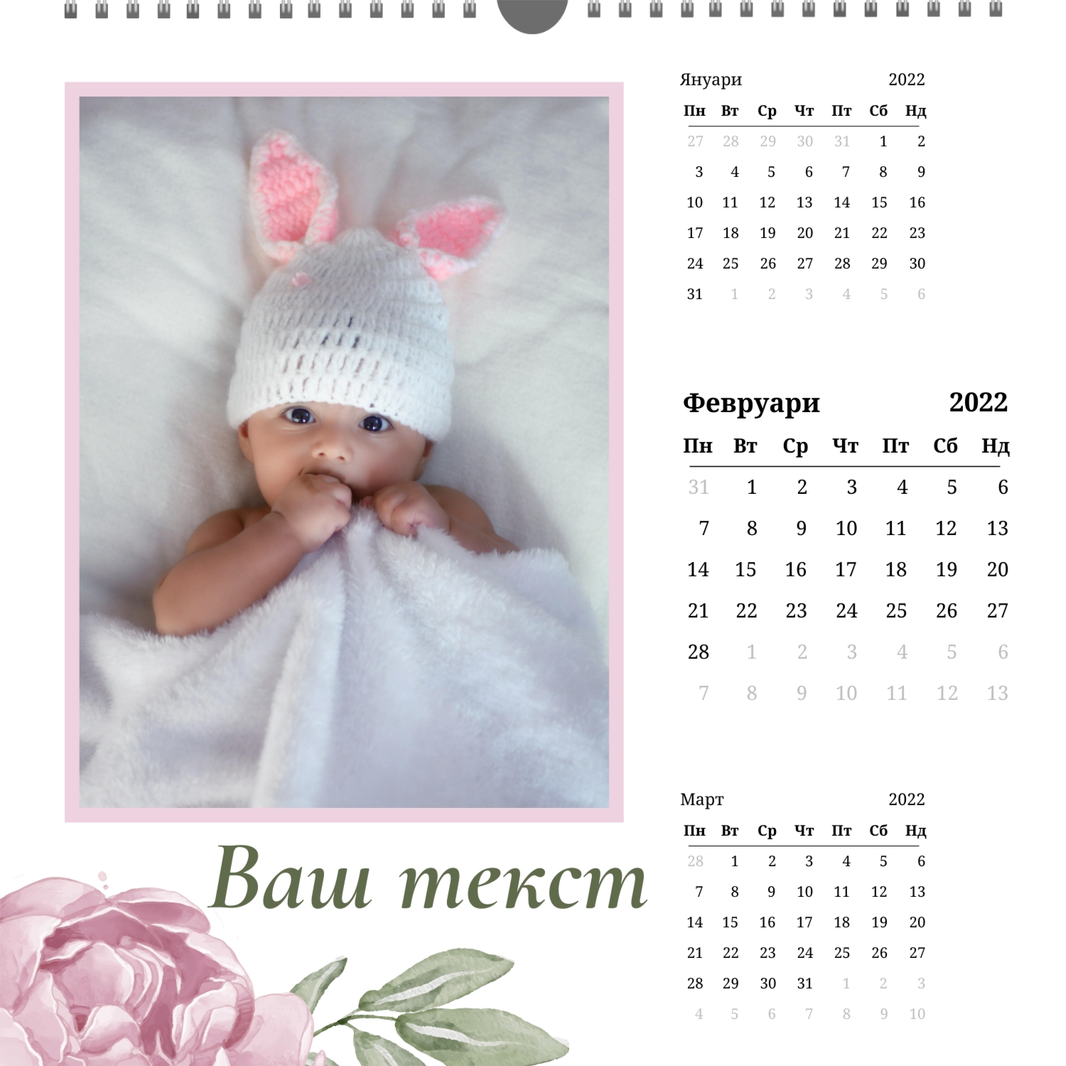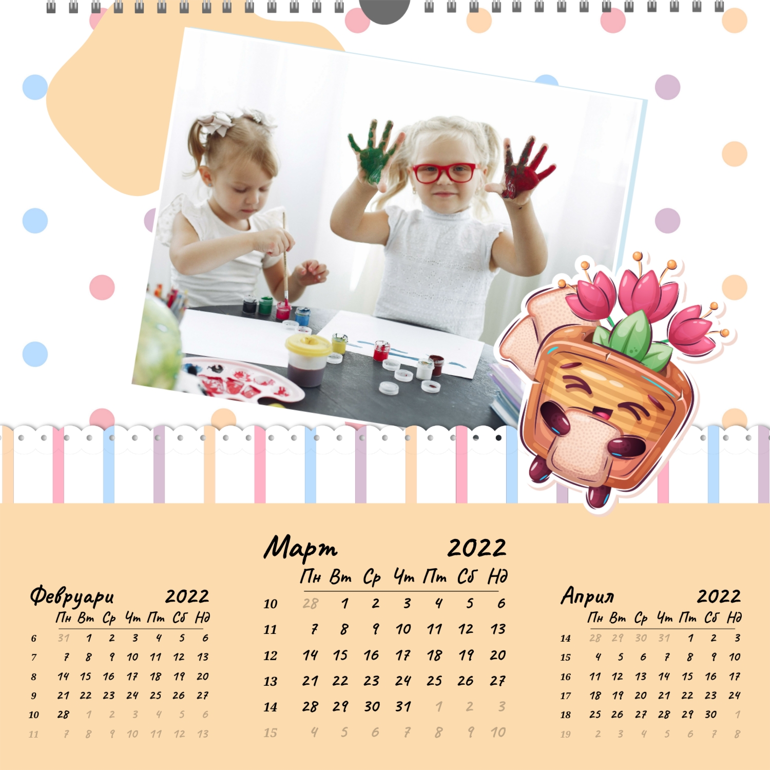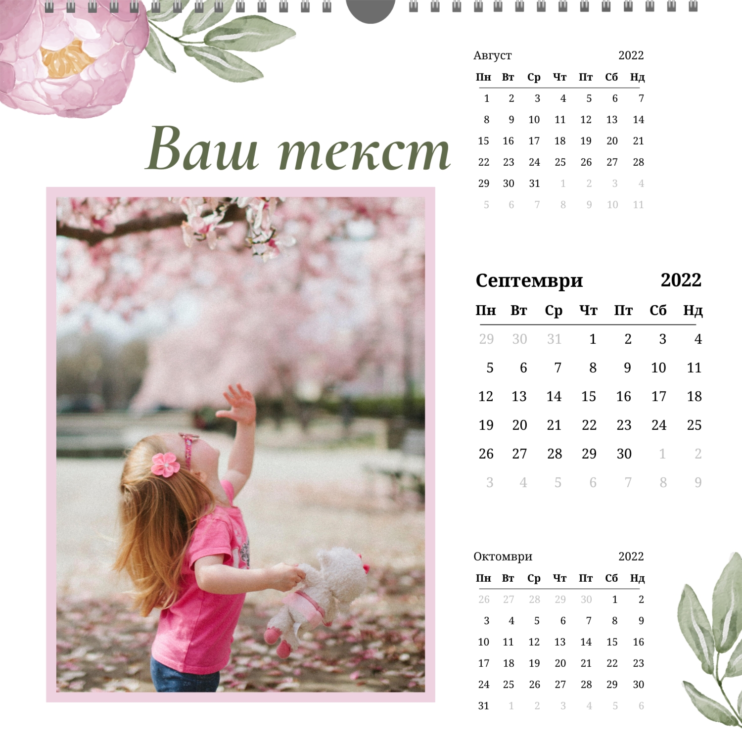 | Формати на календари: | А2 (420х594) А3 (297х420) А4 (210х297) 300х300 210х210 |
