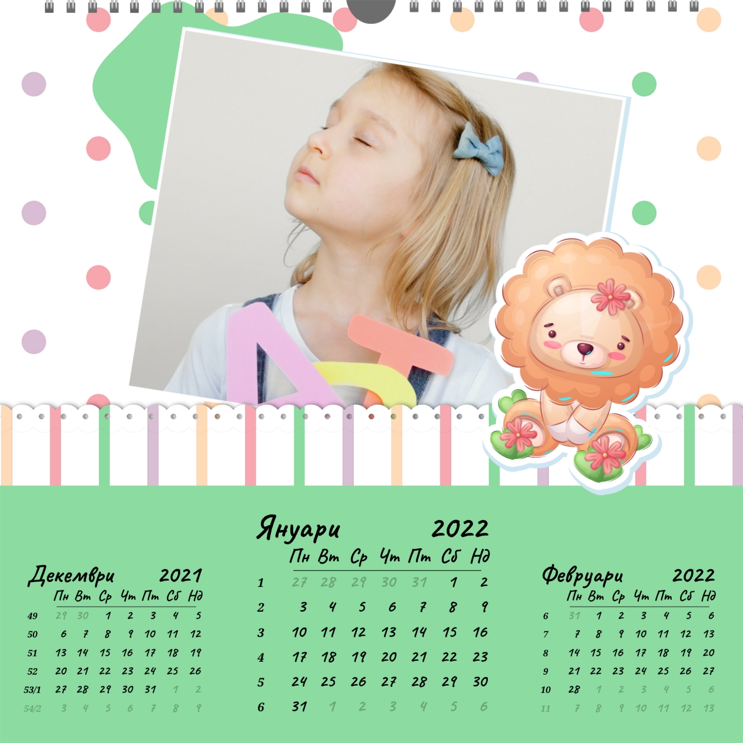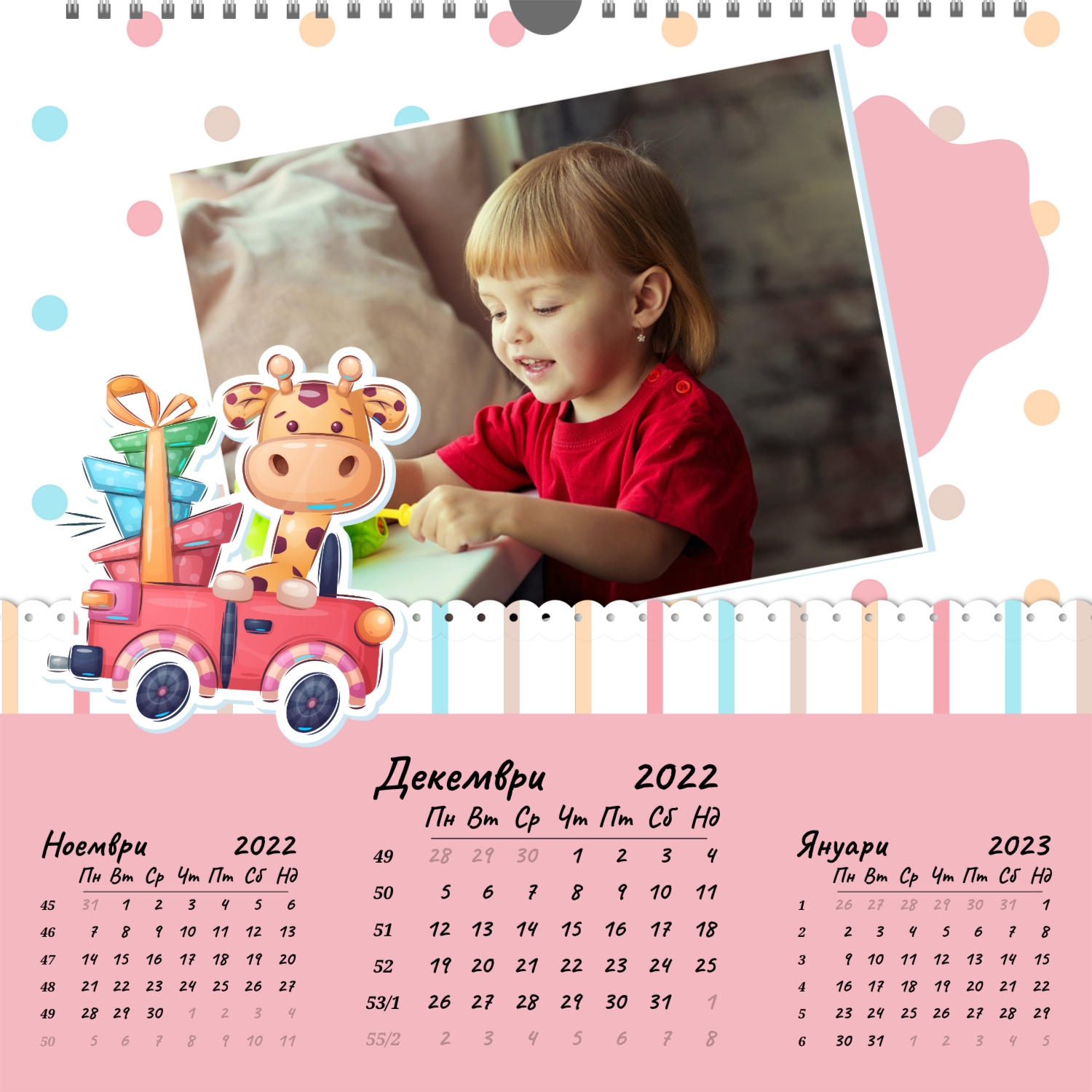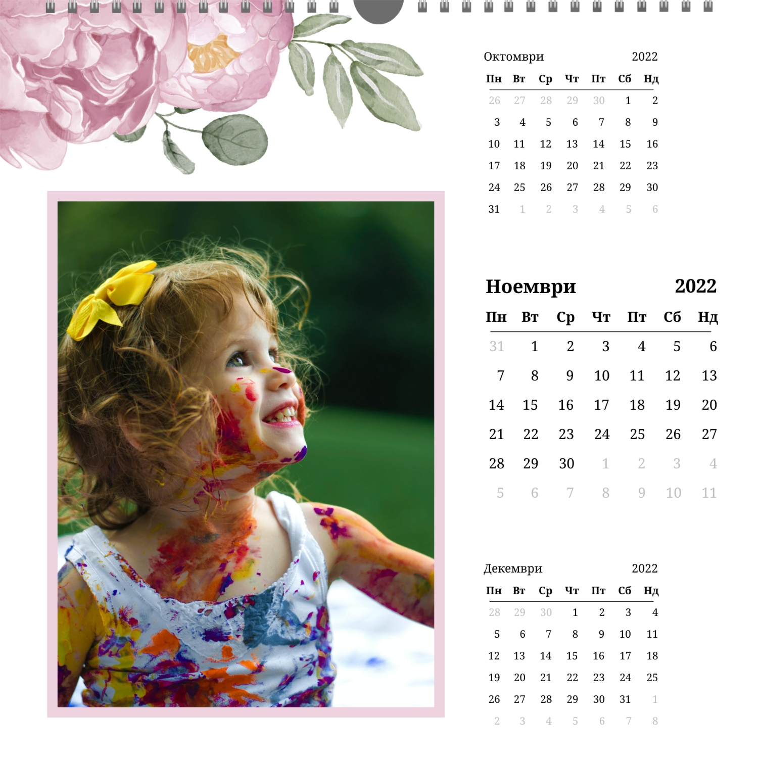 Стенният фото календар е незаменим атрибут за Новогодишните празници. Това е прекрасен подарък за приятели, колеги, партньори. Съвременните технологии за дигитален печат Ви позволяват да създадете уникален стенен фото календар за и при това да направите тираж дори в едно копие. Поръчайте този стенен фото календар със семейни снимки и той ще бъде прекрасен подарък за цялото семейство.