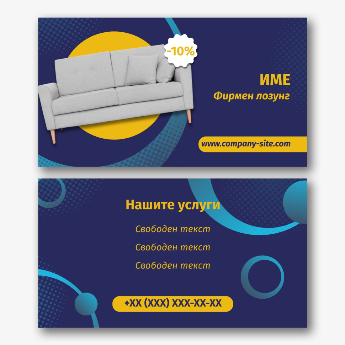 Безплатен шаблон за визитка за мебелен салон, производители на мебели и производители на мебели. Създайте оформление на визитка със собствените си ръце в дизайнера на визитки.