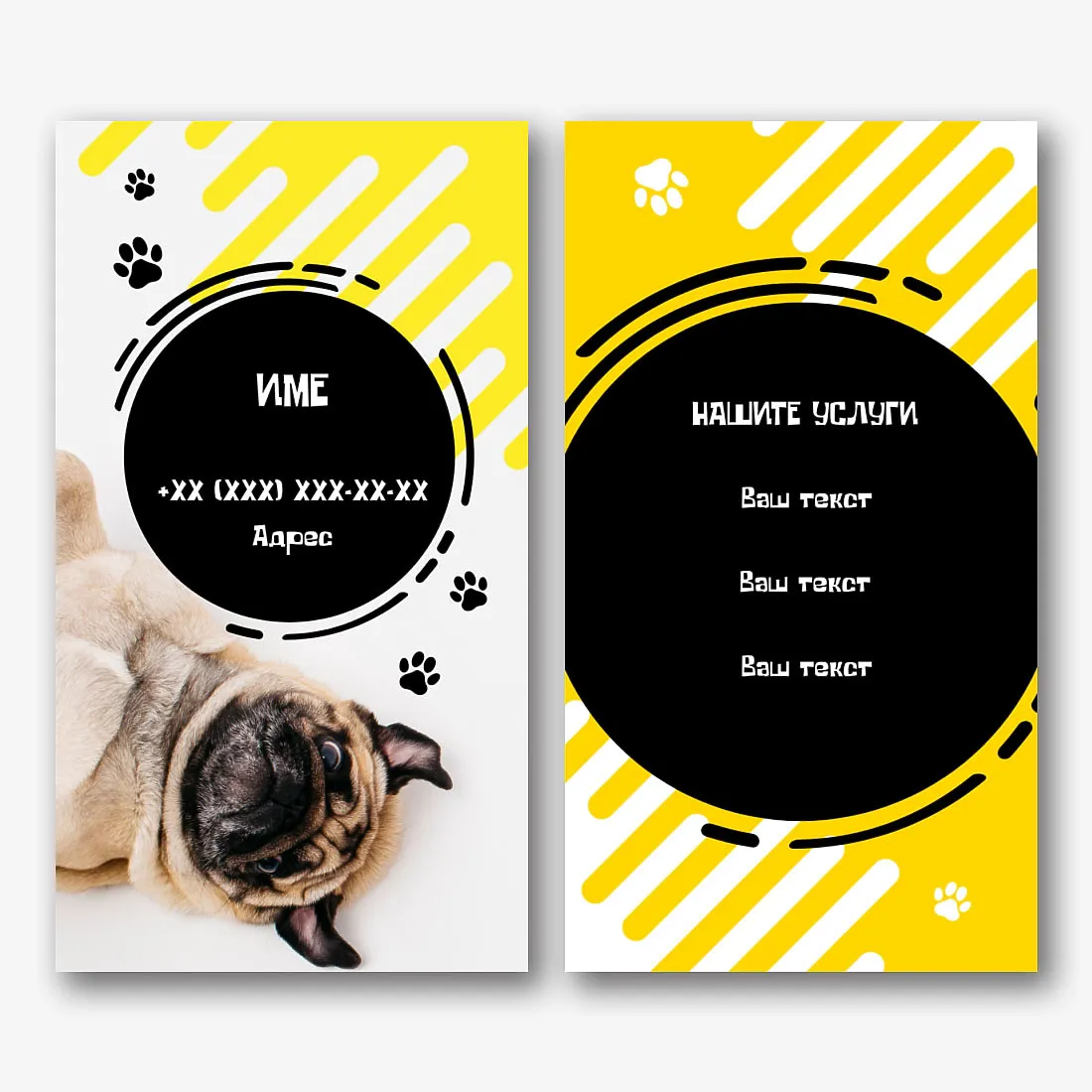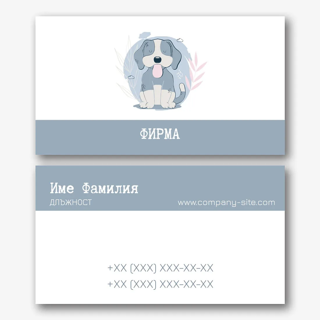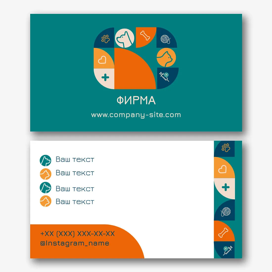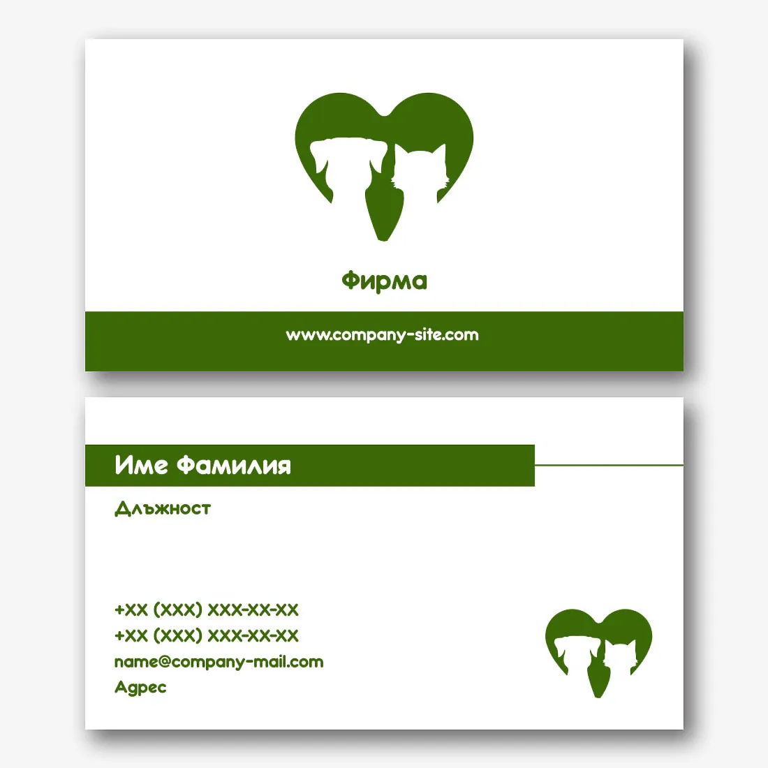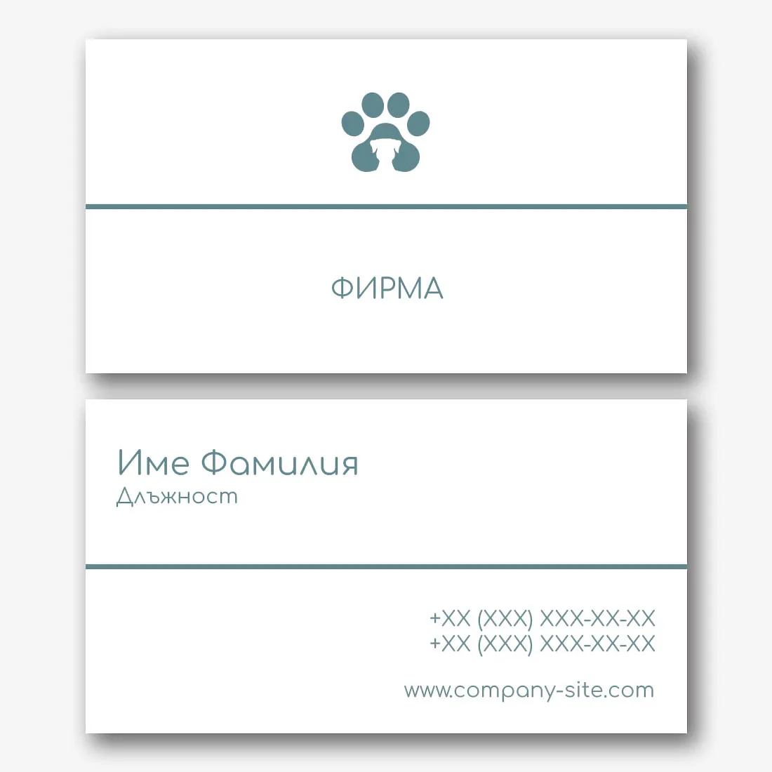 Безплатен шаблон за визитка за ветеринарни клиники и ветеринарни лекари. Създайте оформление със собствените си ръце в дизайнера на визитки.