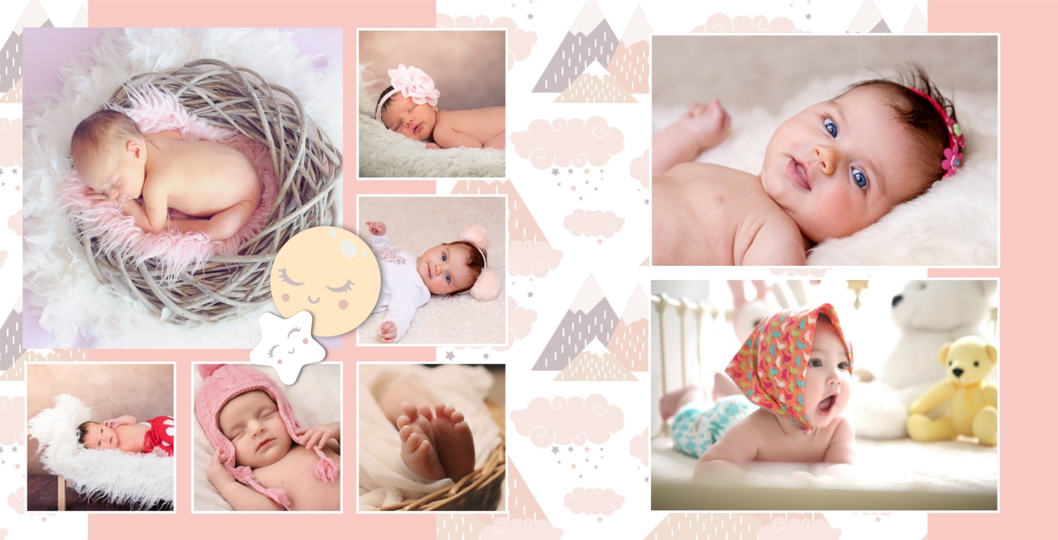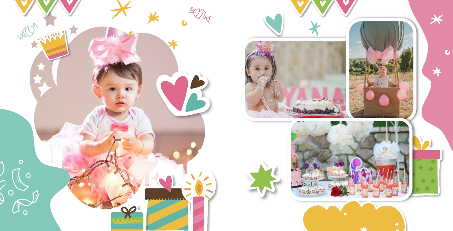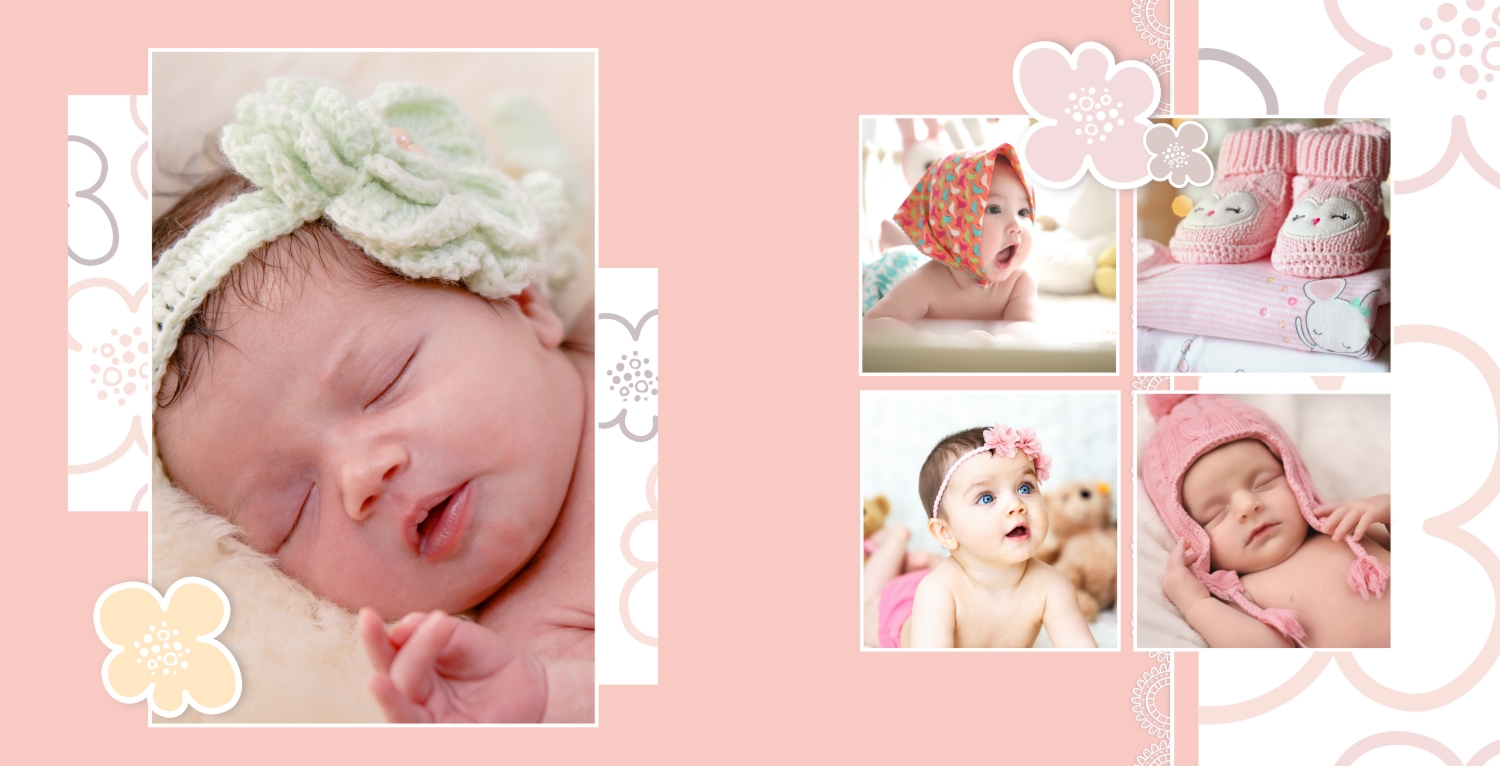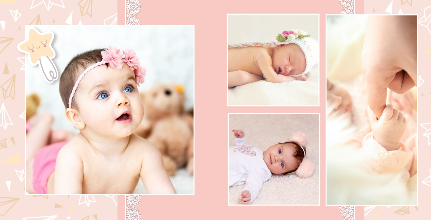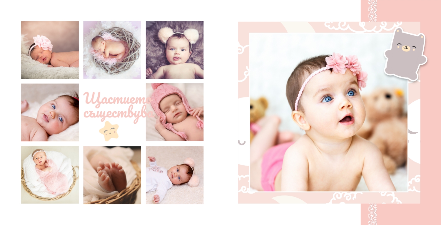 Безплатен шаблон за детска фотокнига от раждането до годината за момиче. Създайте оформление със собствените си ръце в онлайн конструктора на фотокниги.
