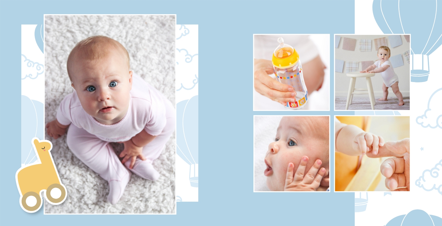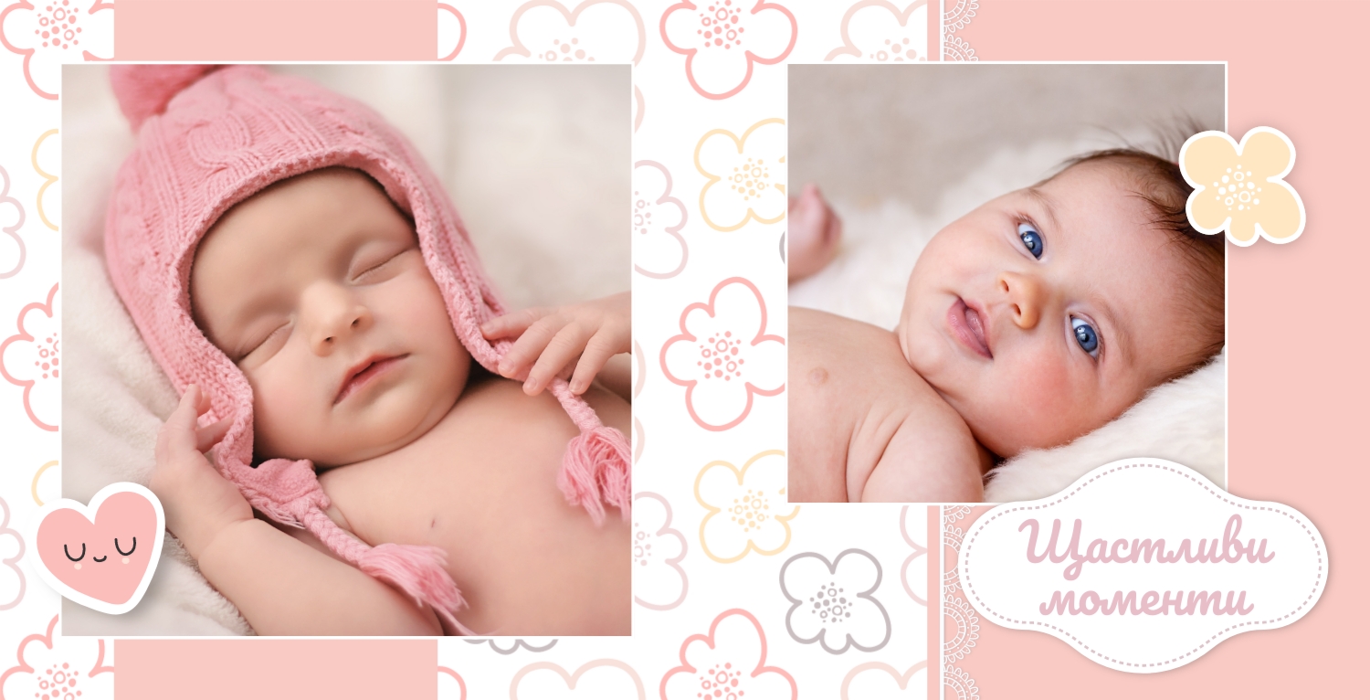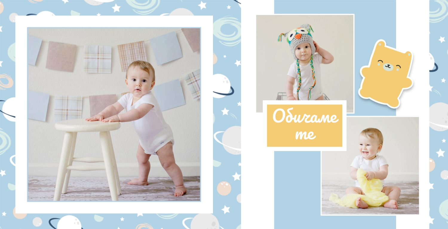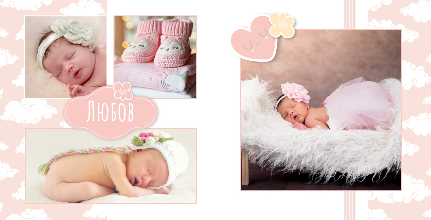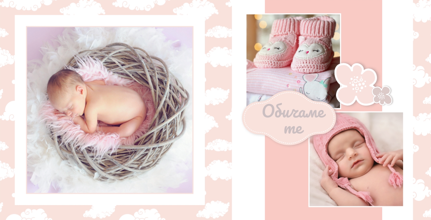 Безплатен шаблон за детска фотокнига от раждането до годината за момиче. Създайте оформление със собствените си ръце в онлайн конструктора на фотокниги.