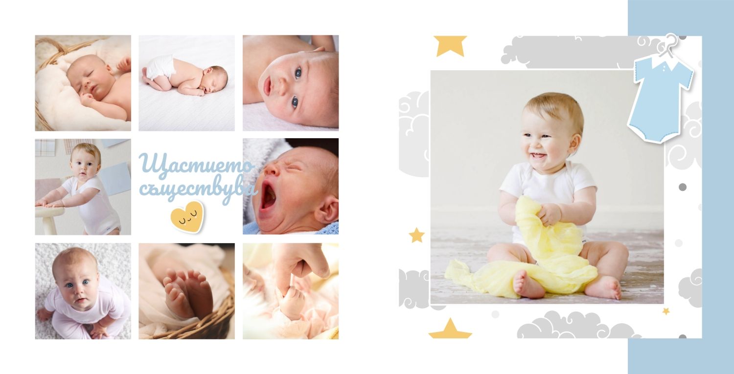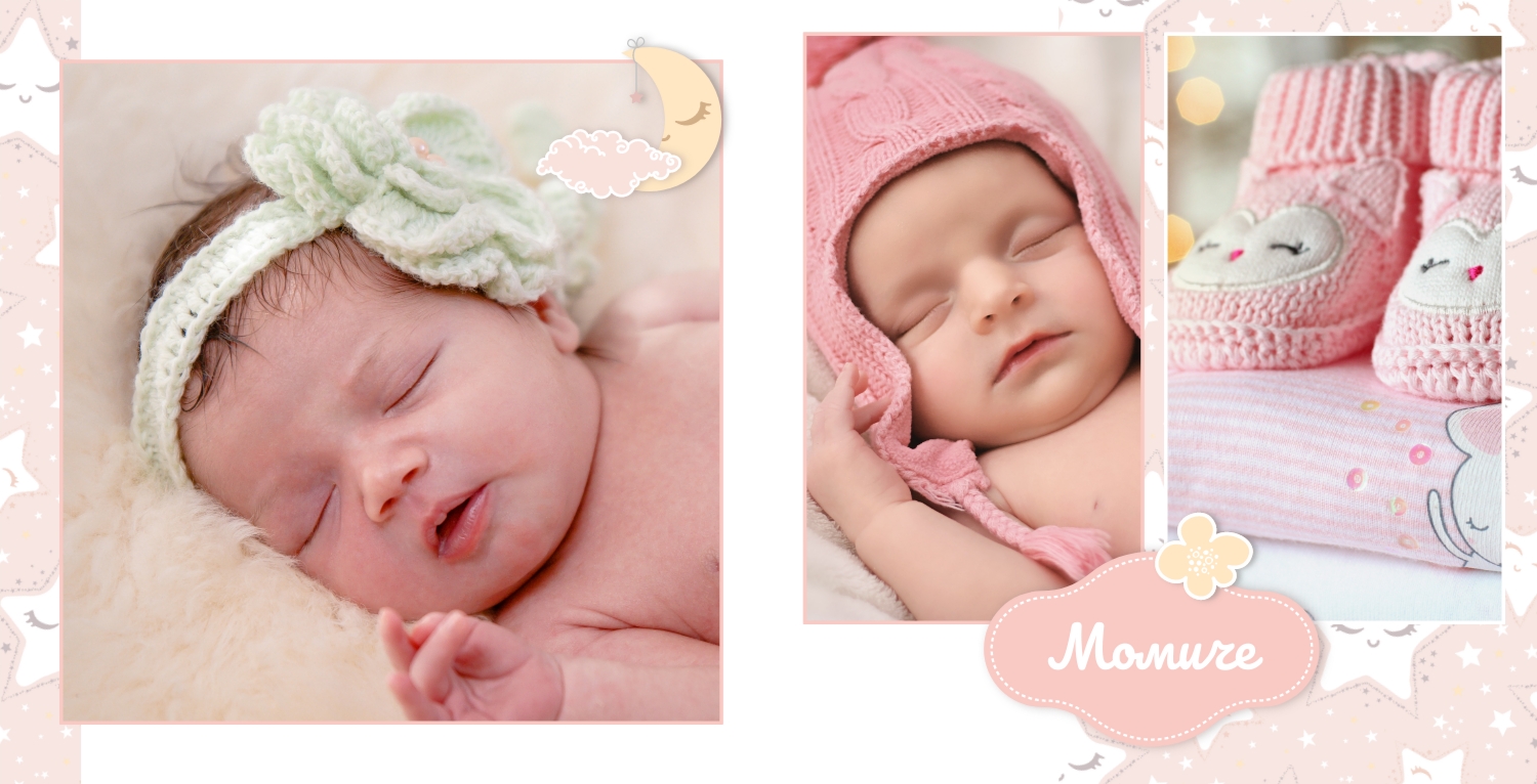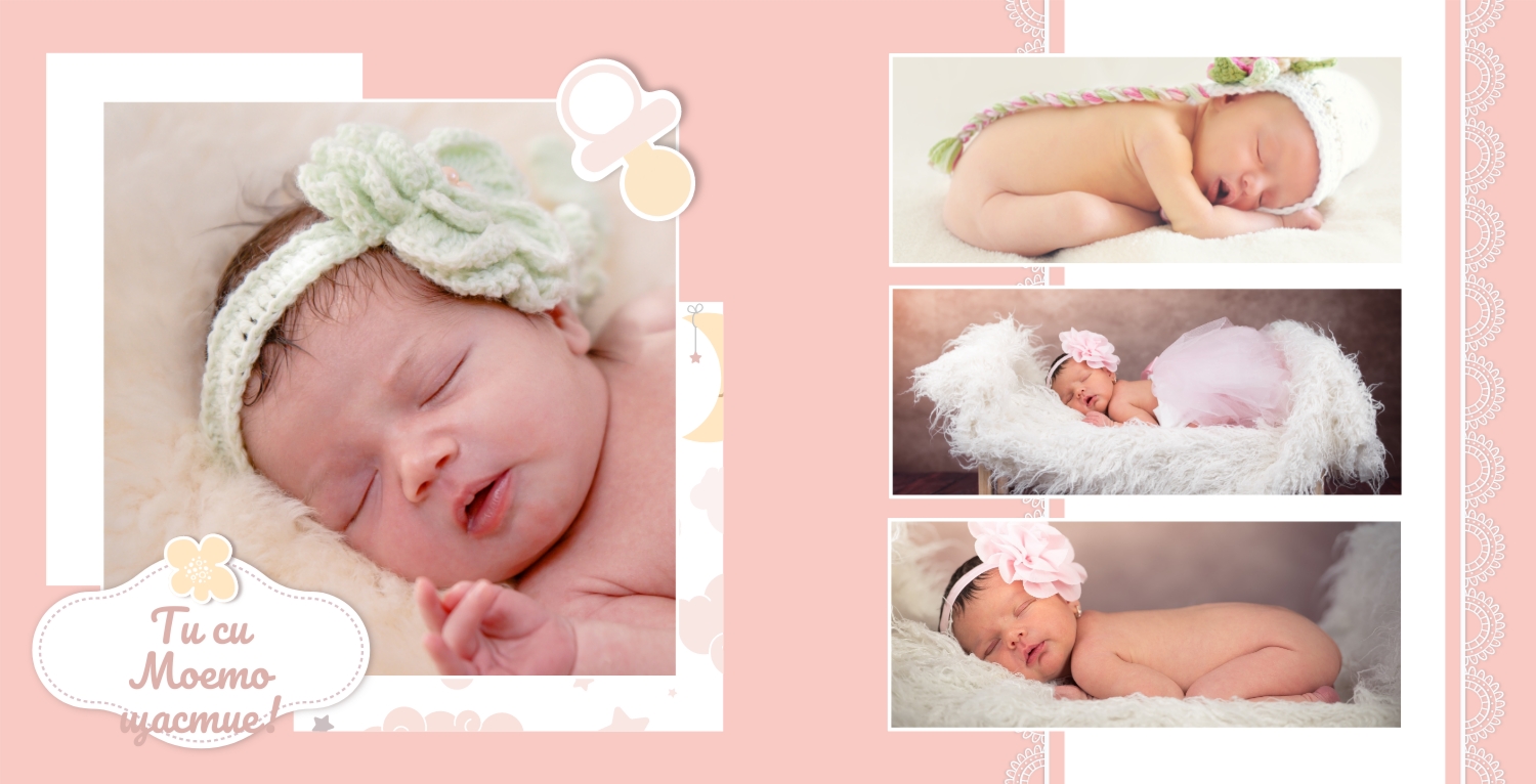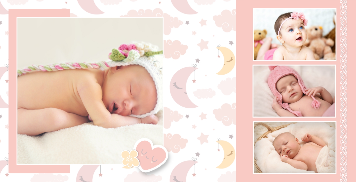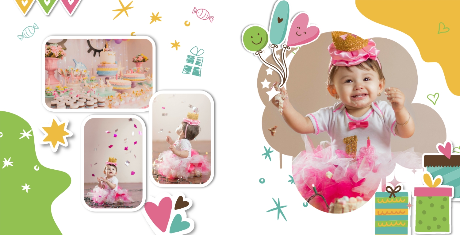 Безплатен шаблон за детска фотокнига от раждането до годината за момиче. Създайте оформление със собствените си ръце в онлайн конструктора на фотокниги.
