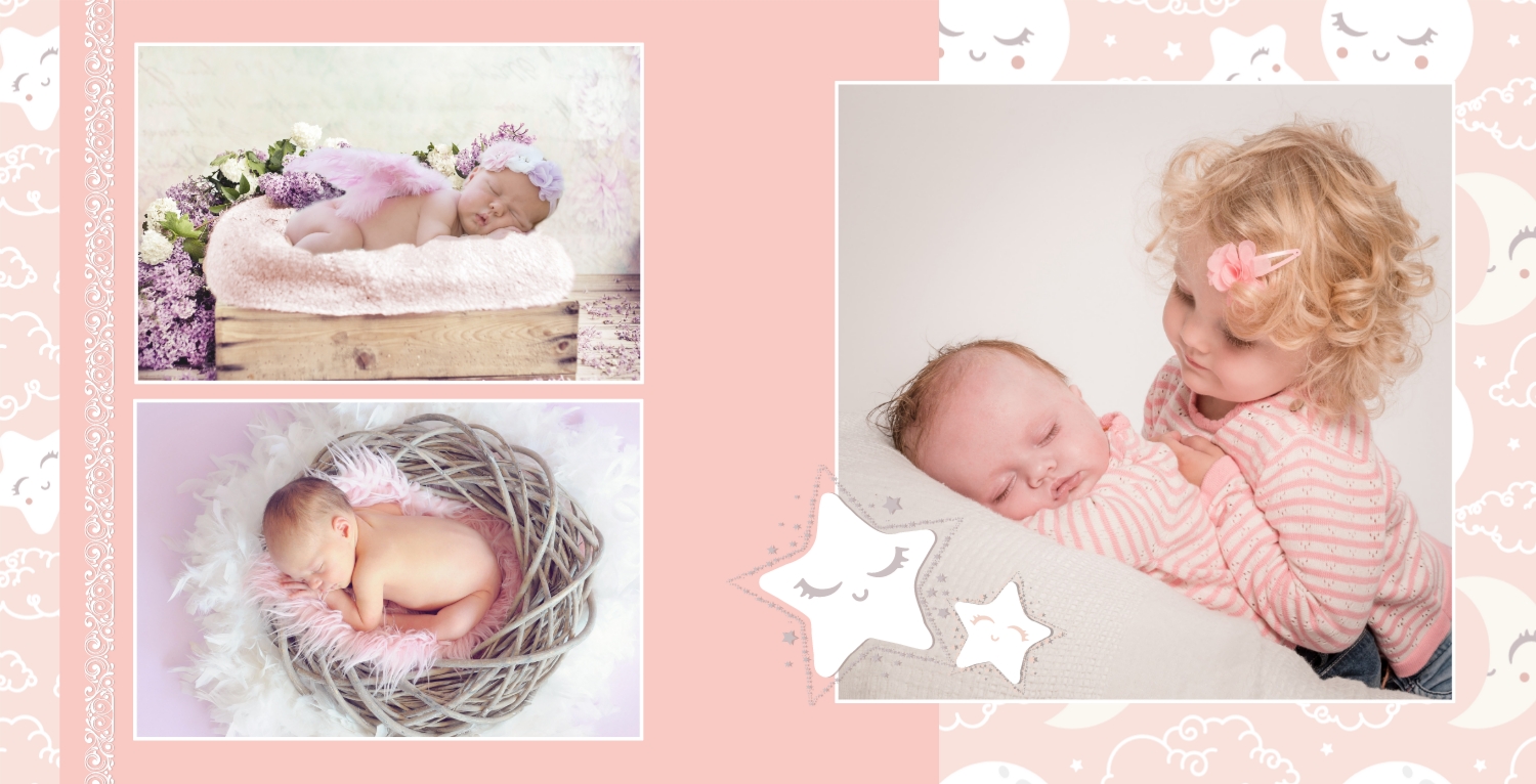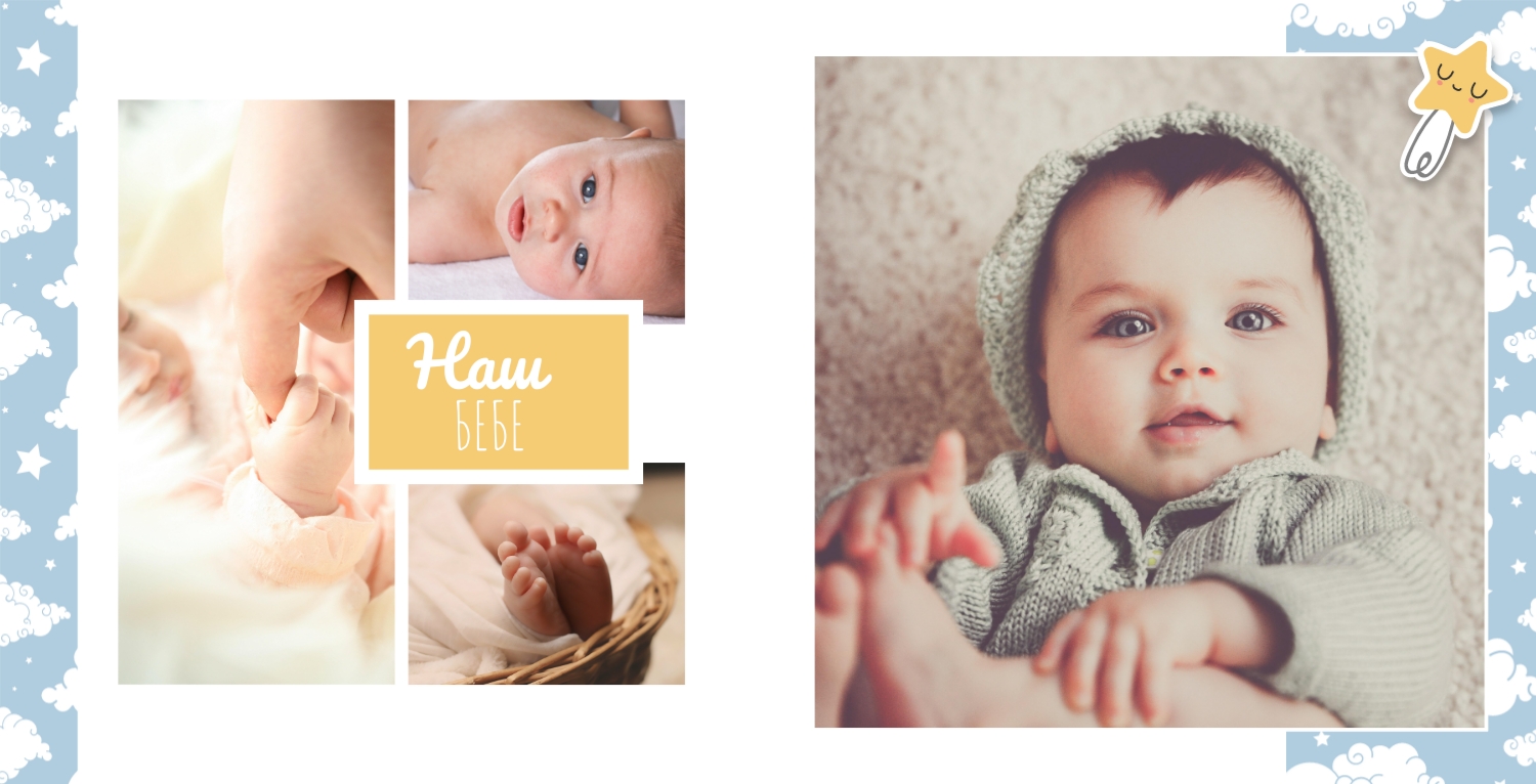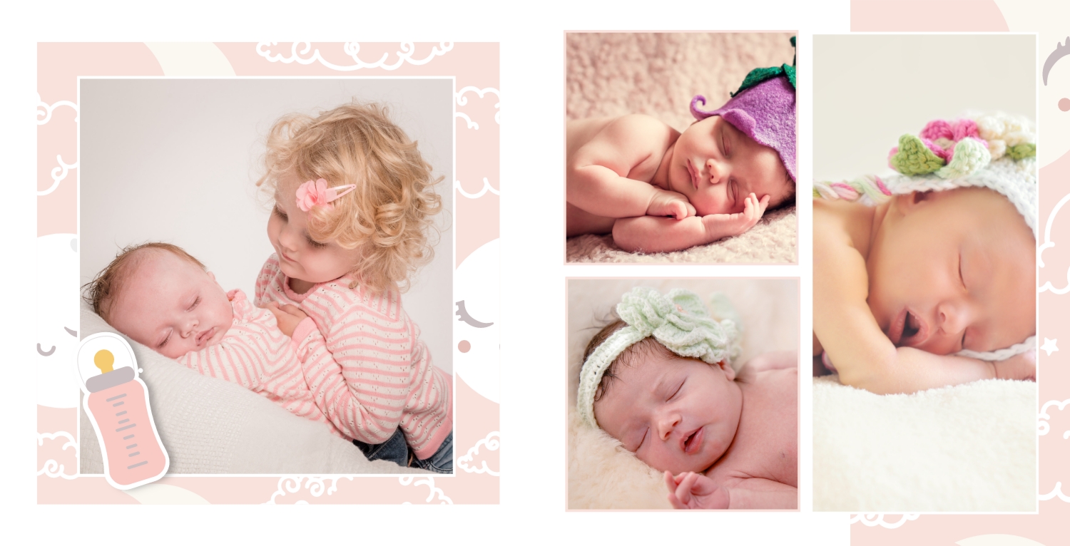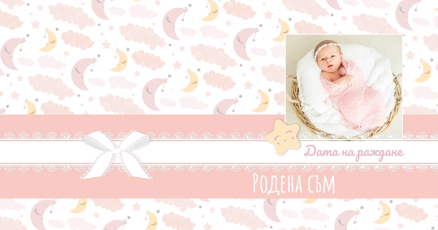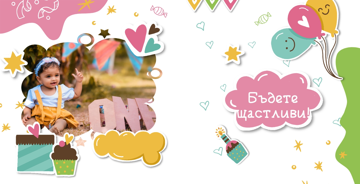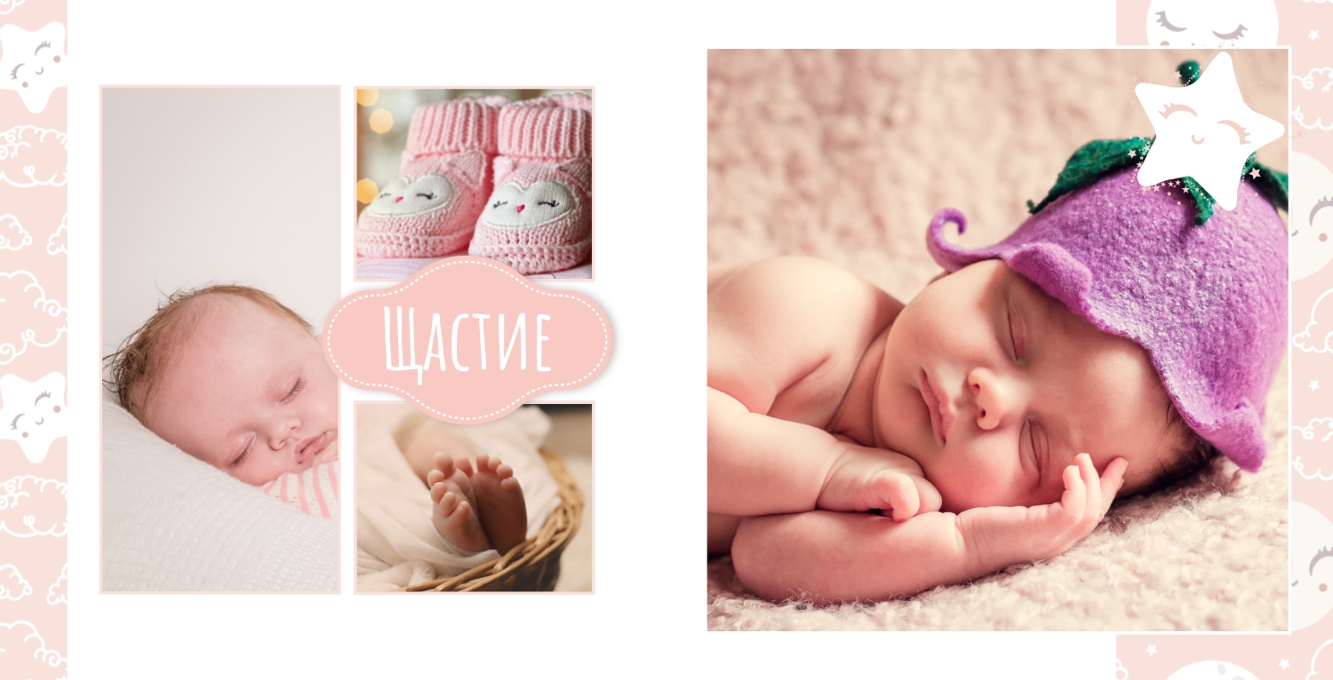 Безплатен шаблон за детска фотокнига от раждането до годината за момиче. Създайте оформление със собствените си ръце в онлайн конструктора на фотокниги.