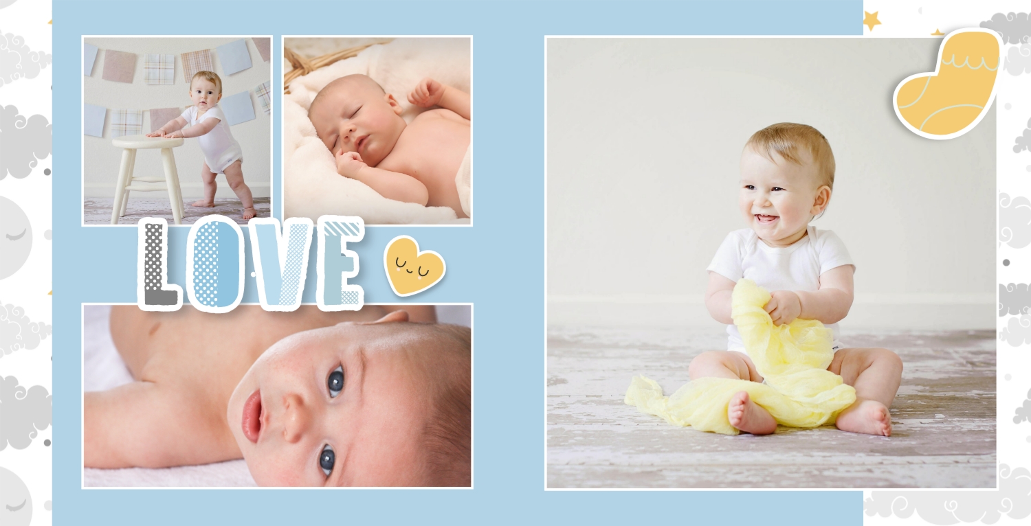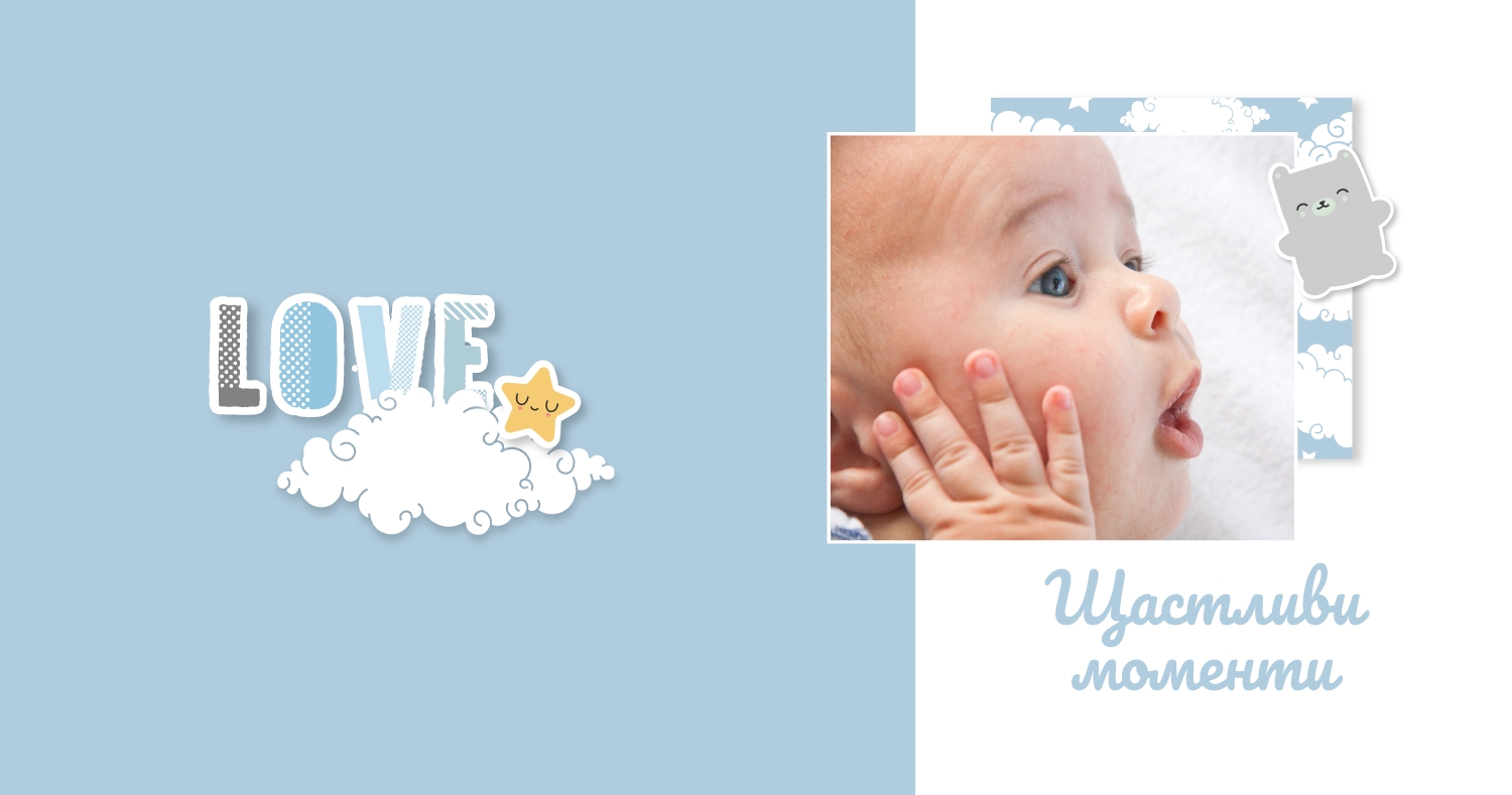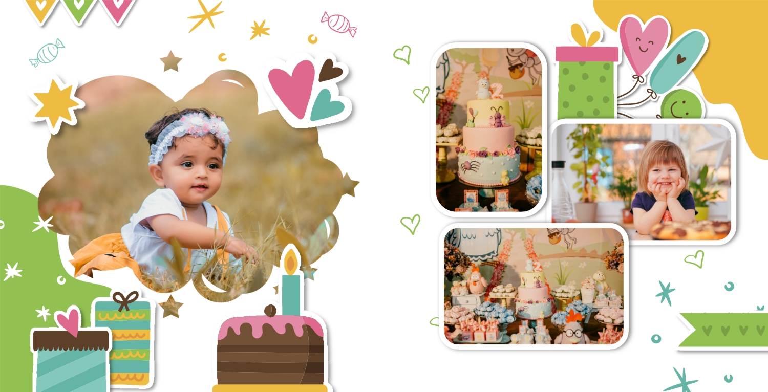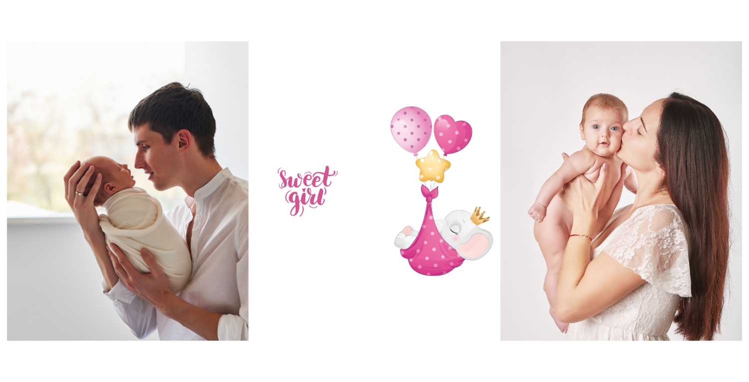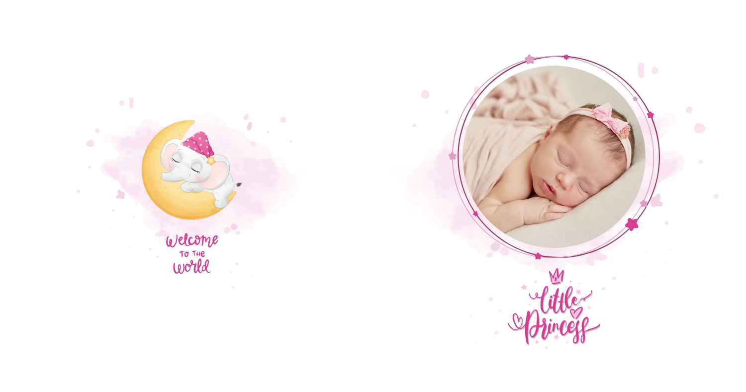 Безплатен шаблон за детска фотокнига от раждането до годината за момиче. Създайте оформление със собствените си ръце в онлайн конструктора на фотокниги.