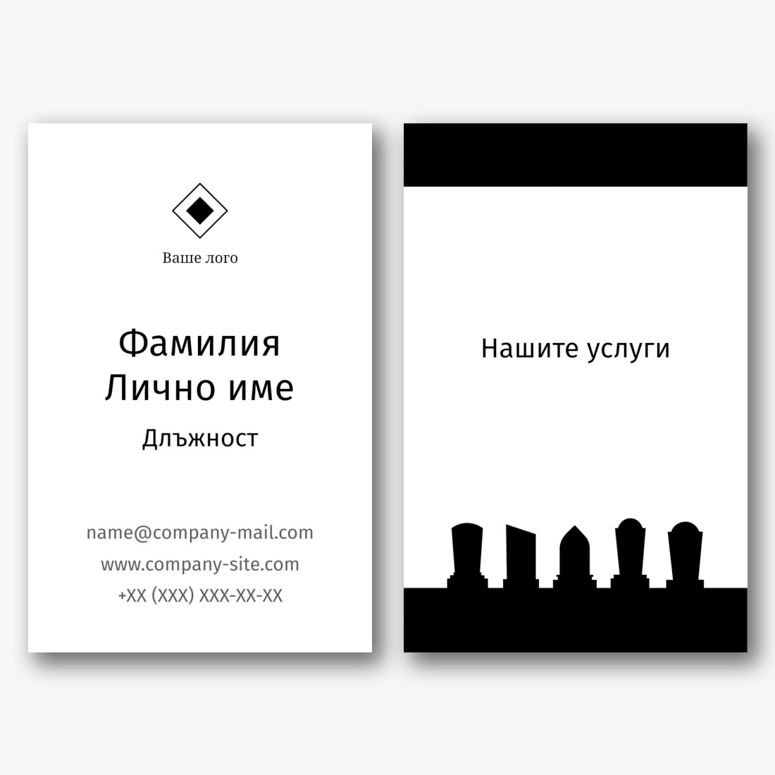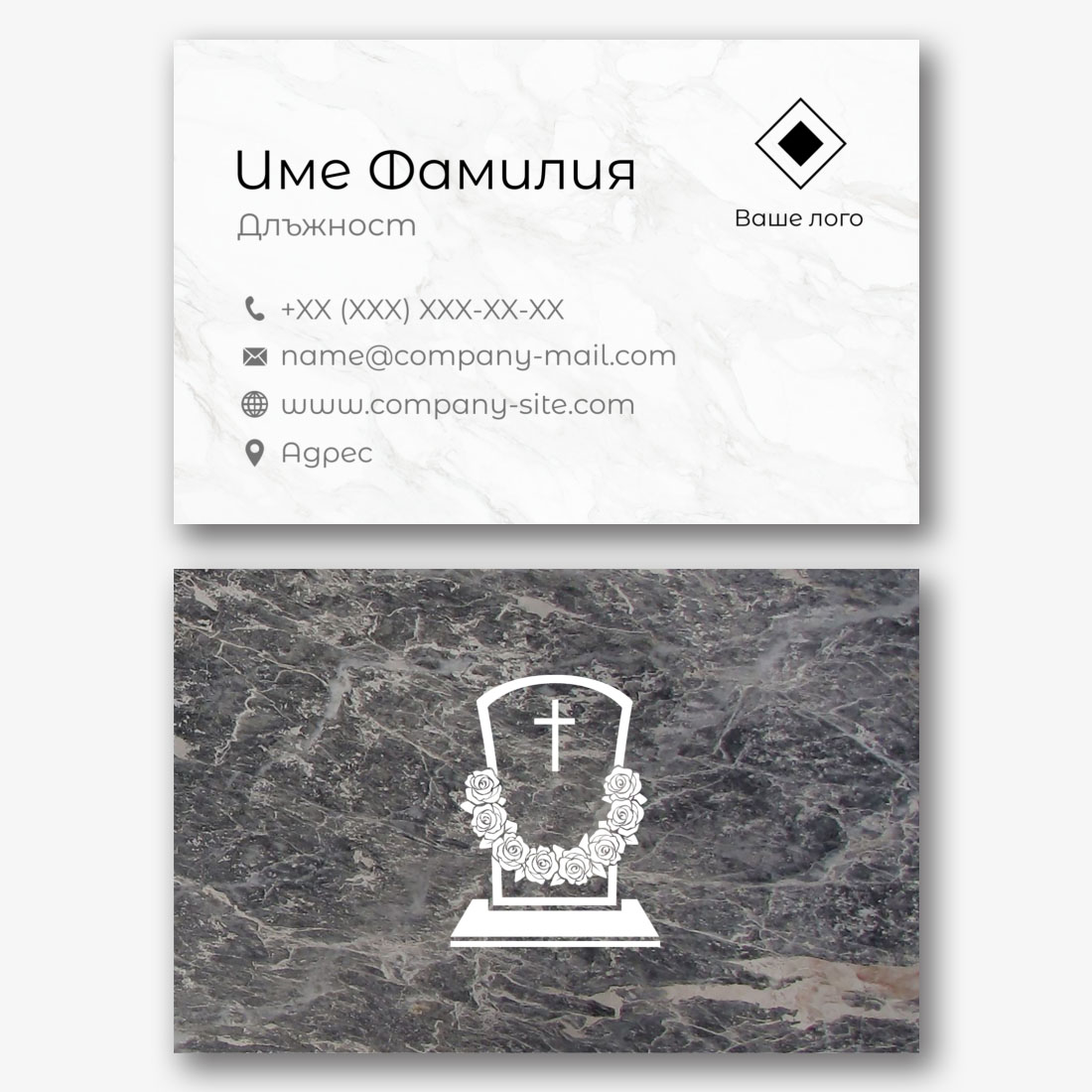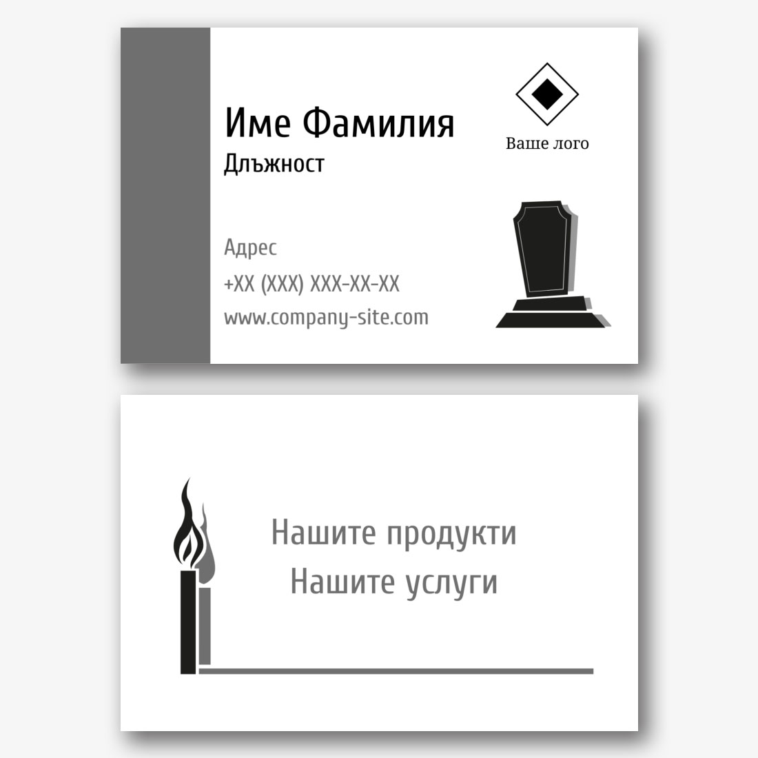 Безплатен шаблон за визитка на погребален дом, ритуални услуги, за производители на надгробни паметници. Създайте оформление със собствените си ръце в дизайнера на визитки.