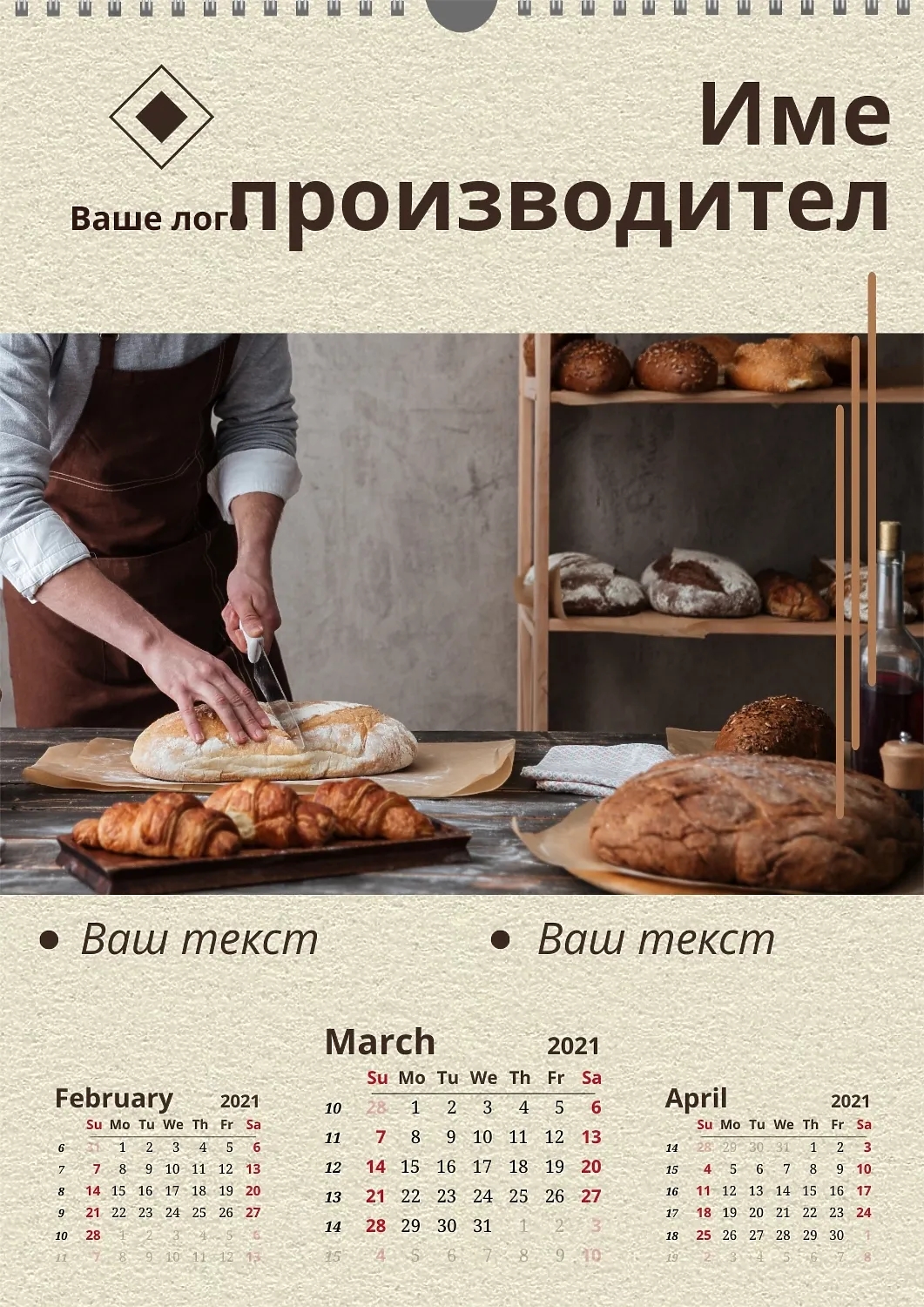 Безплатен шаблон за стенен календар за реклама на Сладкарница, Пекарна, кулинарни курсове. Създайте оформление "направи си сам" в онлайн конструктора на календари.