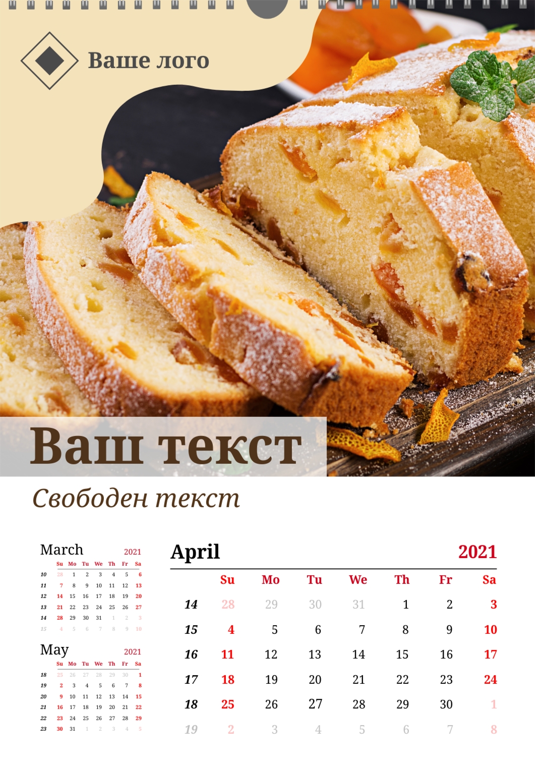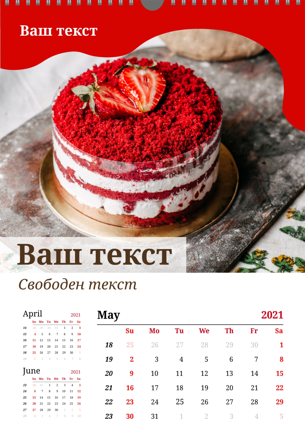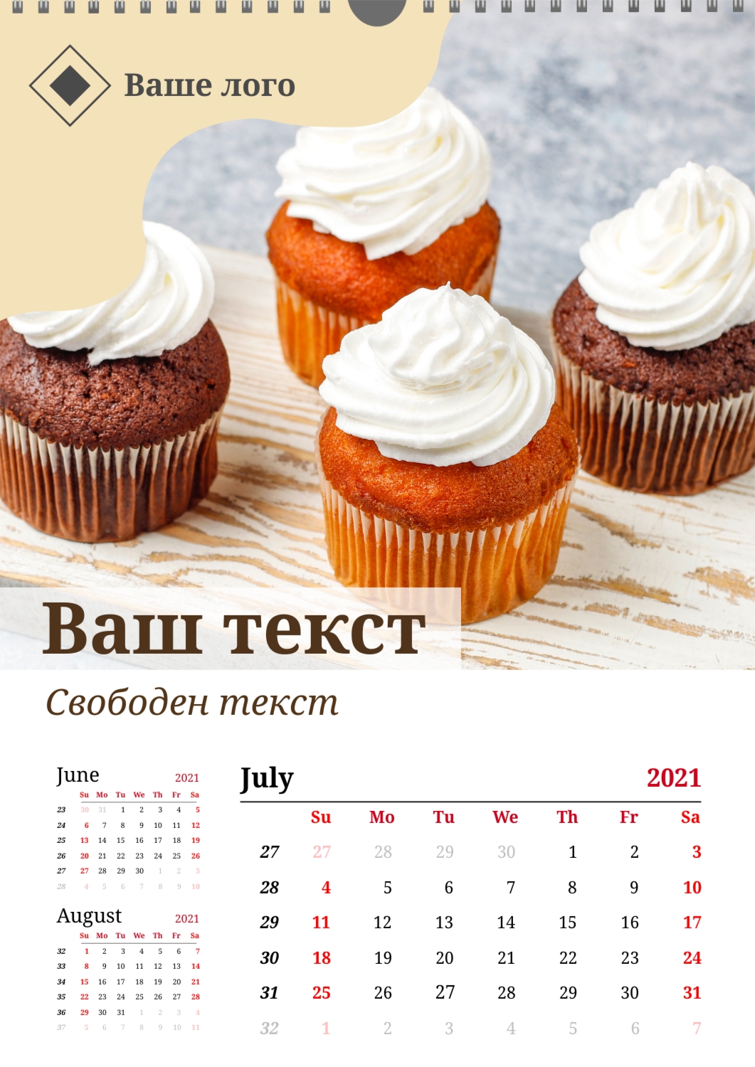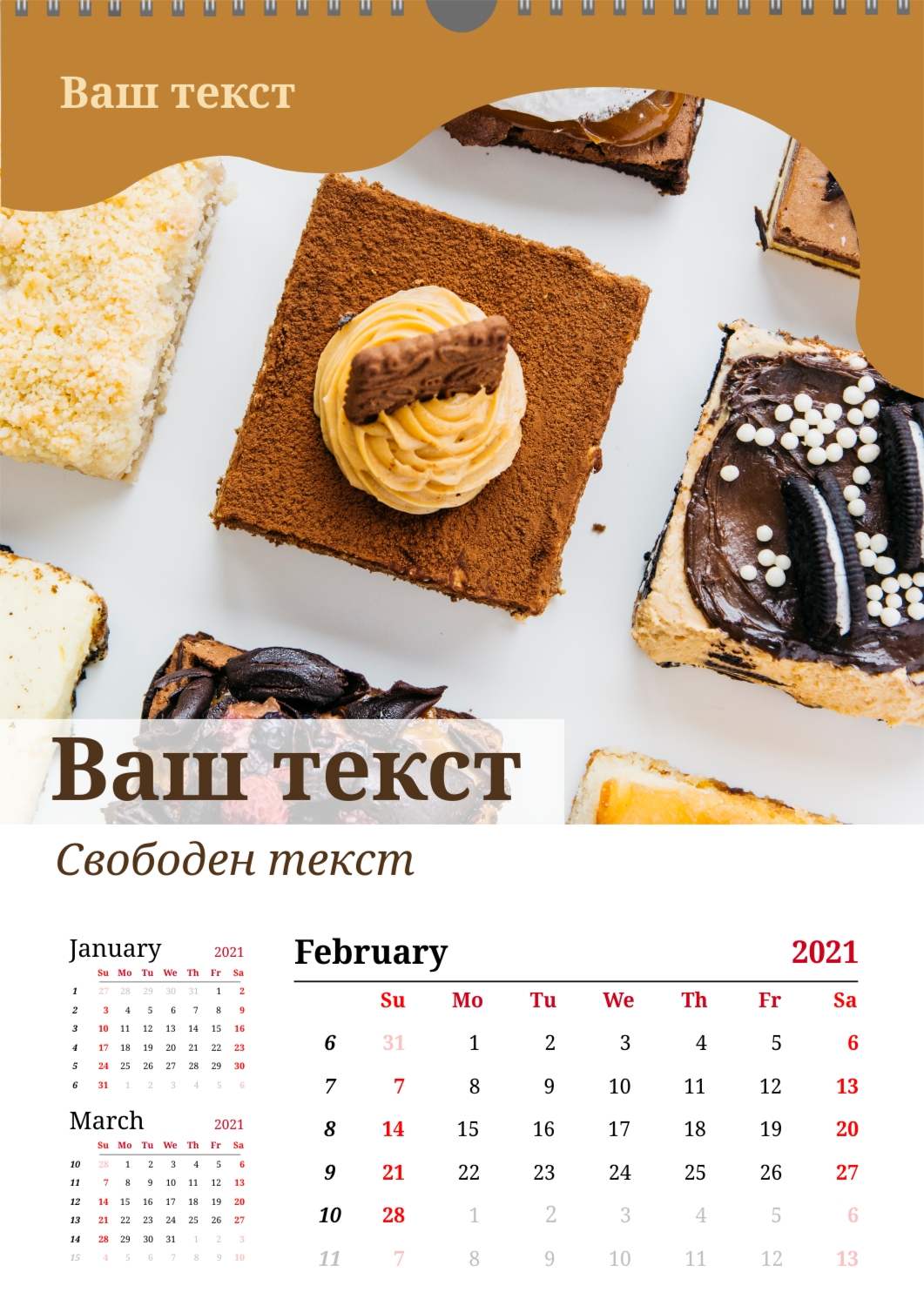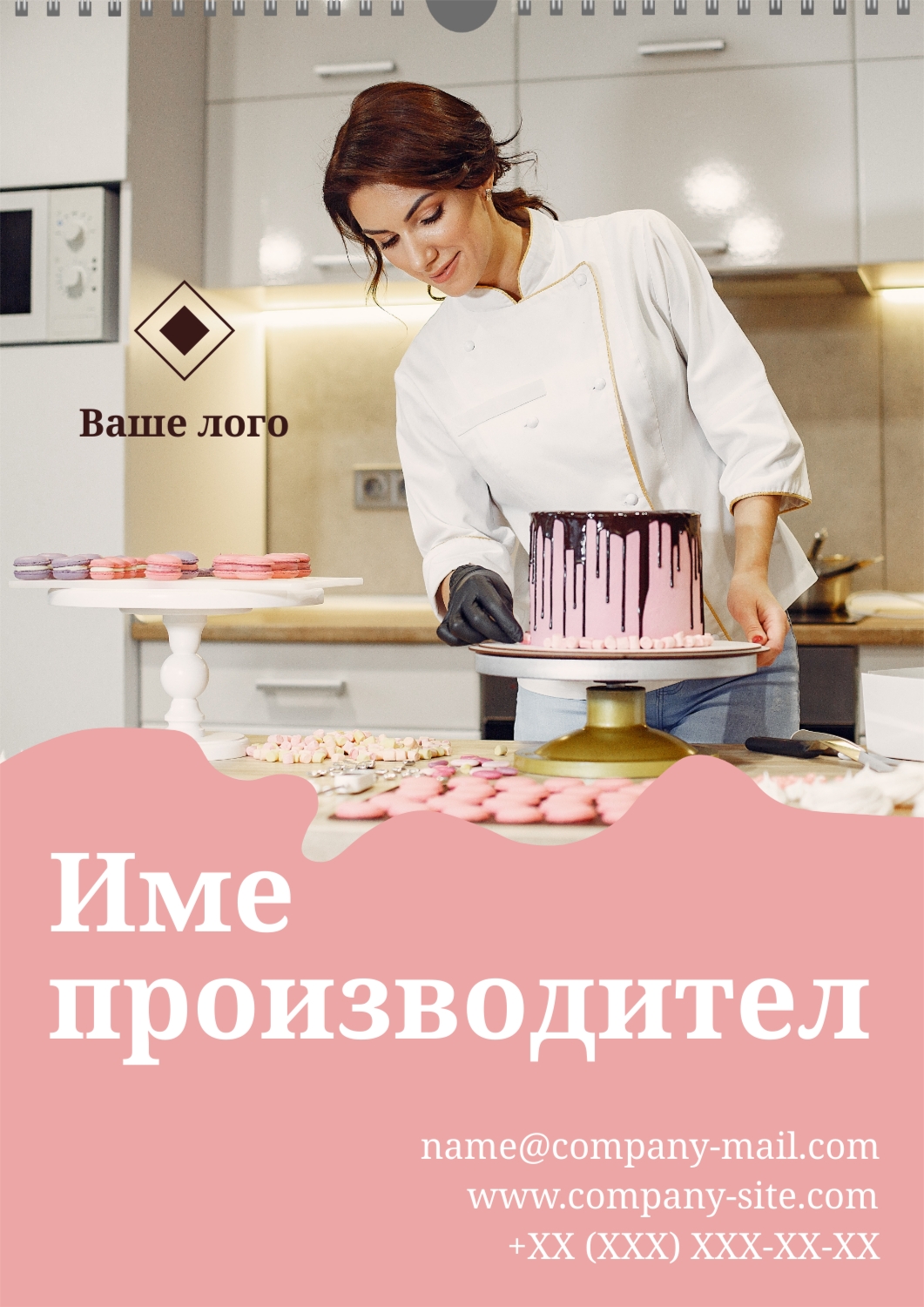Безплатен шаблон за стенен календар за реклама на Сладкарница, Пекарна, Магазин за сладкиши. Създайте оформление "направи си сам" в онлайн конструктора на календари.
