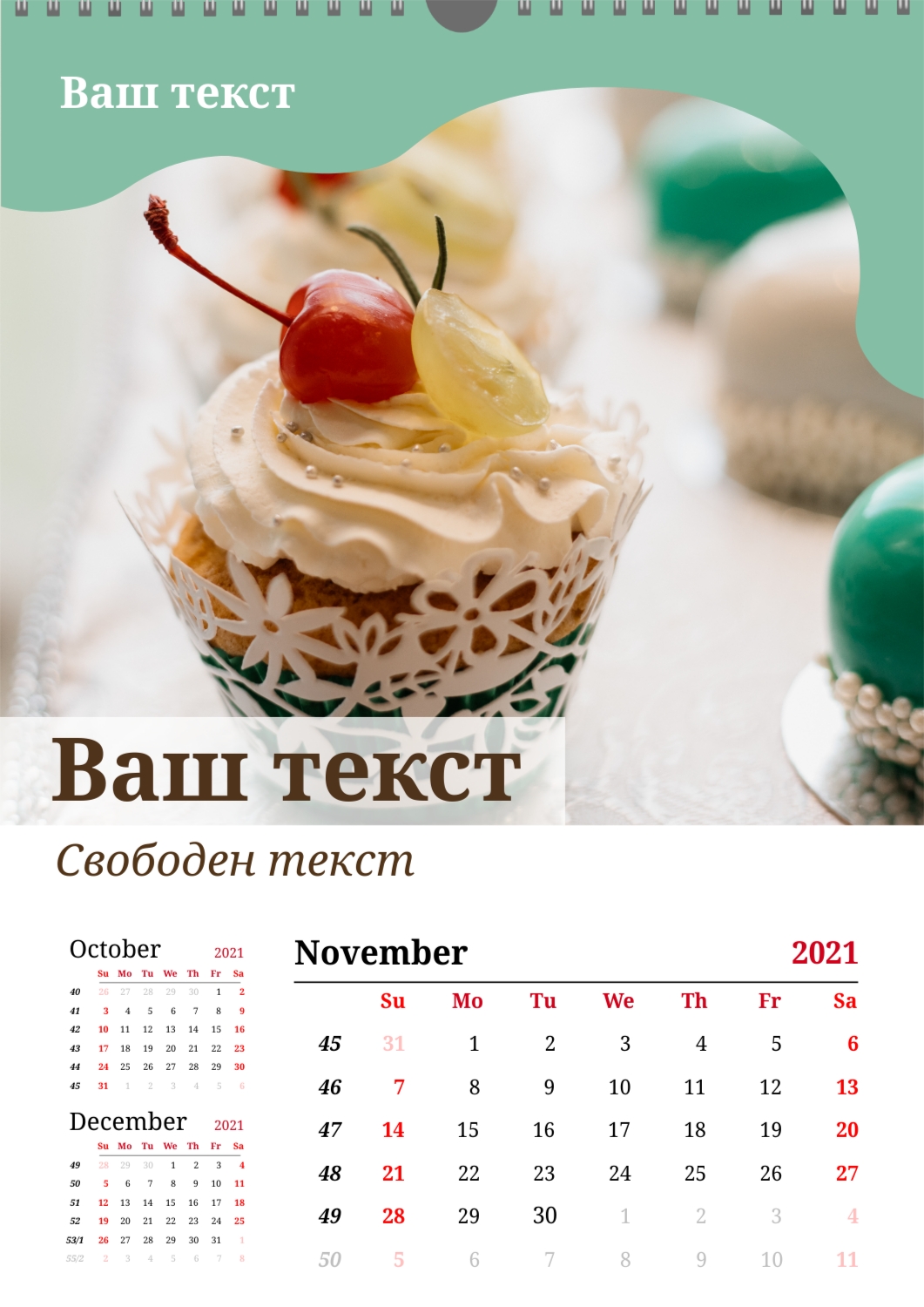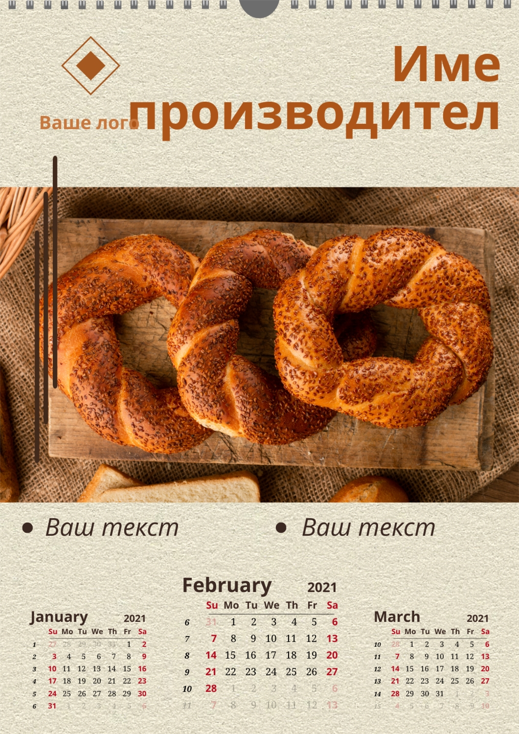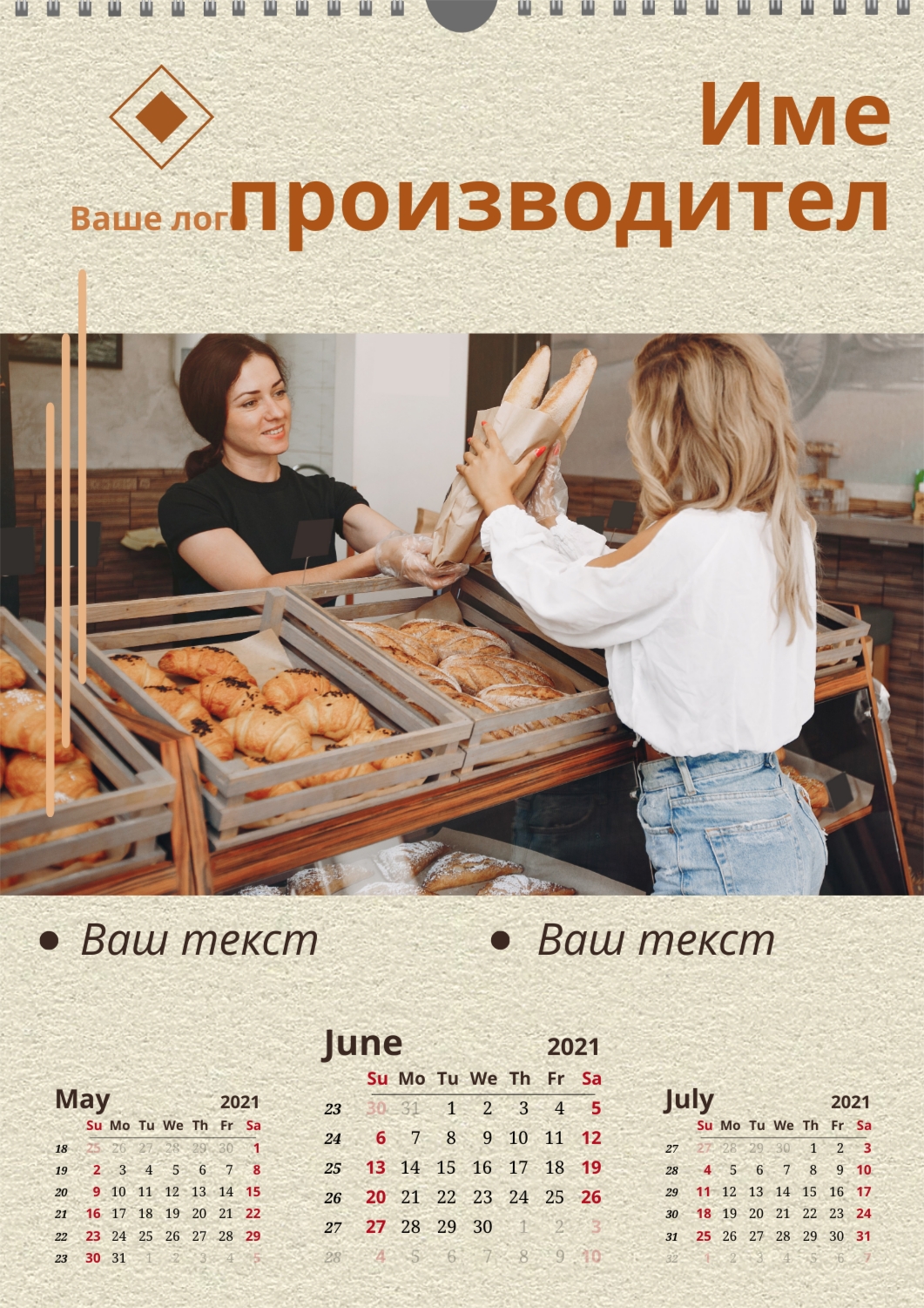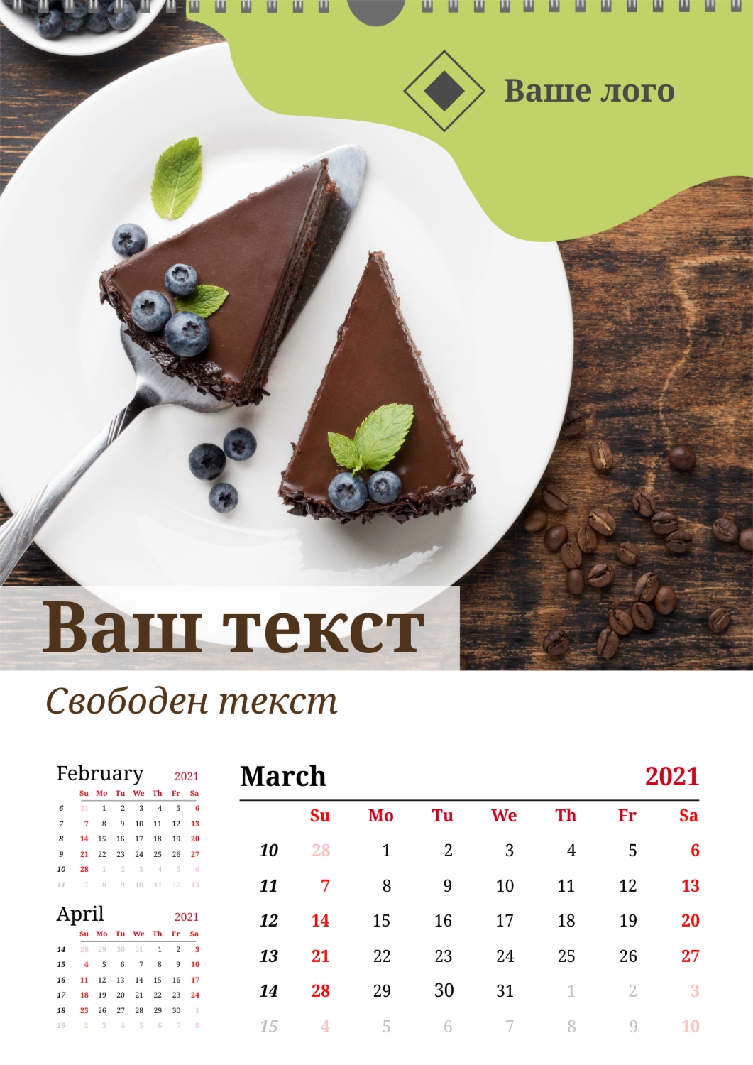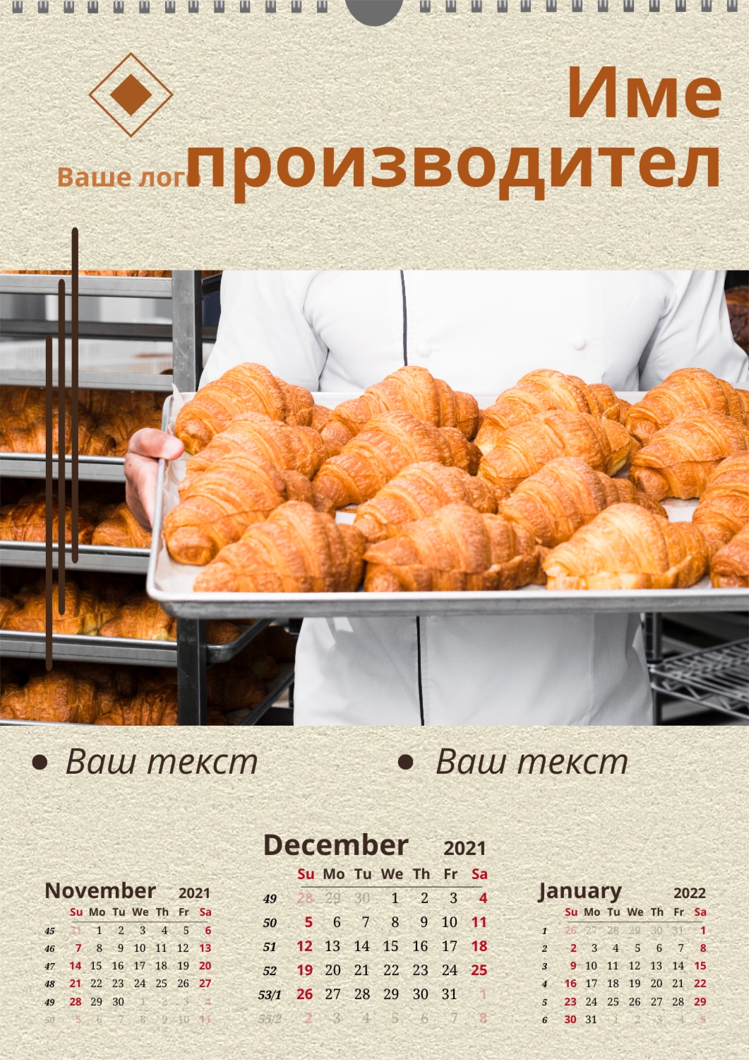 Безплатен шаблон за стенен календар за реклама на Сладкарница, Пекарна, Магазин за сладкиши. Създайте оформление "направи си сам" в онлайн конструктора на календари.