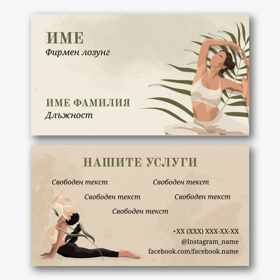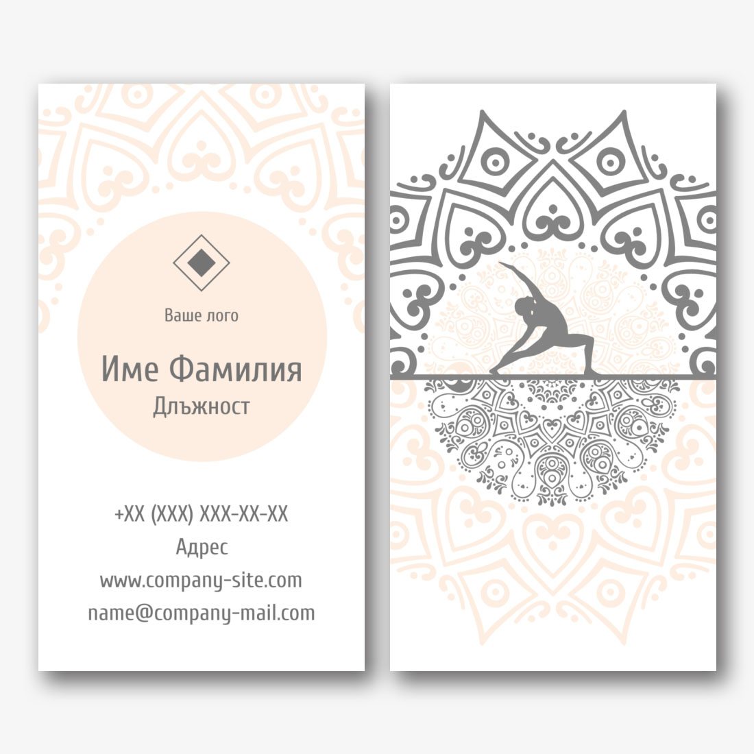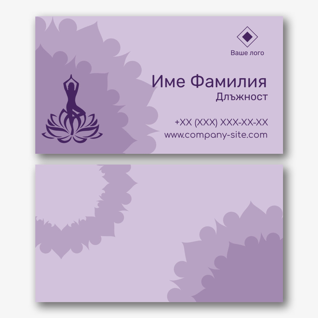 Безплатен шаблон за визитка на учител по йога, студио за йога и медитация. Създайте оформление със собствените си ръце в дизайнера на визитки.