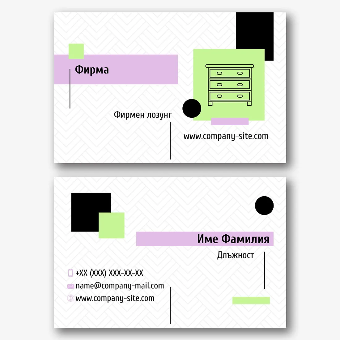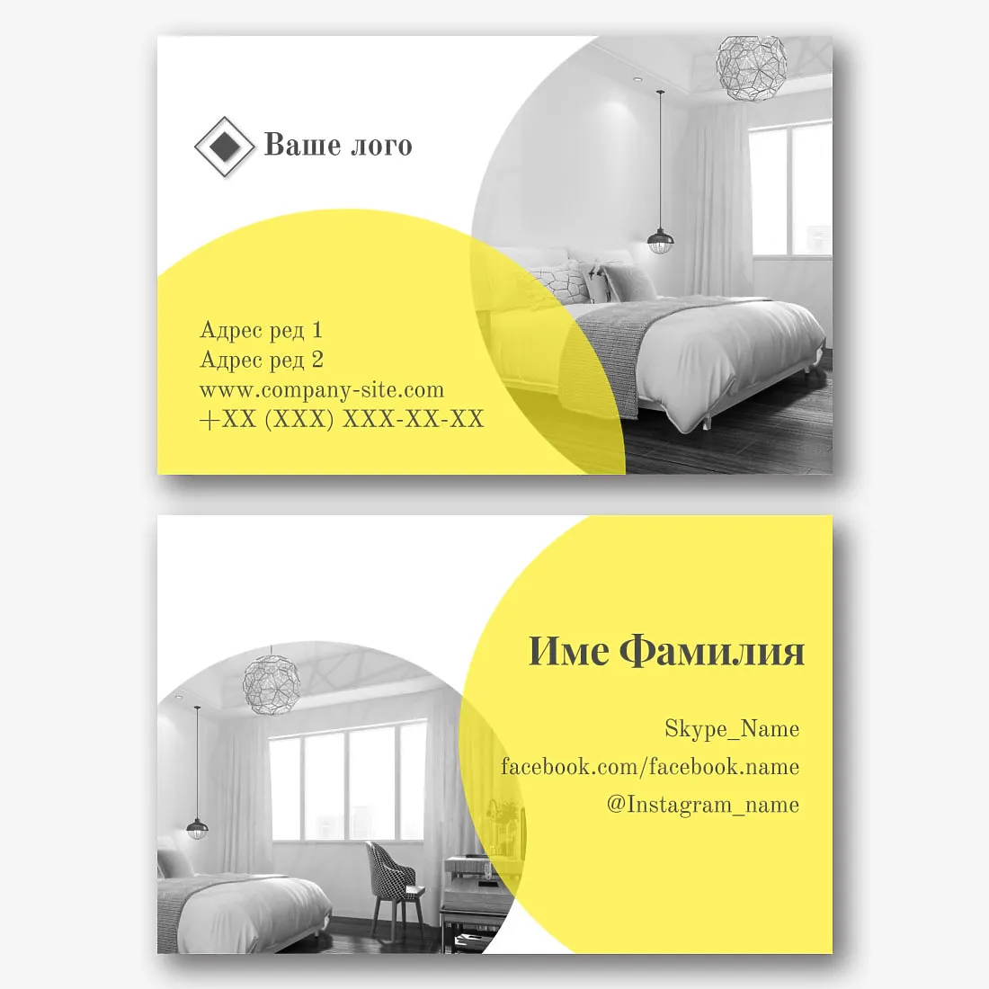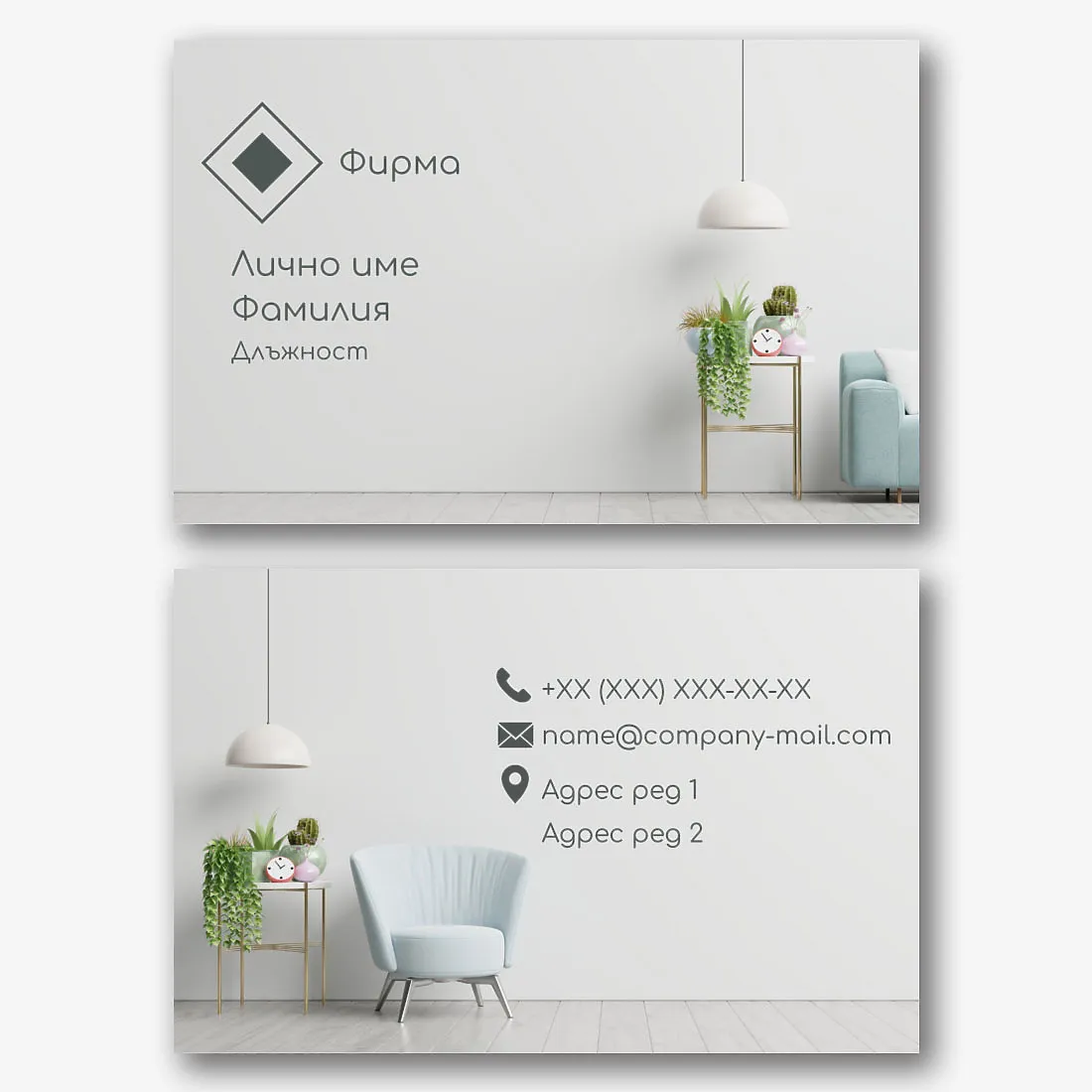 Безплатен шаблон за визитка на интериорен дизайнер, дизайнерска агенция, дизайнери. Създайте оформление със собствените си ръце в дизайнера на визитки.
