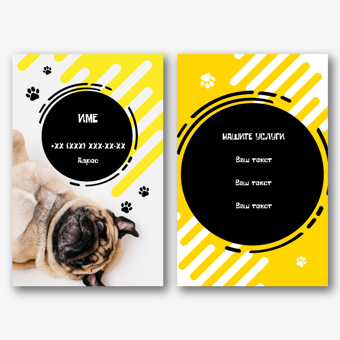Безплатен шаблон за визитка за ветеринарна клиника, ветеринарни лекари, приют за животни. Създайте оформление със собствените си ръце в дизайнера на визитки.