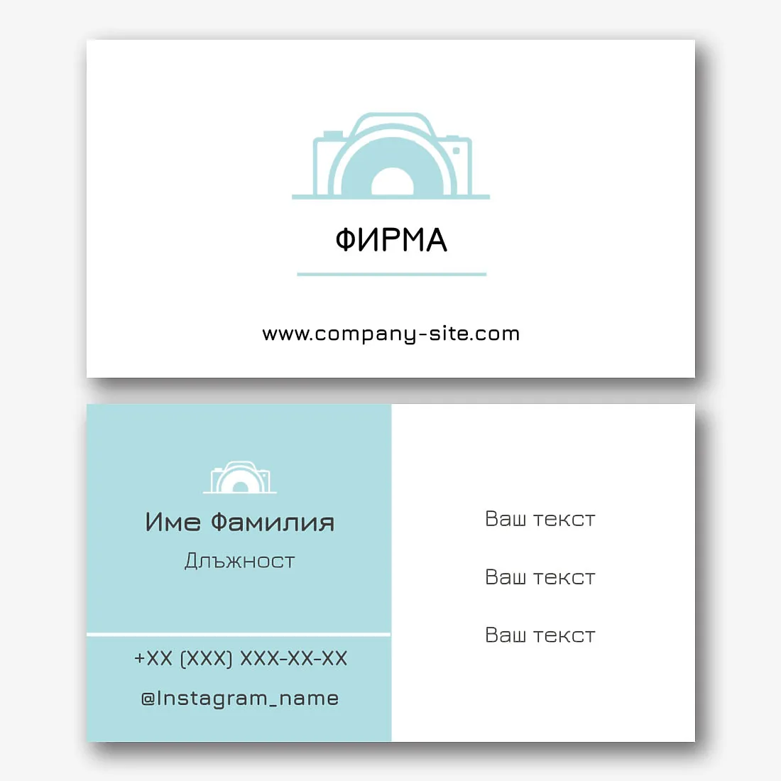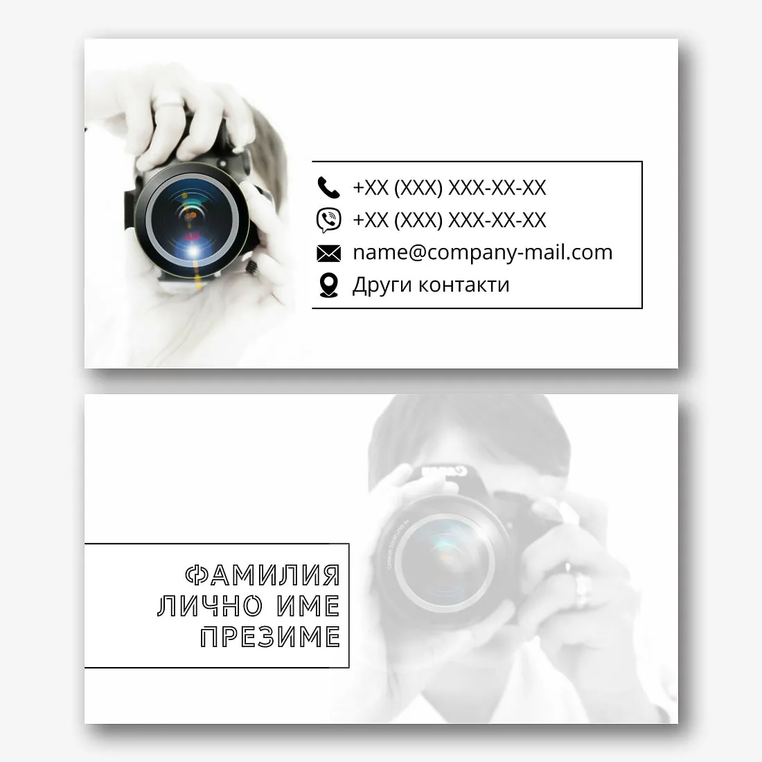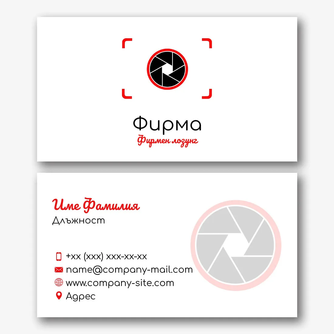 Безплатен шаблон за визитка за фотомагазин, фото студия, фотографи. Създайте оформление със собствените си ръце в дизайнера на визитки.