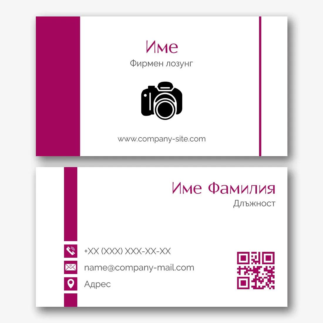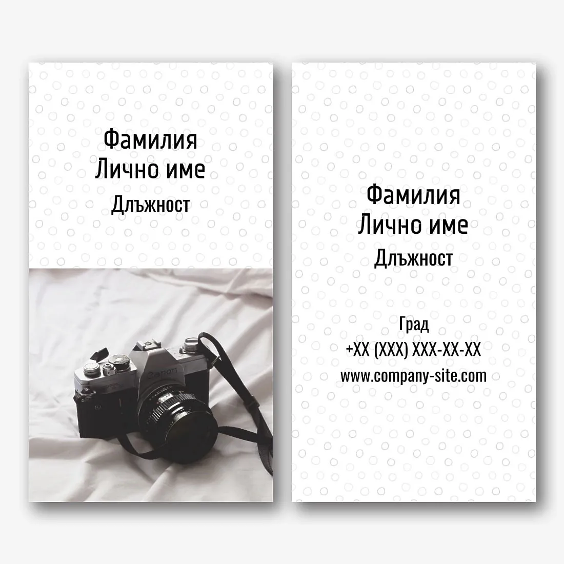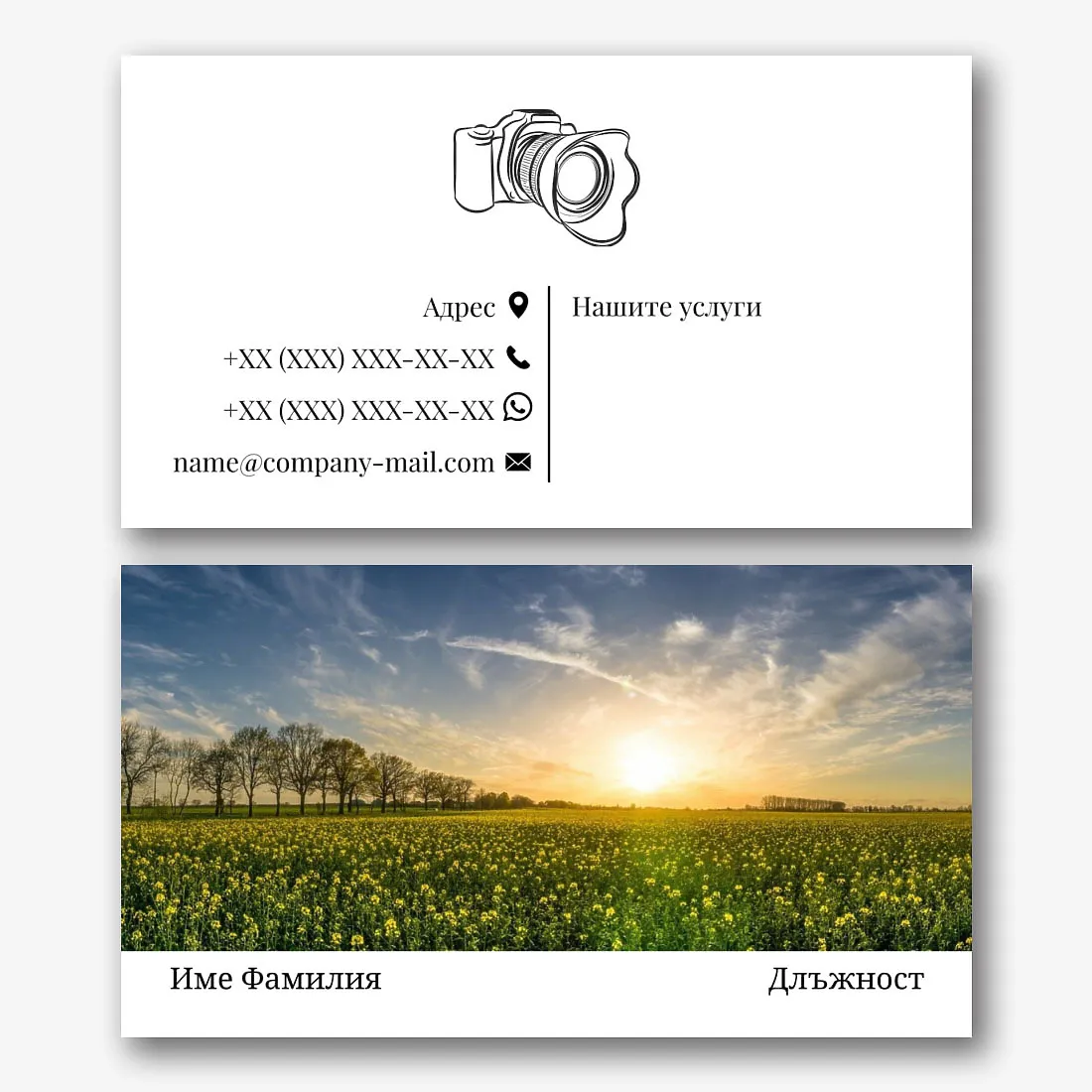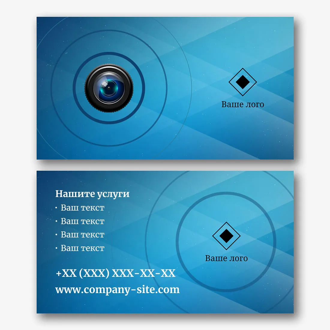 Безплатен шаблон за визитка за фотомагазин, фото студия, фотографи. Създайте оформление със собствените си ръце в дизайнера на визитки.