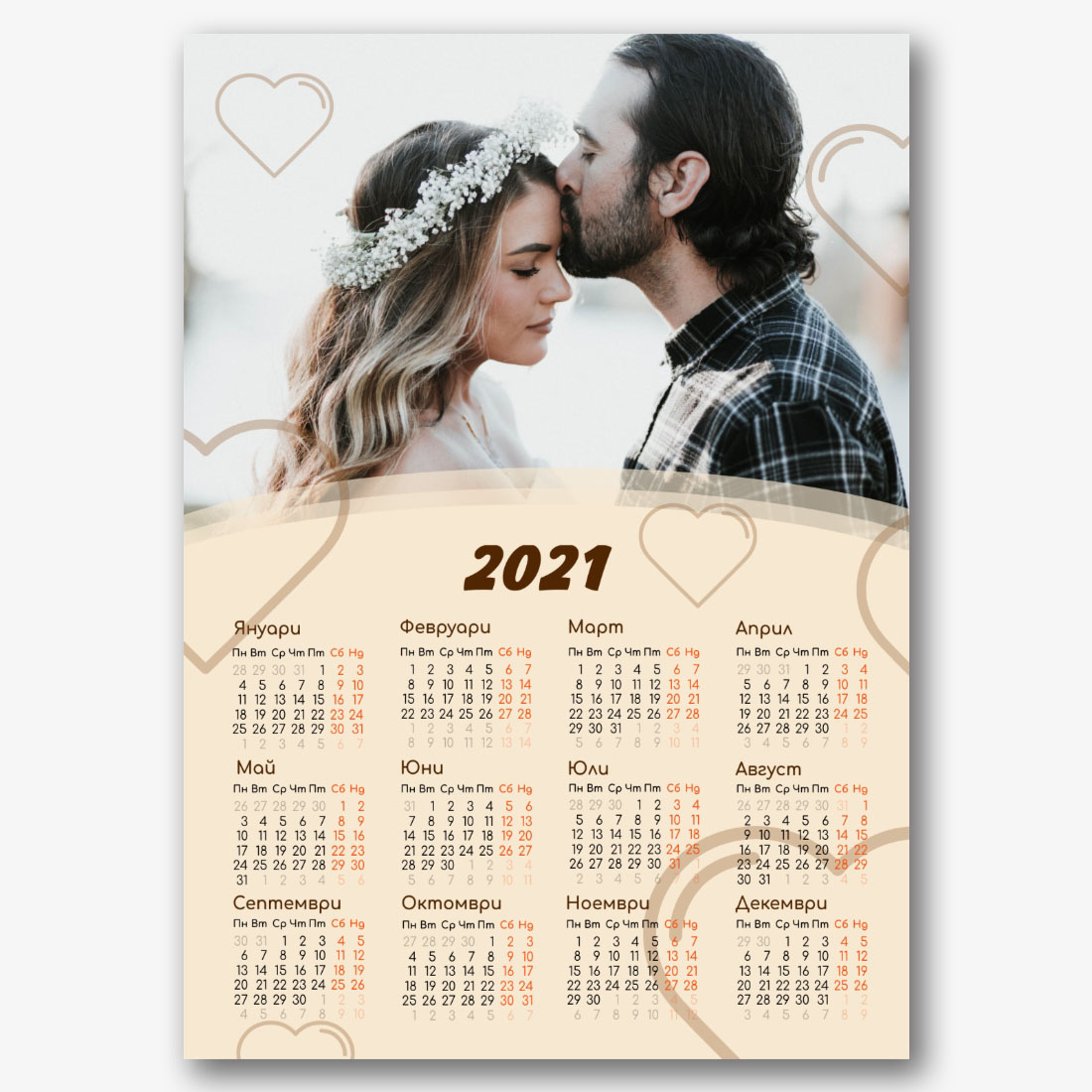Безплатен шаблон за сватбен календар онлайн за сватбена агенция, Сватбен фотограф. Създайте оформление със собствените си ръце в конструктора на календари.