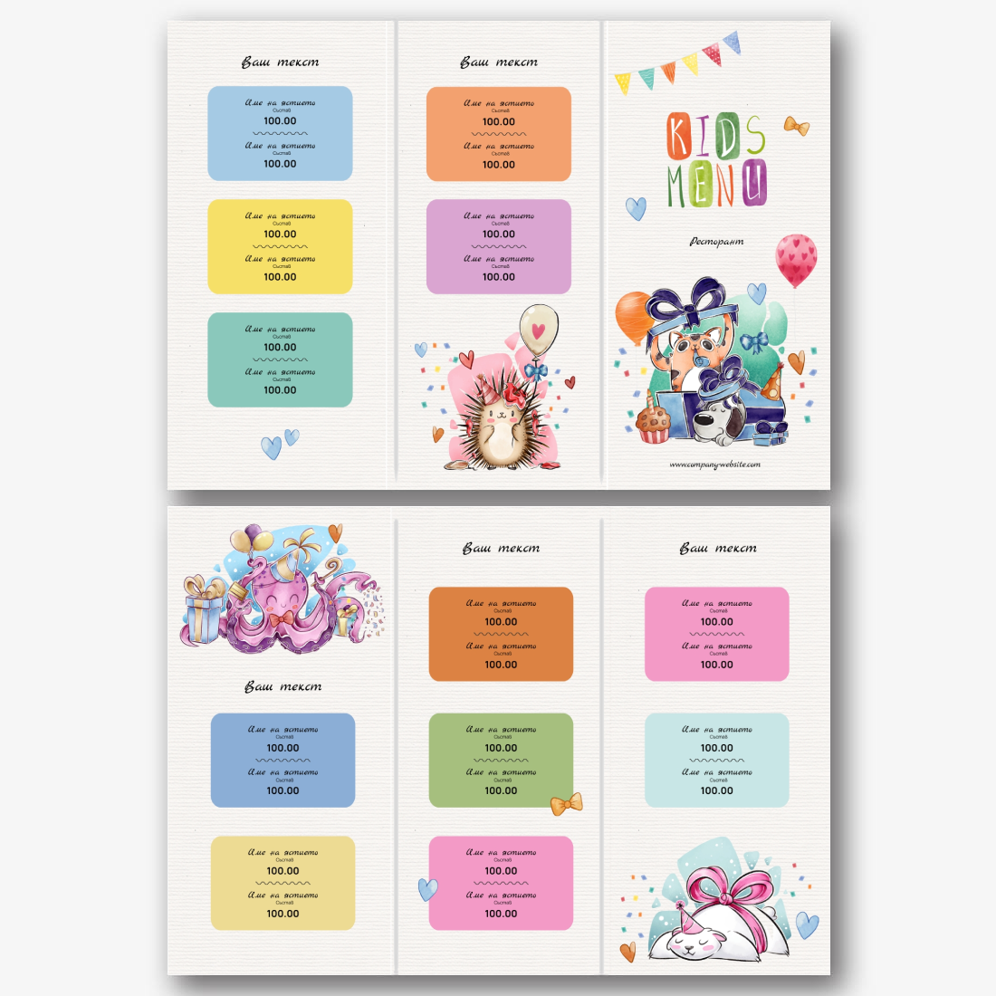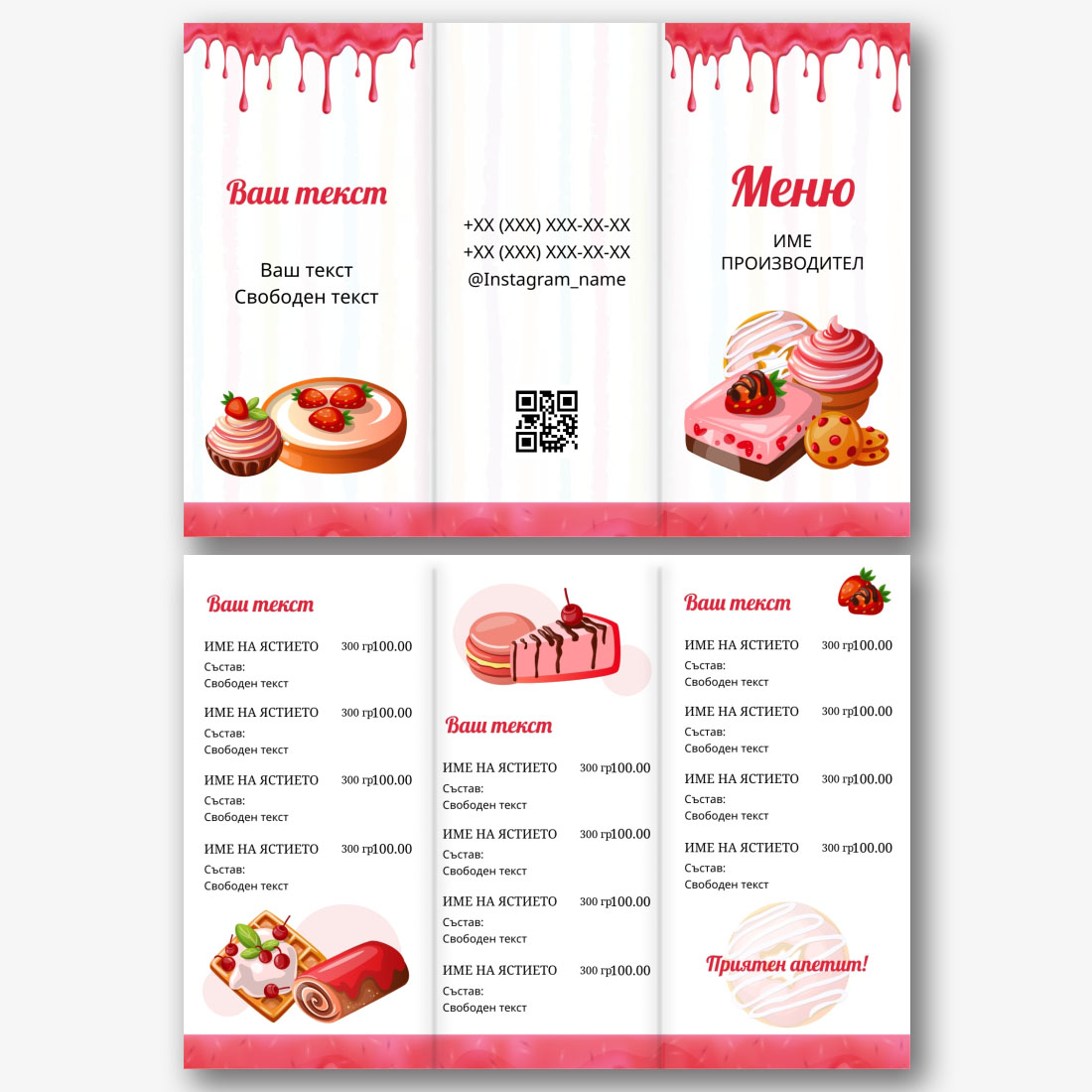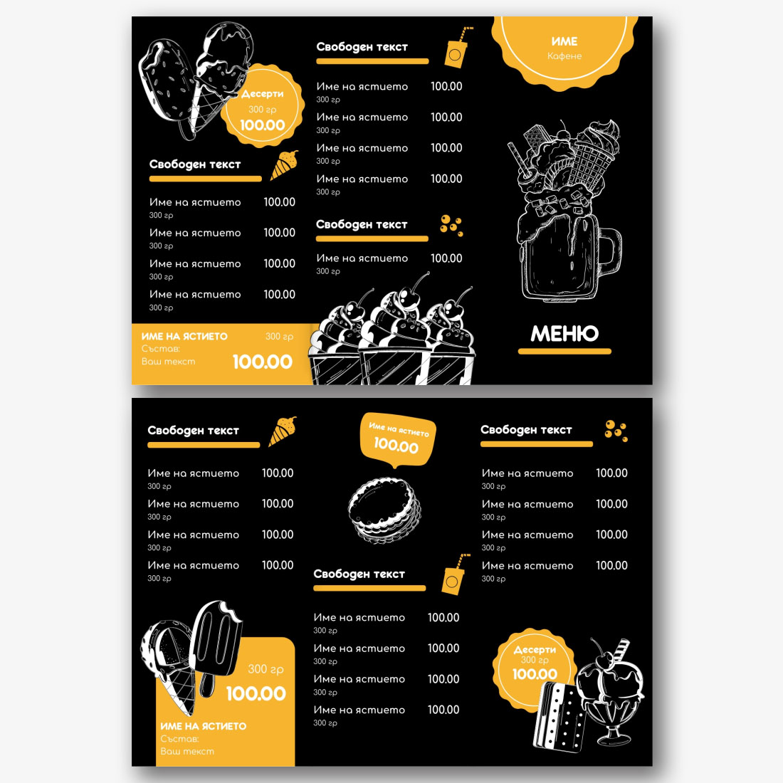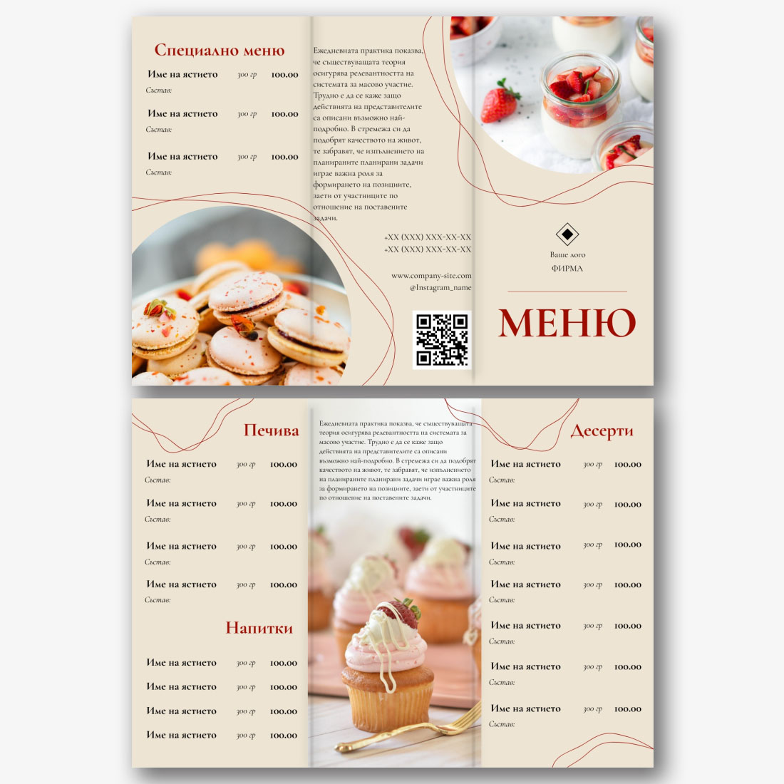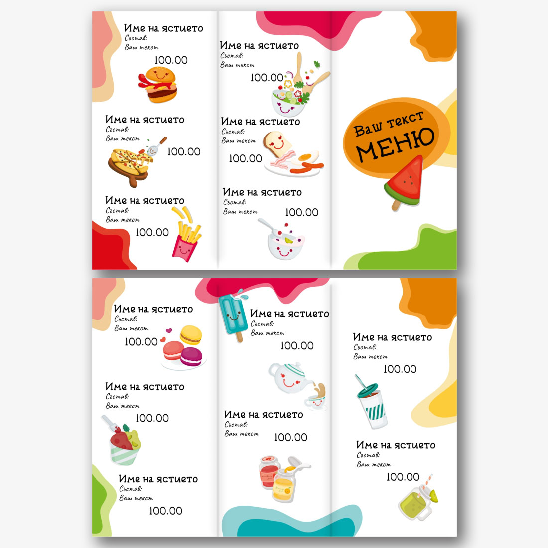 Безплатен шаблон за меню за Кафене, Ресторант, детско кафене. Създайте оформление със собствените си ръце в онлайн конструктора на менюта.