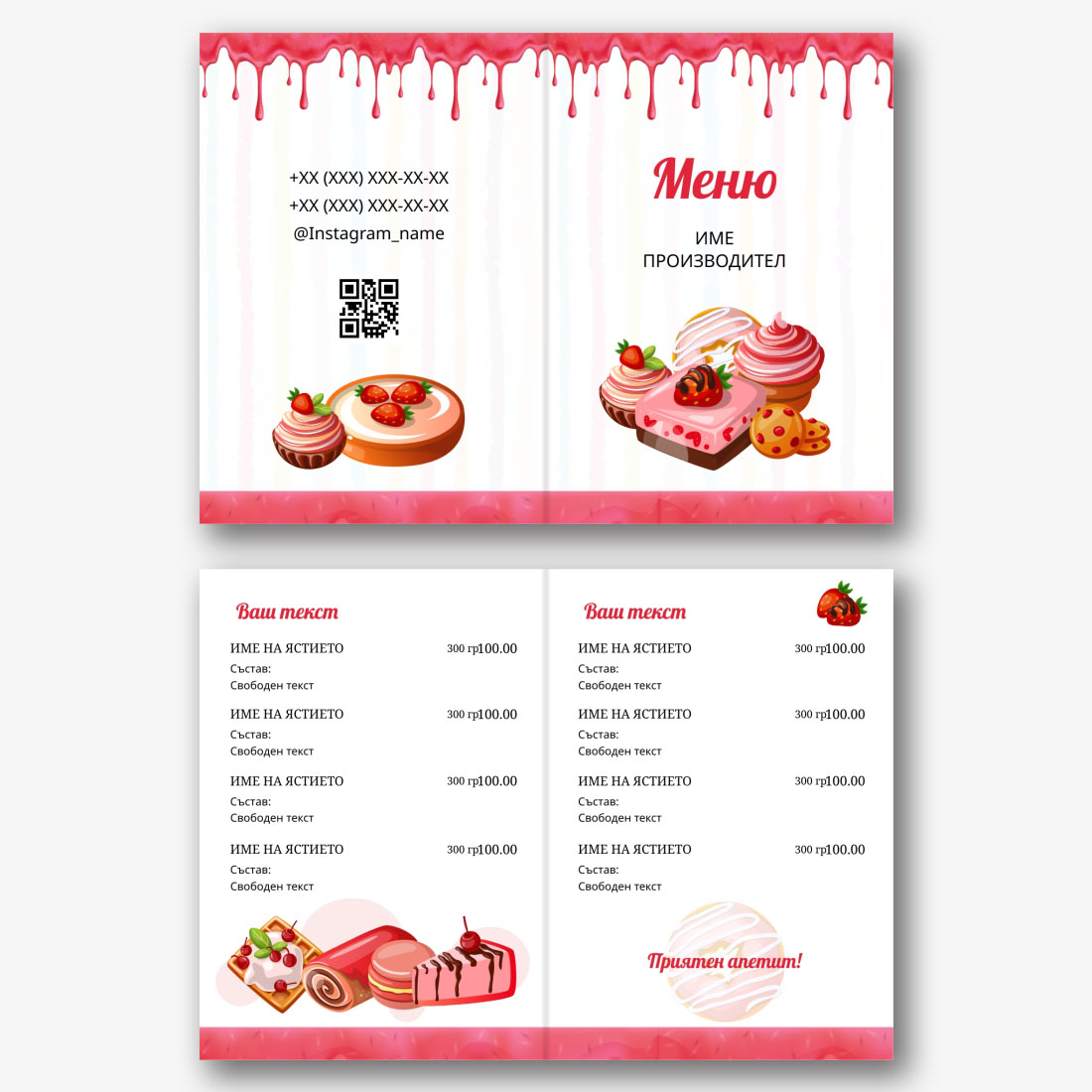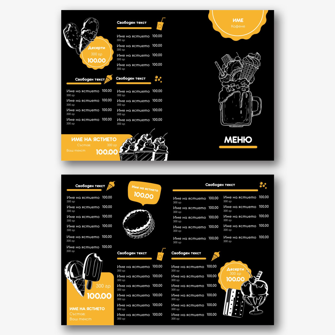 Безплатен шаблон за меню за Кафене, Ресторант, детско кафене. Създайте оформление със собствените си ръце в онлайн конструктора на менюта.