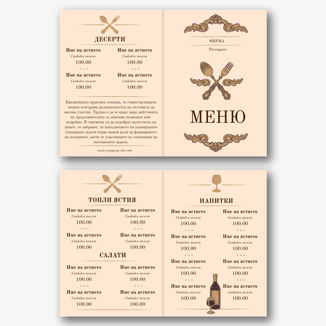 Безплатен шаблон за меню за ресторант за бързо хранене, кафене, трапезария. Създайте оформление със собствените си ръце в онлайн конструктора на менюта.
