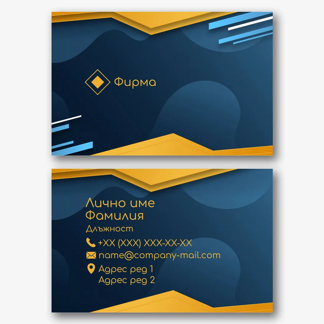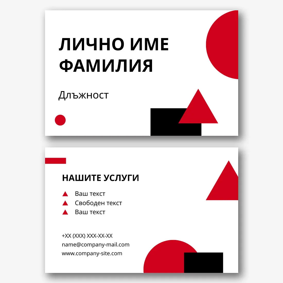 Безплатен шаблон за абстрактна евро визитка с триъгълници за представители на организации, предприемачи, доставчици на услуги. Създайте оформление на визитка със собствените си ръце в онлайн конструктора на визитки.