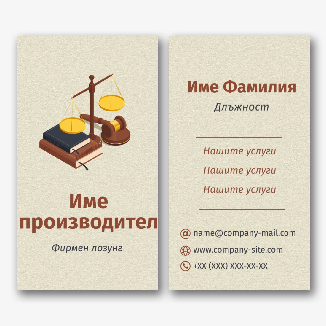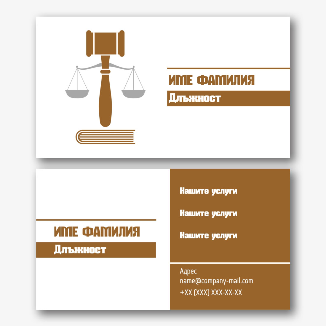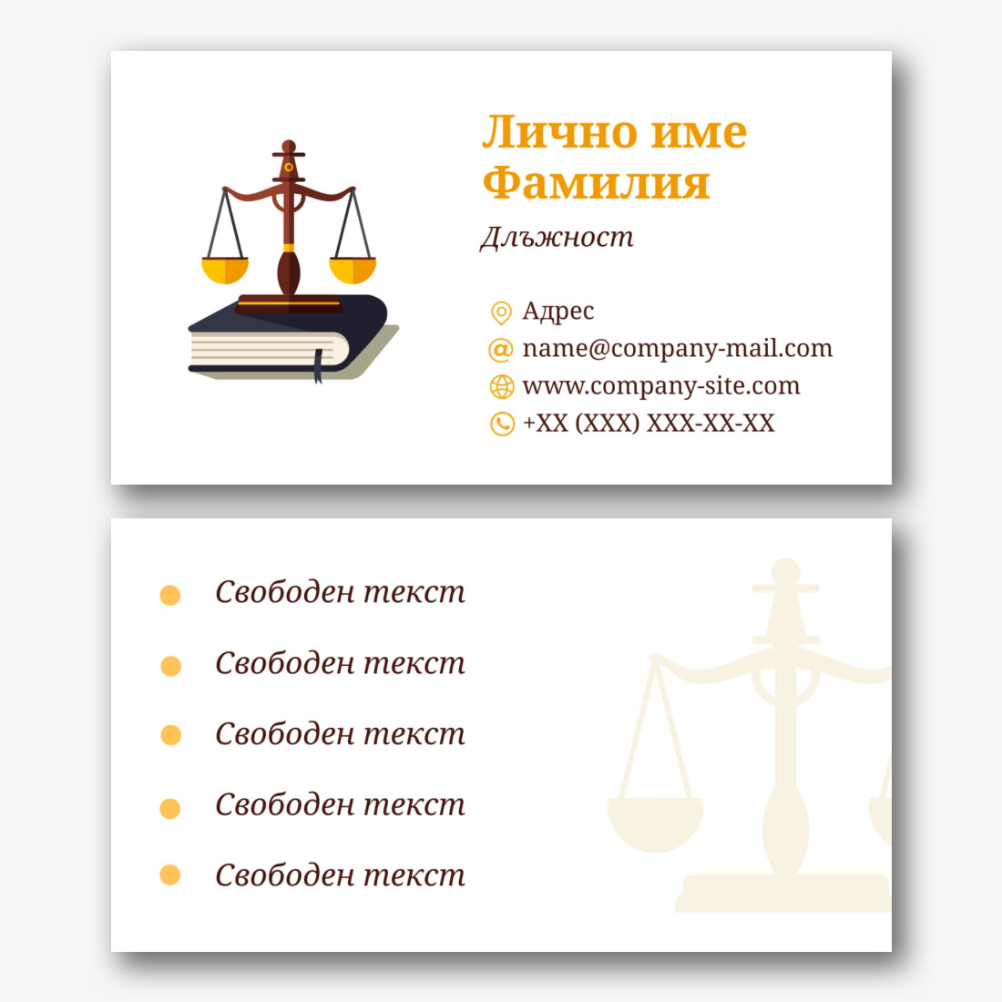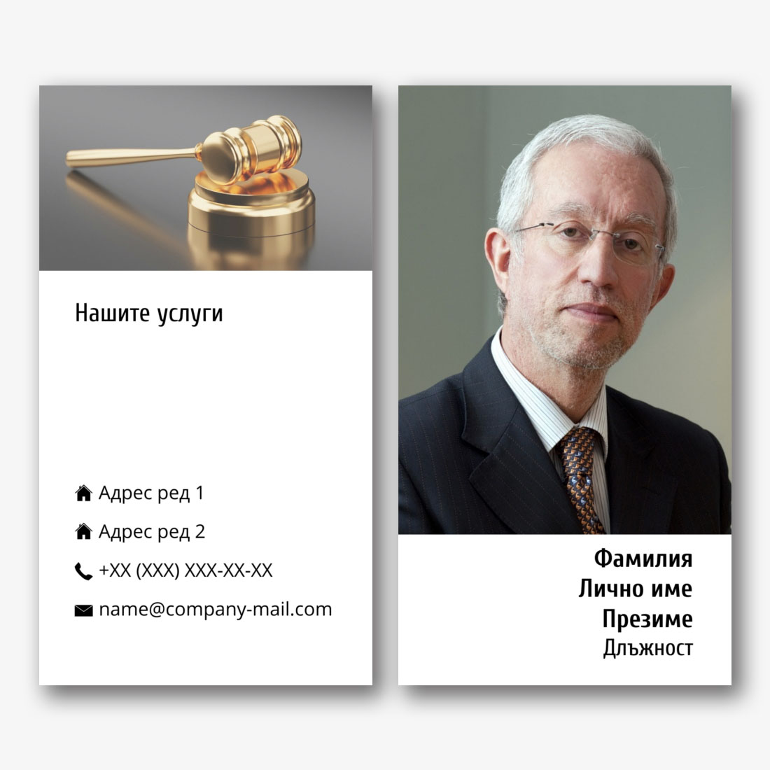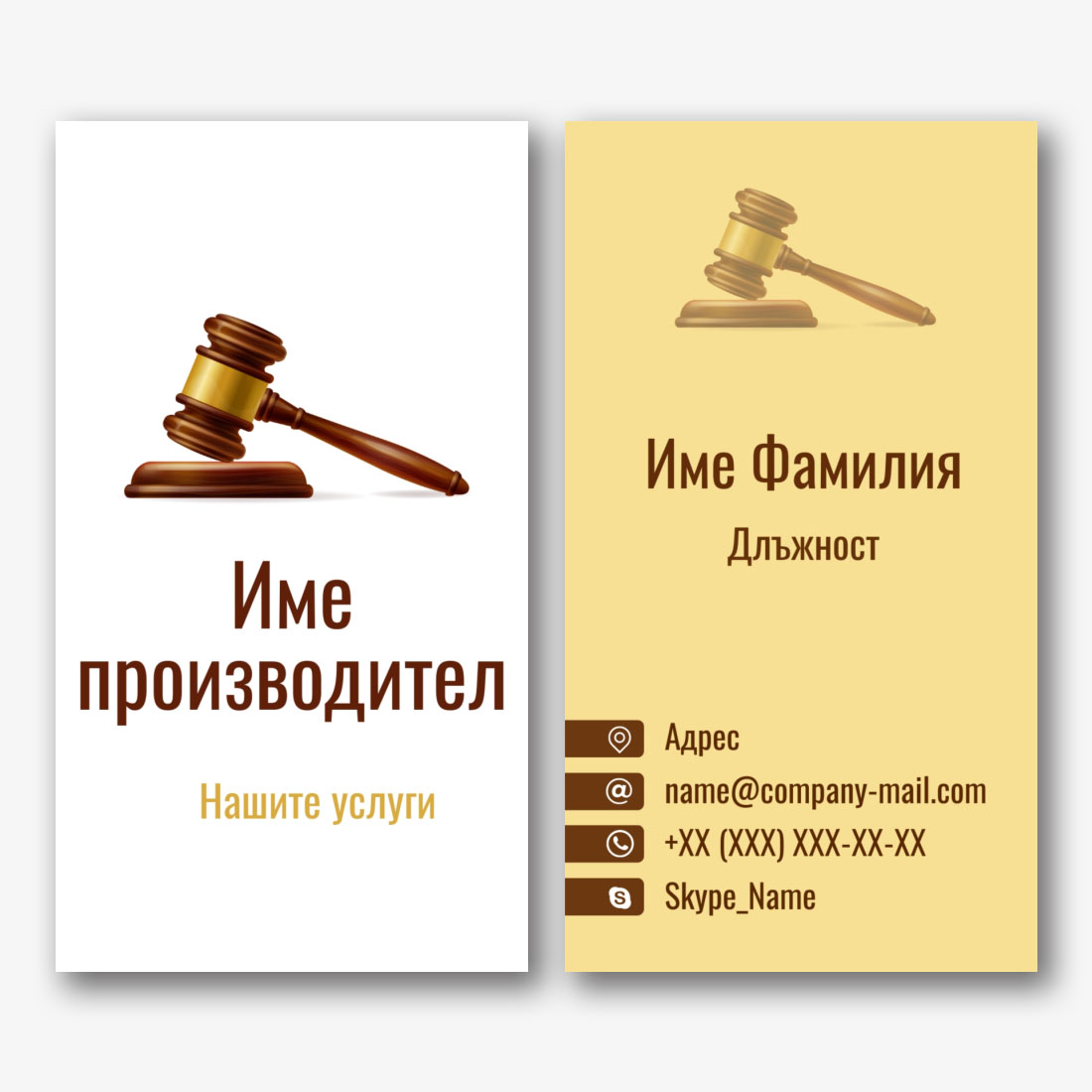 Шаблонът за визитка за адвокатска кантора, съдия, адвокат и адвокат е едно гише за всеки, който се занимава с правна дейност. Синият цвят обикновено се свързва с надеждност и професионализъм, така че е чудесен за правни визитки. Изображението на чук на съдия е класически символ на справедливостта и е чудесно за правна визитка. Използвайки шаблона в онлайн дизайнера, можете да създадете своя собствена визитка със собствените си ръце, като изберете подходящия цвят и шрифт, като добавите необходимите елементи и логото на компанията. След това остава само да отпечатате визитката и да започнете да я използвате за популяризиране на вашите дейности.