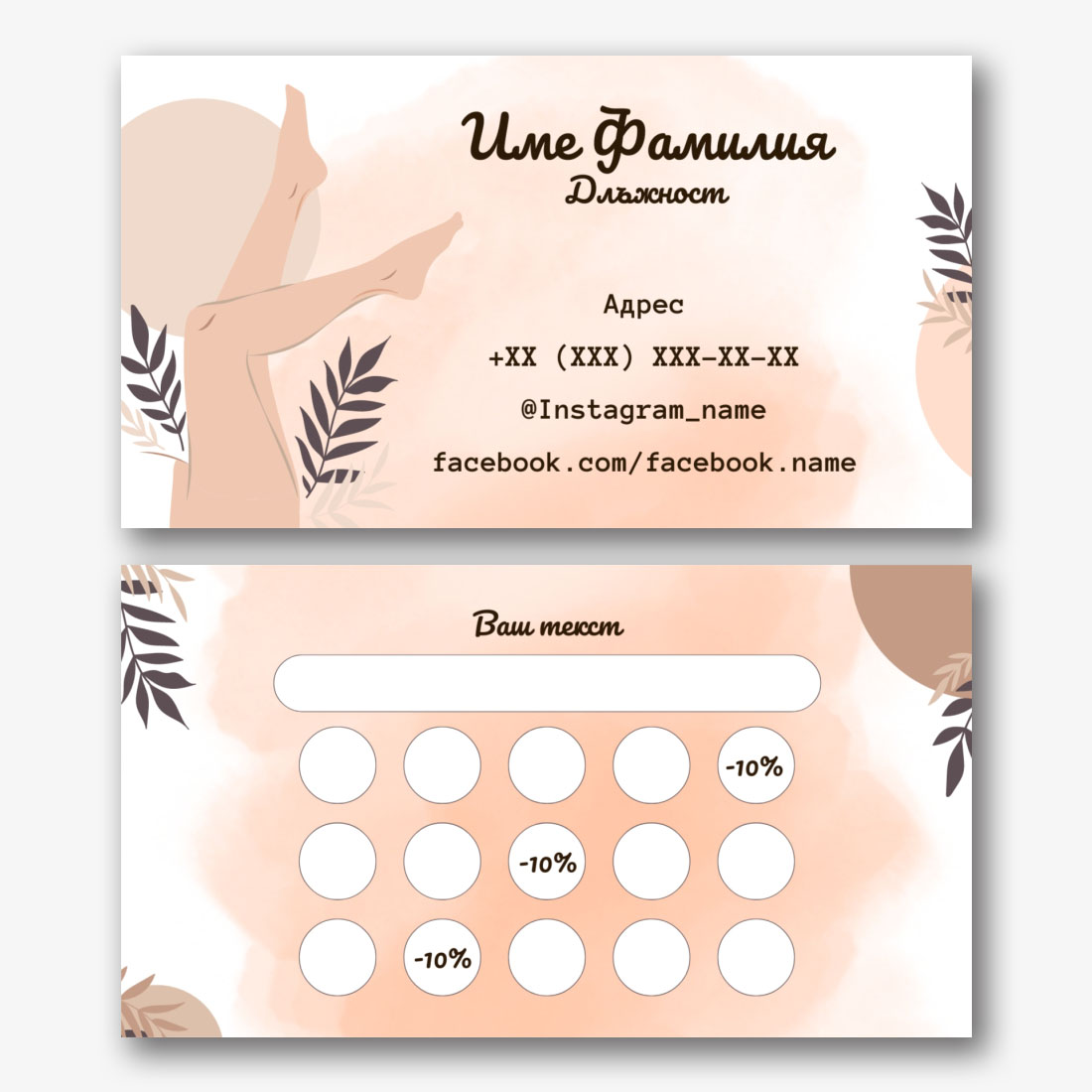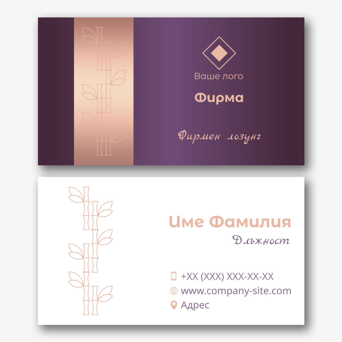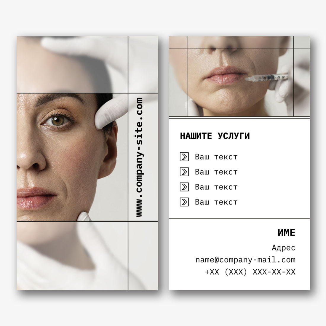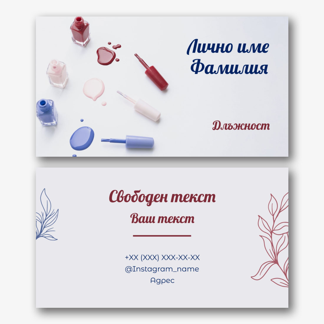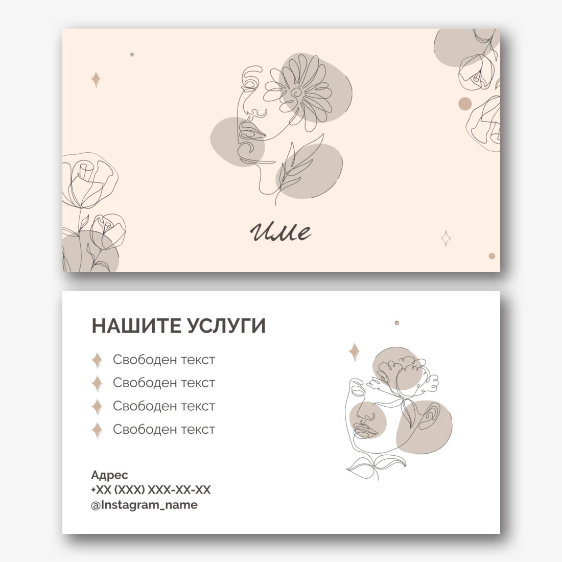 Шаблонът за визитка за студио за красота, майстор за красота и козметик се отличава с лаконичност, нежност и интересен дизайн. Той е идеален за професионалисти в областта на красотата, които искат да се откроят и да създадат запомнящ се външен вид. Цветовата схема на този шаблон е фокусирана върху деликатни нюанси, които създават атмосфера на спокойствие и елегантност, съчетана с изображения на женственост и красота. Дизайнът на визитката е кратък и фокусиран върху ключова информация. Горната част на визитката може да съдържа логото или името на студиото, а долната част съдържа данни за контакт и информация за предлаганите услуги. Това помага да се създаде разбираема структура и да се улесни възприемането на информацията. С помощта на нашия онлайн дизайнер можете лесно да персонализирате този шаблон за визитка според вашите нужди. Качете логото си, добавете данните си за контакт, изберете подходящите цветове и шрифтове. По този начин ще създадете уникална визитка, която отразява вашия професионализъм и стила на вашето студио за красота.