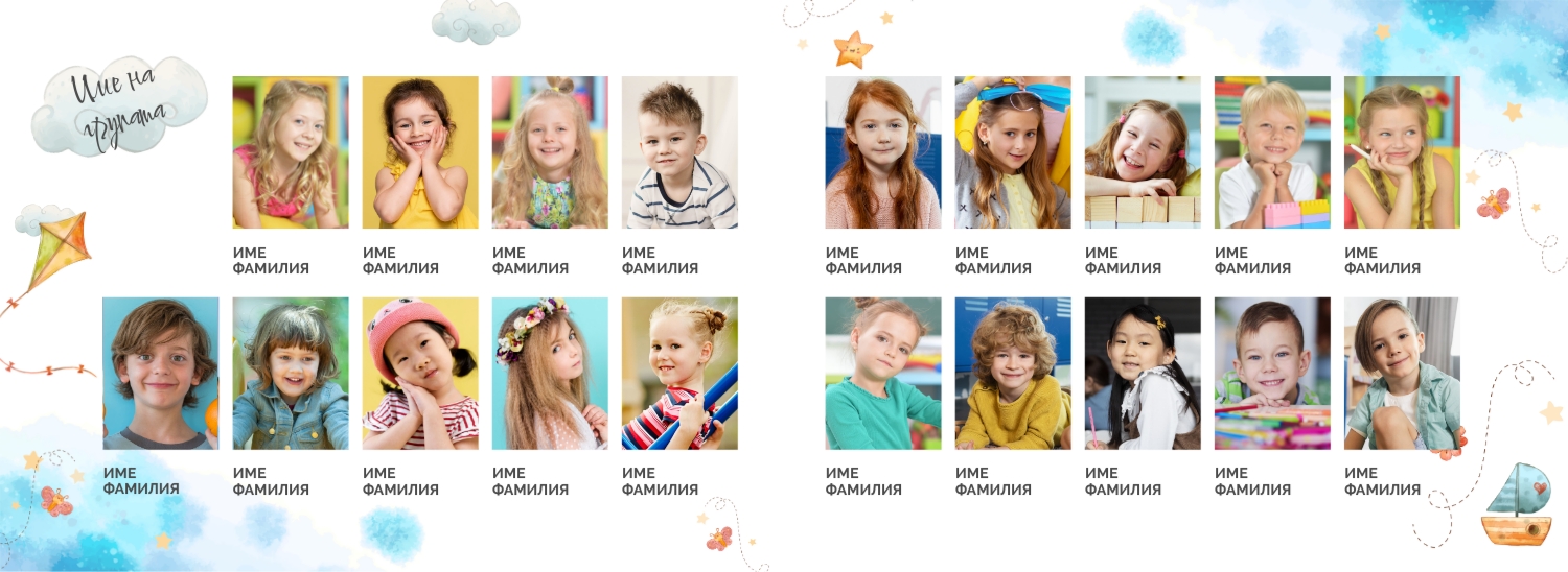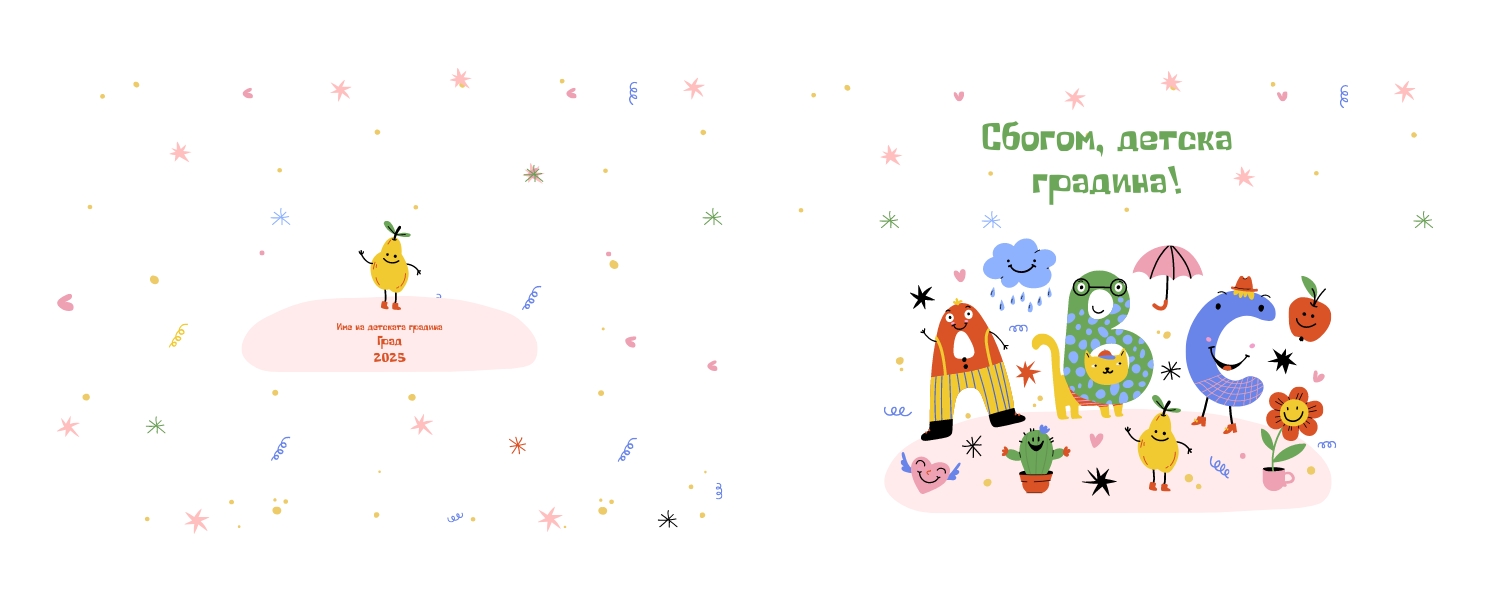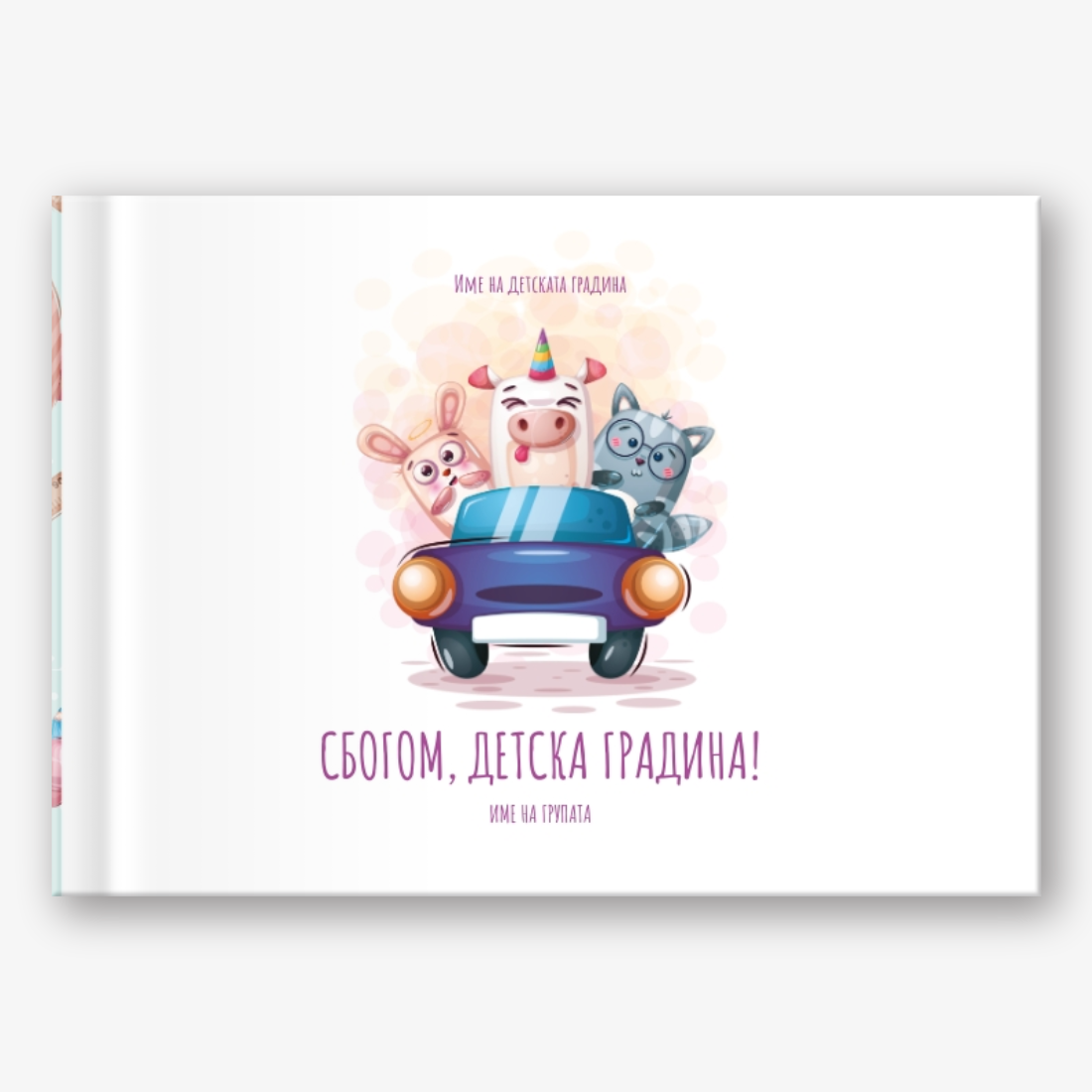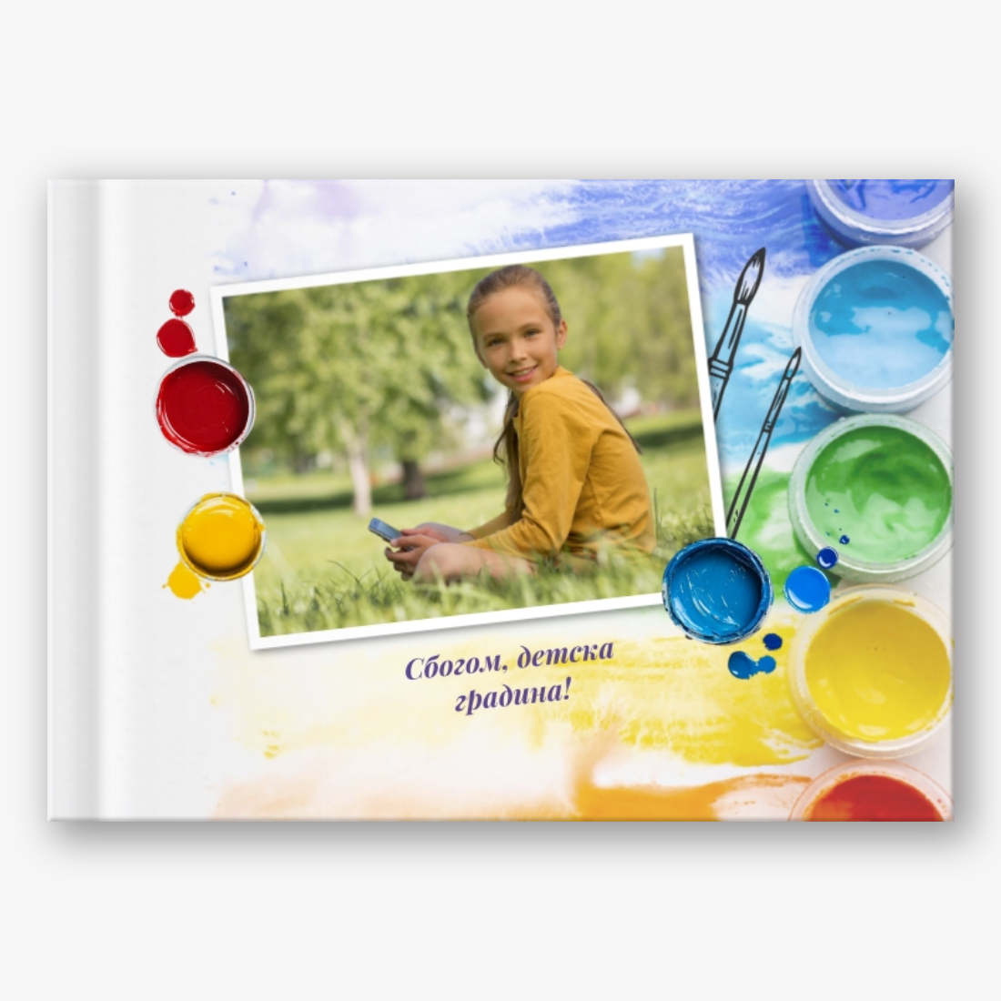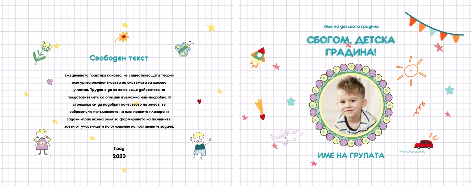 Шаблонът за фотокнига" Сбогом детска градина " е чудесен начин да запазите спомена за завършването на детската градина под формата на уникален фотоалбум. Дизайнът на този шаблон е декориран със сладки шарки, цветове и птици, за да създаде атмосфера на нежност и радост. Вътре в хоризонталната фотокнига можете да поставите снимки, които улавят важни моменти и събития от живота на вашето дете в детската градина. Това могат да бъдат снимки от ученички, изпълнения на различни събития, игри и забавления с приятели, общи моменти в група и много други, които ще ви помогнат да се върнете към тези спомени и да запомните най-ярките моменти.