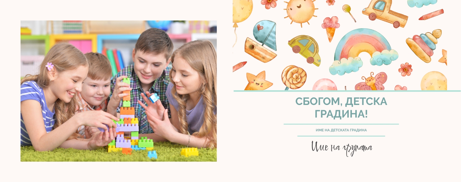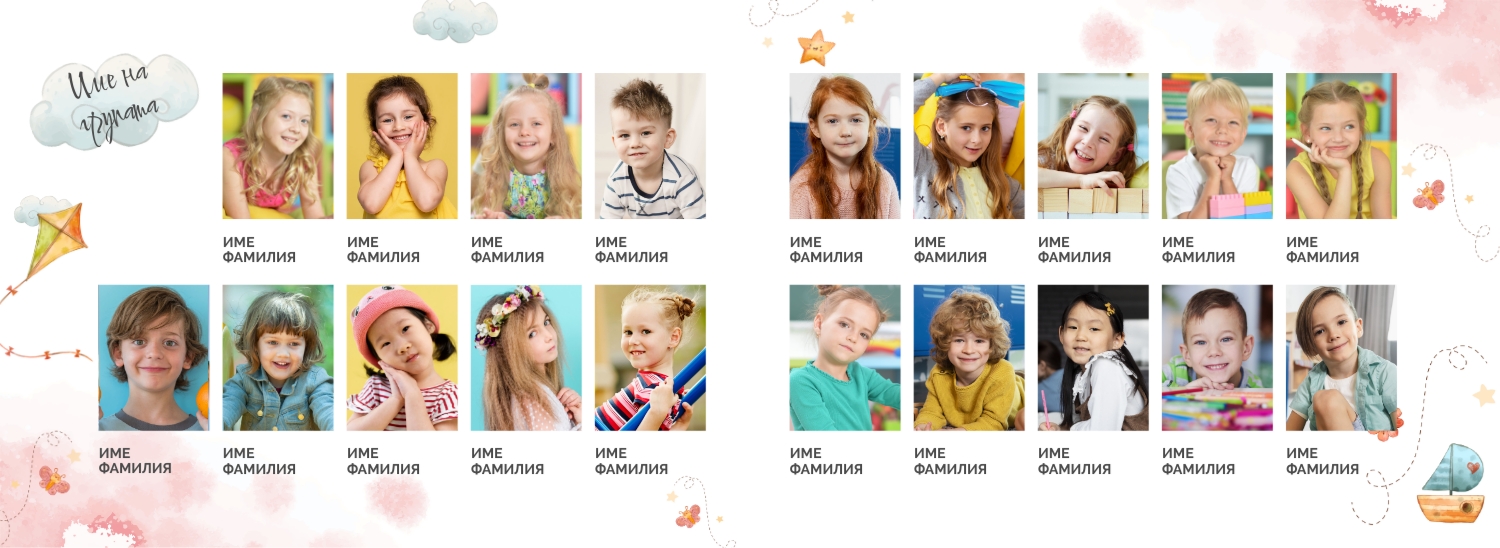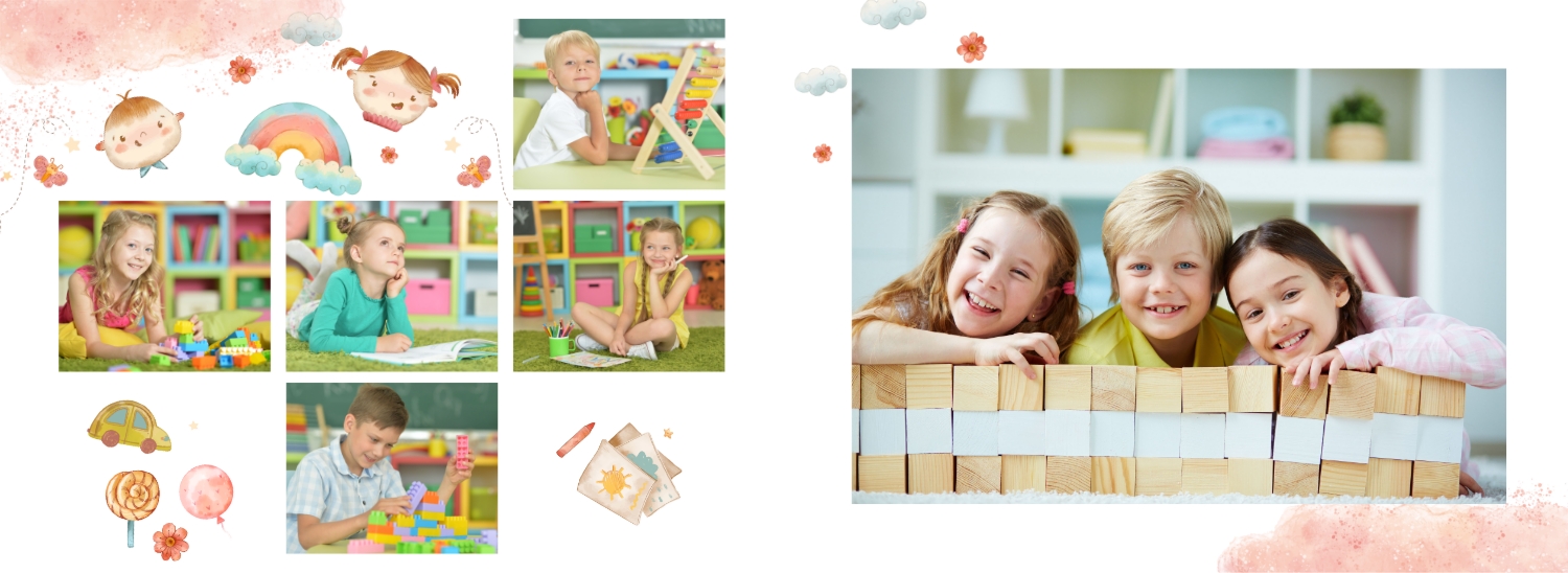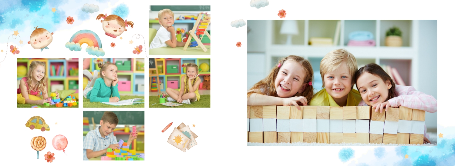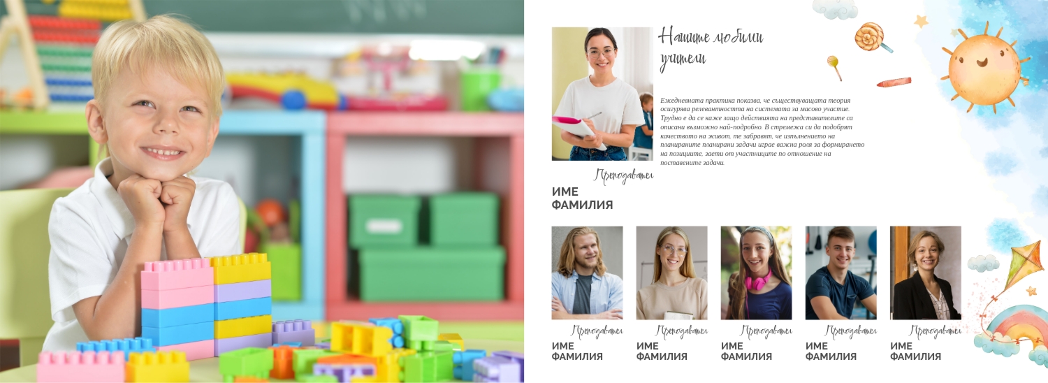 Шаблонът за фотокнига" Сбогом детска градина " е чудесен начин да запазите спомена за завършването на детската градина под формата на уникален фотоалбум. Дизайнът на този шаблон е декориран със сладки шарки, цветове и птици, за да създаде атмосфера на нежност и радост. Вътре в хоризонталната фотокнига можете да поставите снимки, които улавят важни моменти и събития от живота на вашето дете в детската градина. Това могат да бъдат снимки от ученички, изпълнения на различни събития, игри и забавления с приятели, общи моменти в група и много други, които ще ви помогнат да се върнете към тези спомени и да запомните най-ярките моменти.