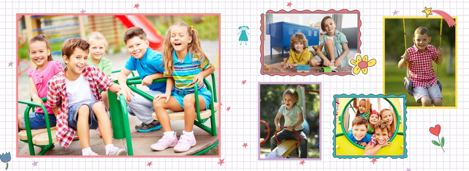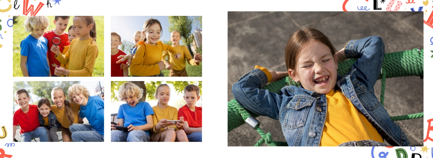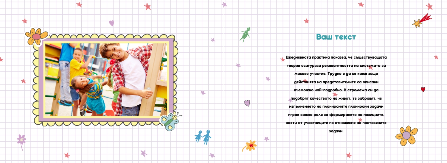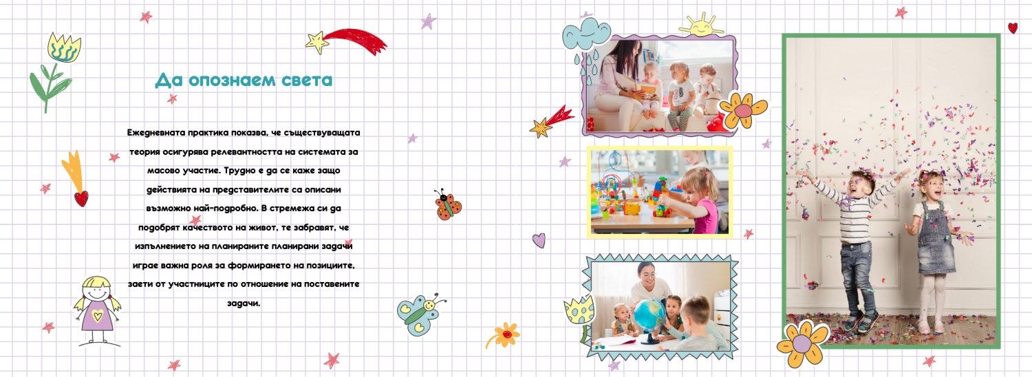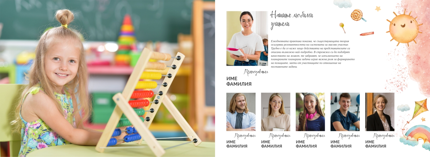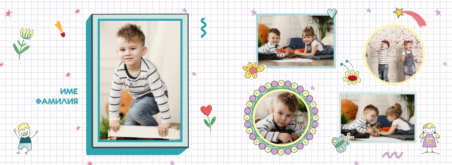 Шаблонът за фотокнига" Сбогом детска градина " е чудесен начин да запазите спомена за завършването на детската градина под формата на уникален фотоалбум. Дизайнът на този шаблон е декориран със сладки шарки, цветове и птици, за да създаде атмосфера на нежност и радост. Вътре в хоризонталната фотокнига можете да поставите снимки, които улавят важни моменти и събития от живота на вашето дете в детската градина. Това могат да бъдат снимки от ученички, изпълнения на различни събития, игри и забавления с приятели, общи моменти в група и много други, които ще ви помогнат да се върнете към тези спомени и да запомните най-ярките моменти.