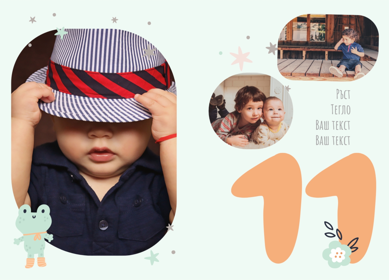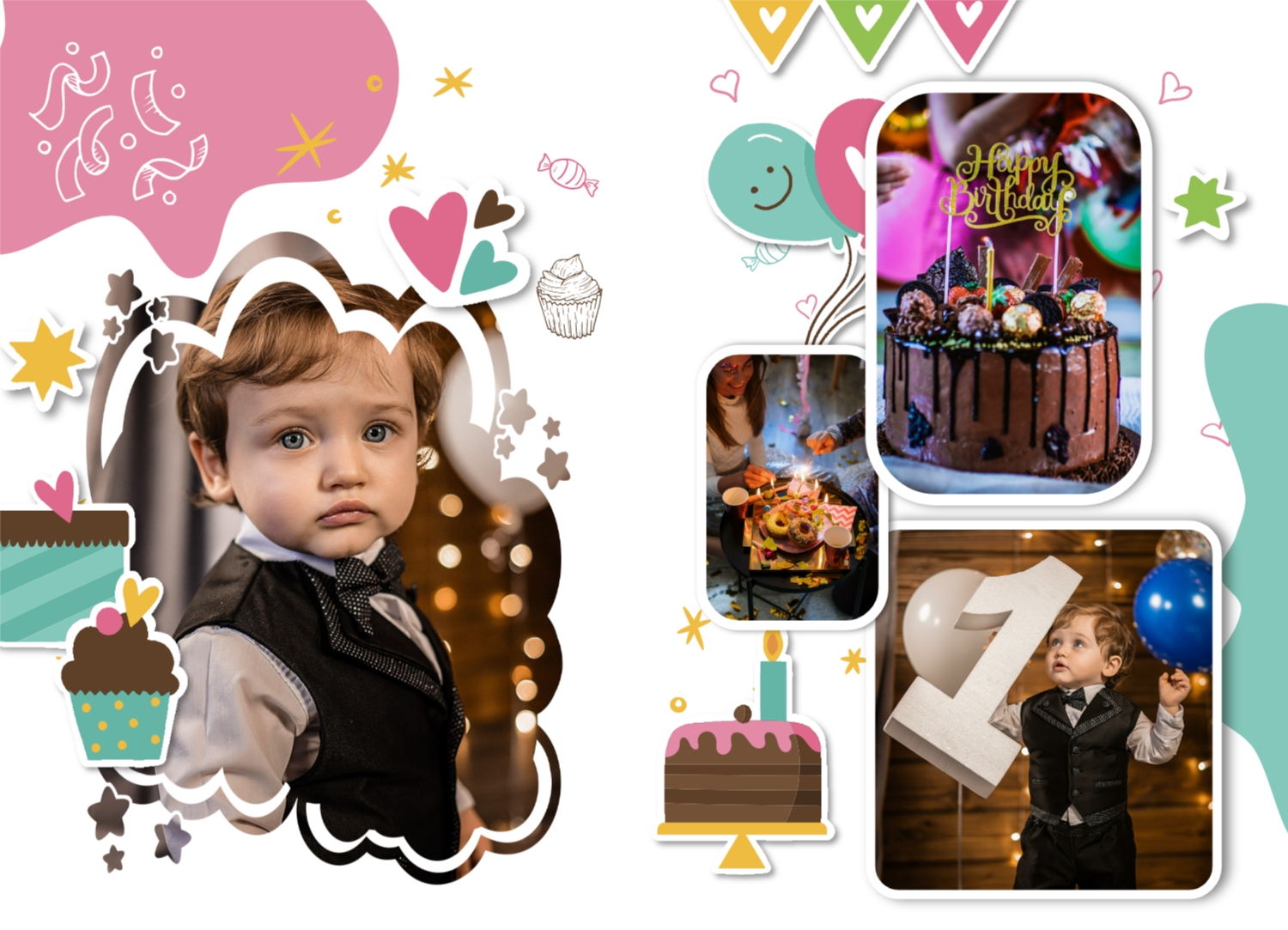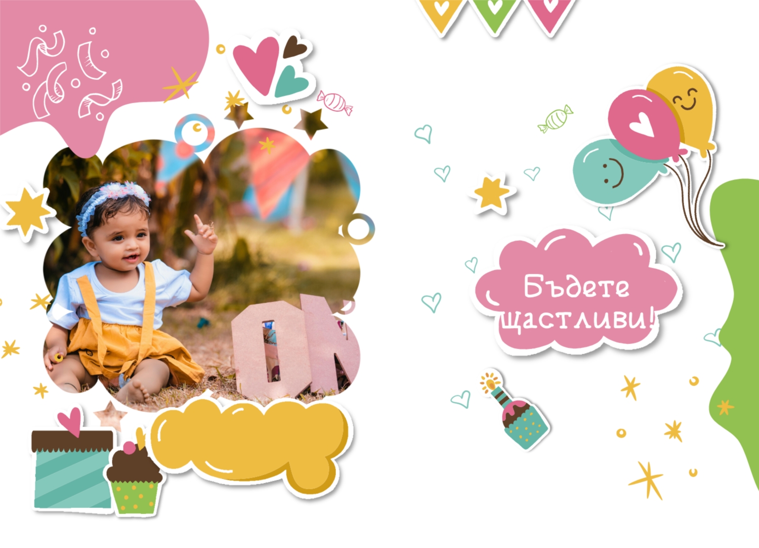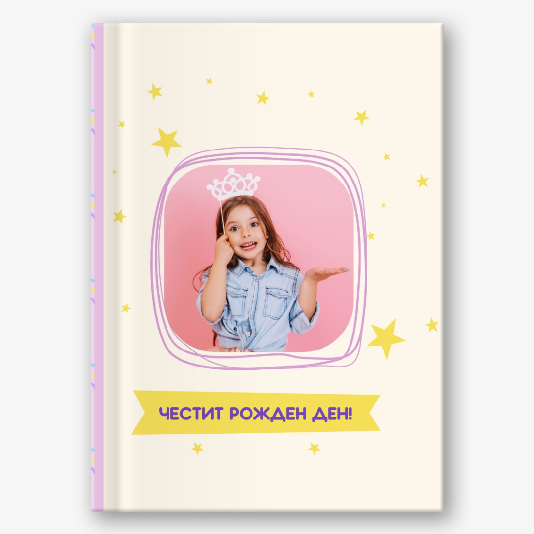 Шаблонът за фотокнига за детски снимки за рожден ден с твърди корици, тематичен в пространството за момче, ще ви помогне да създадете невероятен и уникален албум, който ще подчертае интересите и въображението на вашия син. Корицата на фотокнигата е декорирана в космически стил, изобразяваща звезди, планети, ракети. Използвайки такъв шаблон, можете лесно да създадете интересен и сладък фотоалбум, който ще зарадва вас и вашия син в продължение на много години. Онлайн конструкторът предоставя възможност за персонализиране на шаблона, добавяне на вашите снимки и текстове, за да направите албума уникален и точно както искате. Използвайте неговите инструменти, редактирайте шаблона за лични предпочитания без професионален дизайнер.