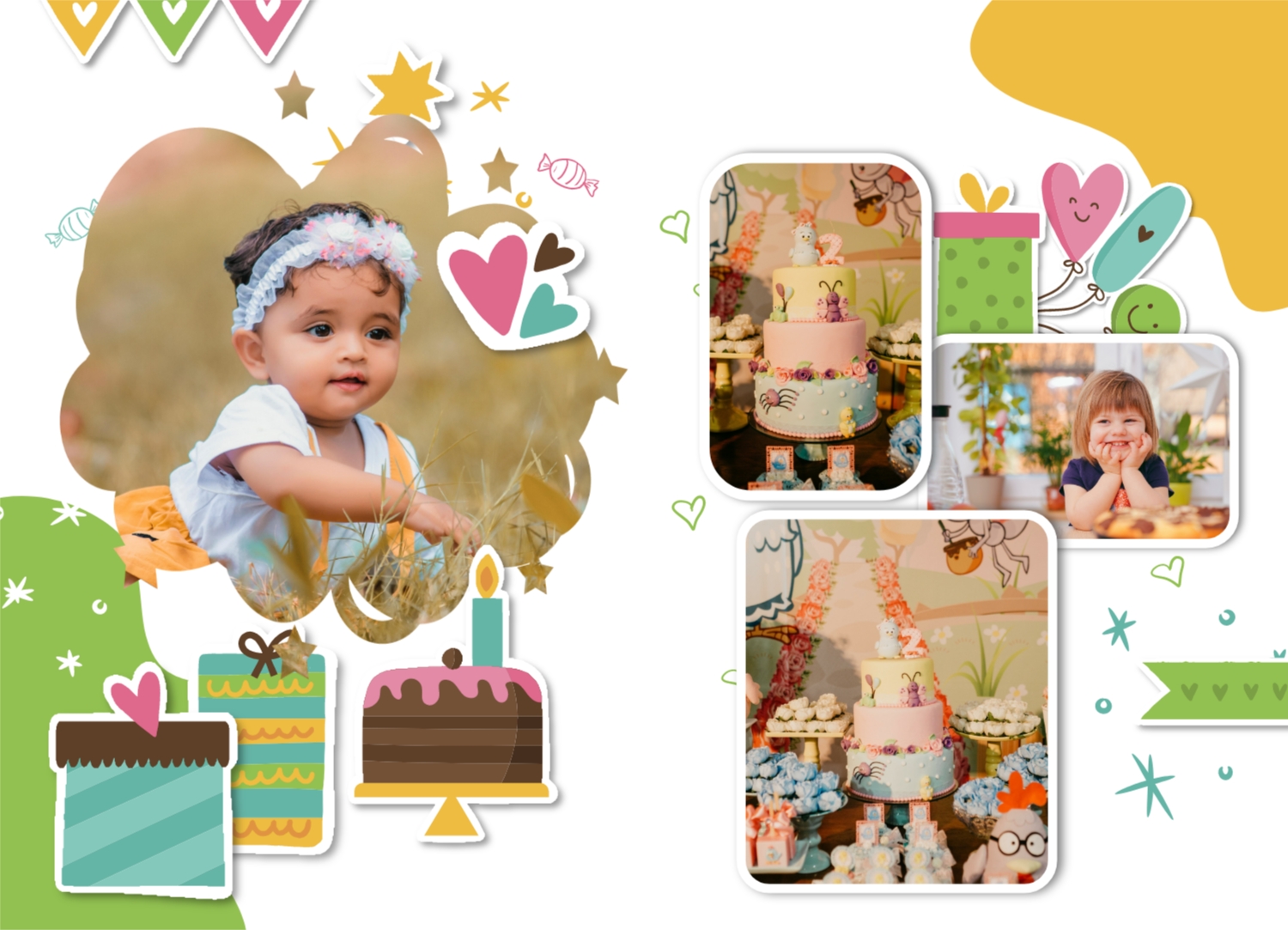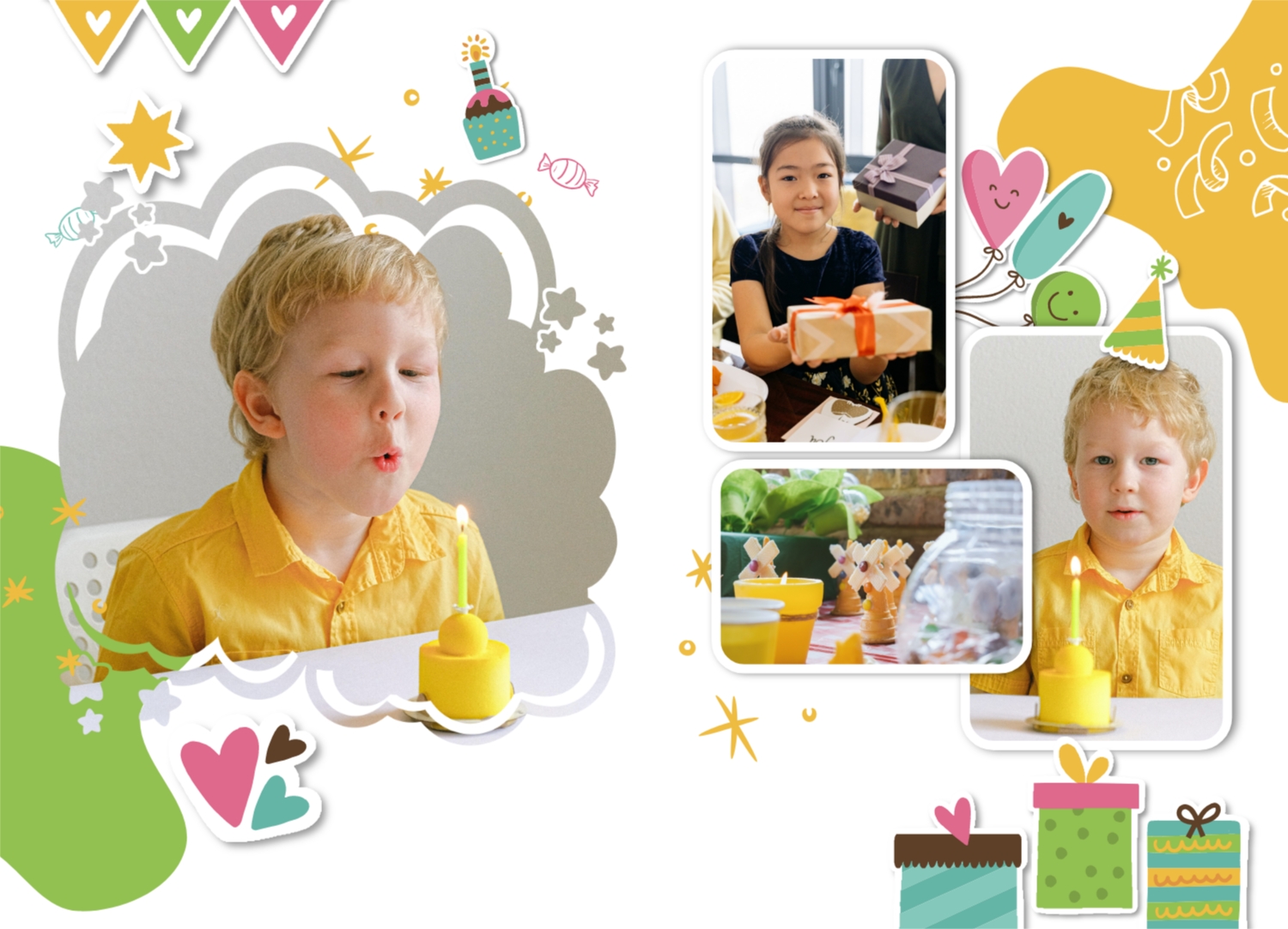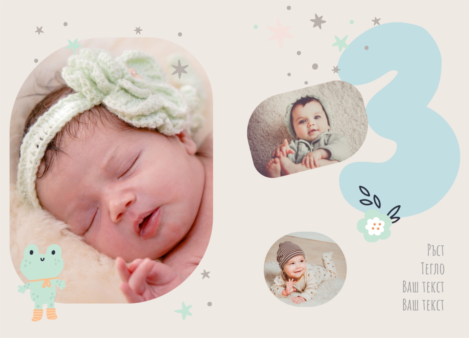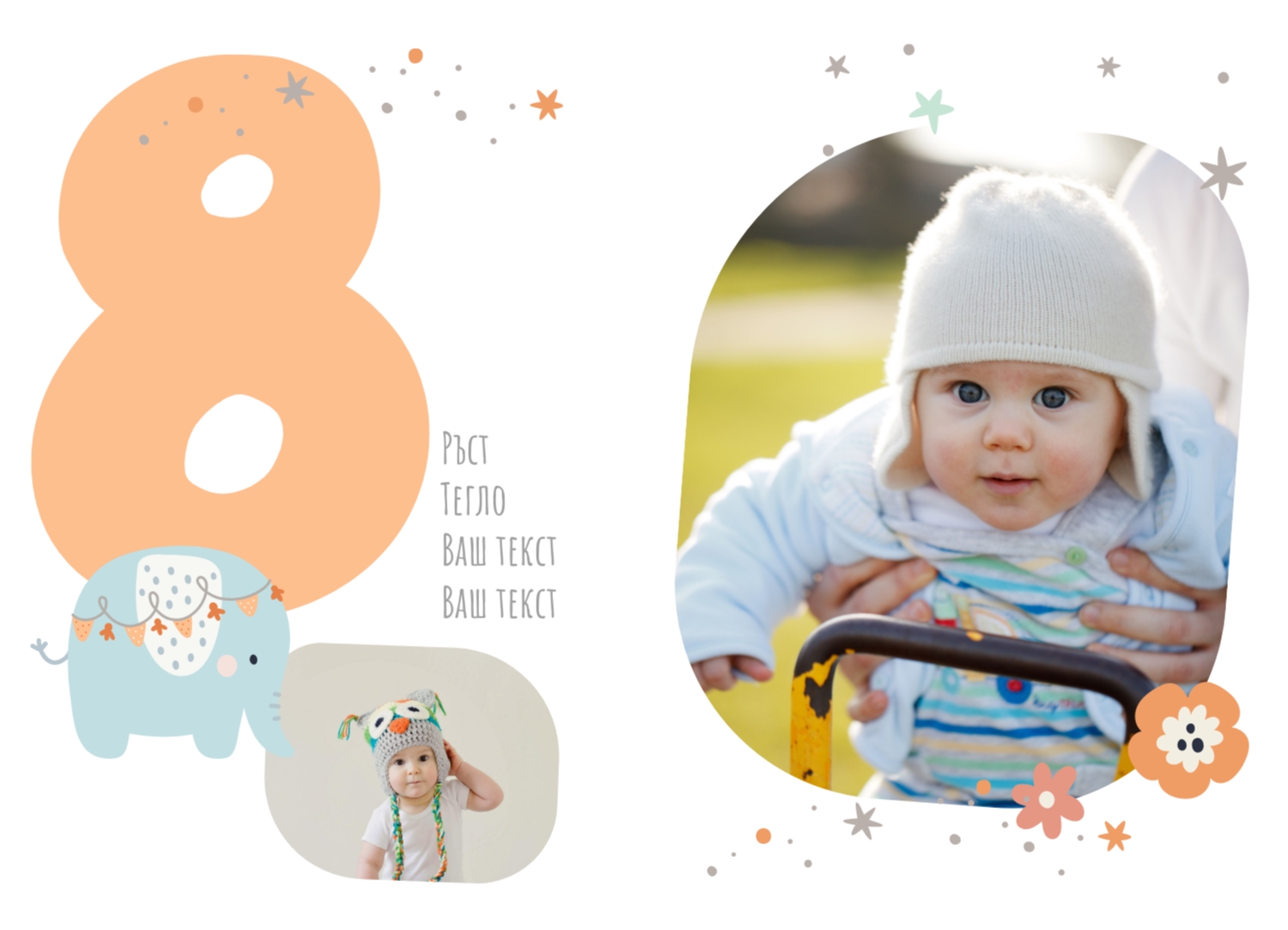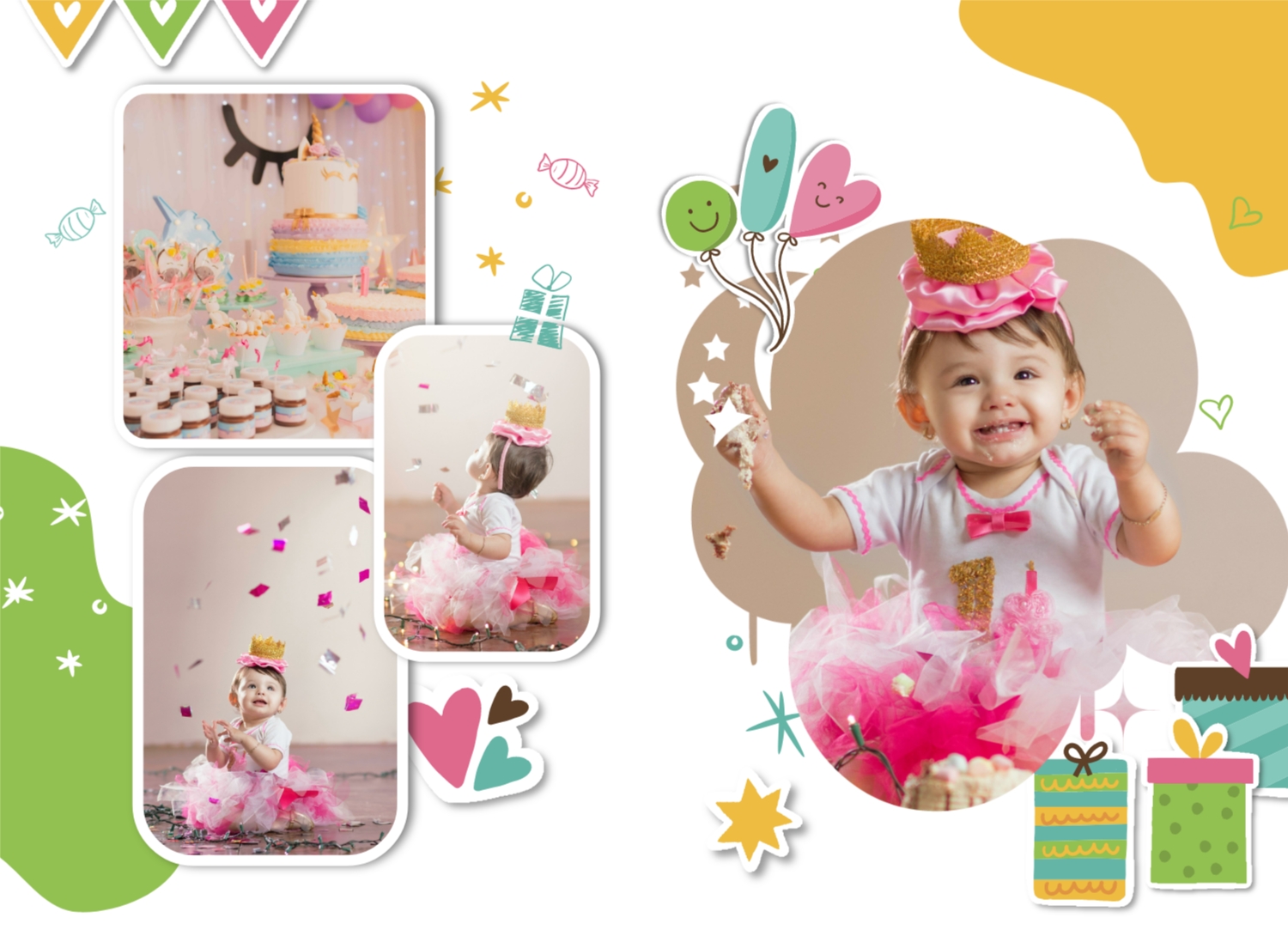 Шаблонът за фотокнига за детски снимки за рожден ден с твърди корици, тематичен в пространството за момче, ще ви помогне да създадете невероятен и уникален албум, който ще подчертае интересите и въображението на вашия син. Корицата на фотокнигата е декорирана в космически стил, изобразяваща звезди, планети, ракети. Използвайки такъв шаблон, можете лесно да създадете интересен и сладък фотоалбум, който ще зарадва вас и вашия син в продължение на много години. Онлайн конструкторът предоставя възможност за персонализиране на шаблона, добавяне на вашите снимки и текстове, за да направите албума уникален и точно както искате. Използвайте неговите инструменти, редактирайте шаблона за лични предпочитания без професионален дизайнер.