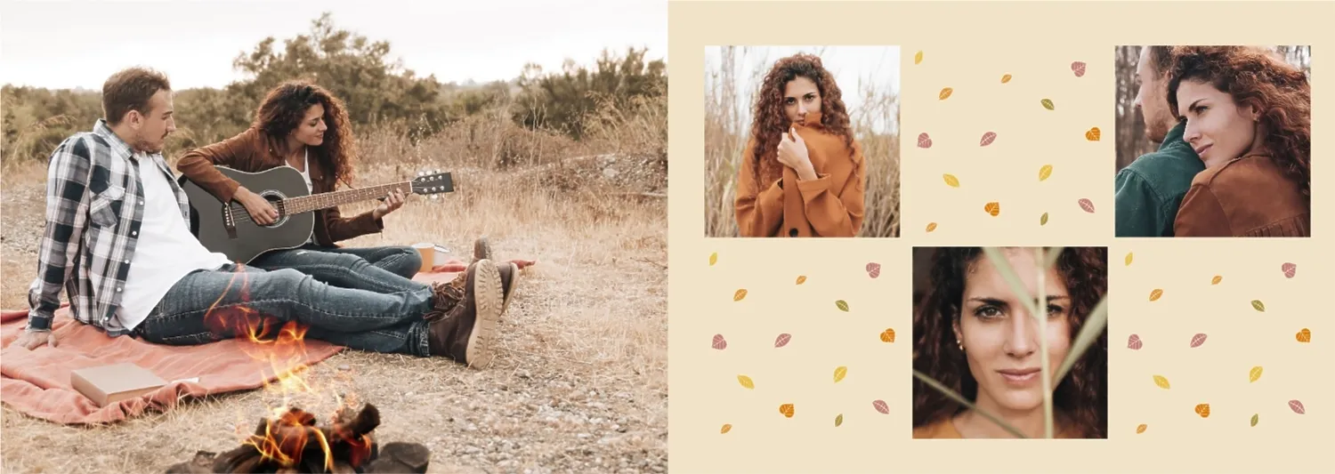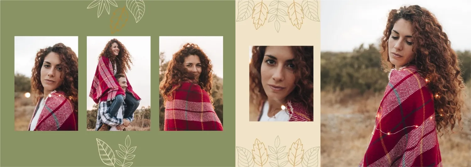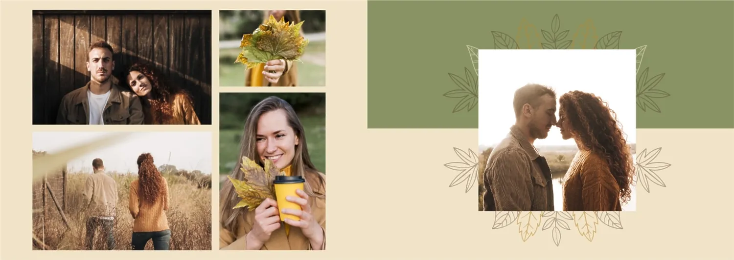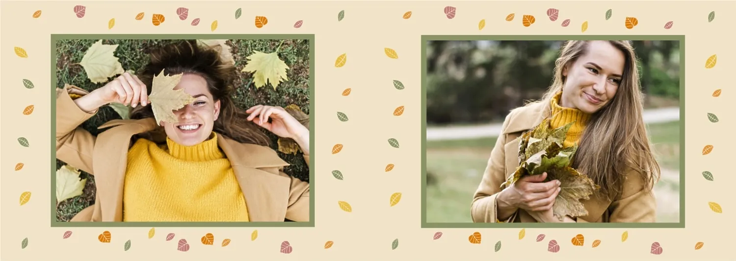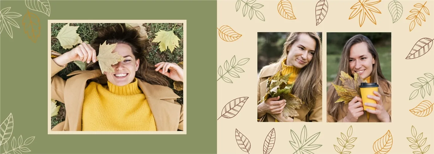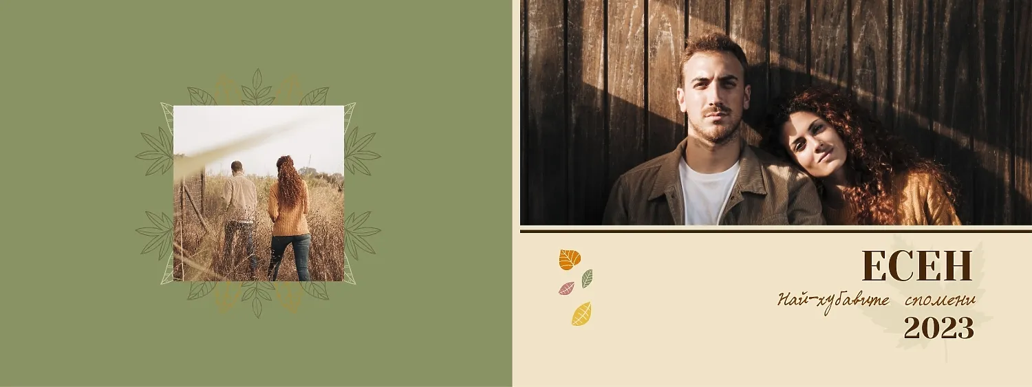Есента е време на невероятни промени в природата, когато листата на дърветата се превръщат в златни и червени цветове, а въздухът е изпълнен с прохлада и магия. Нашите най-добри моменти от това невероятно време на годината заслужават специално внимание и запазване. За това създадохме безплатен шаблон за широка фотокнига с твърди корици най-добрите моменти от есента. Този шаблон е предназначен да подчертае красотата и комфорта на есента, с негова помощ можете да създадете уникална фотокнига, изпълвайки я с ярки снимки, улавящи есенни разходки, падане на листа и моменти на затопляща топлина със семейството и приятелите. Шаблонът предоставя разнообразни места за снимки и допълнителни записи, така че да можете да разкажете историята на есента си по начина, по който искате. С помощта на нашия онлайн дизайнер можете да реализирате творческите си идеи, като коригирате шаблона според вашия стил и предпочитания. Създайте своя уникална и вълшебна фотокнига" най-добрите моменти на есента " и подарете на себе си и на близките си ценни спомени, които ще стоплят душата през цялата година.