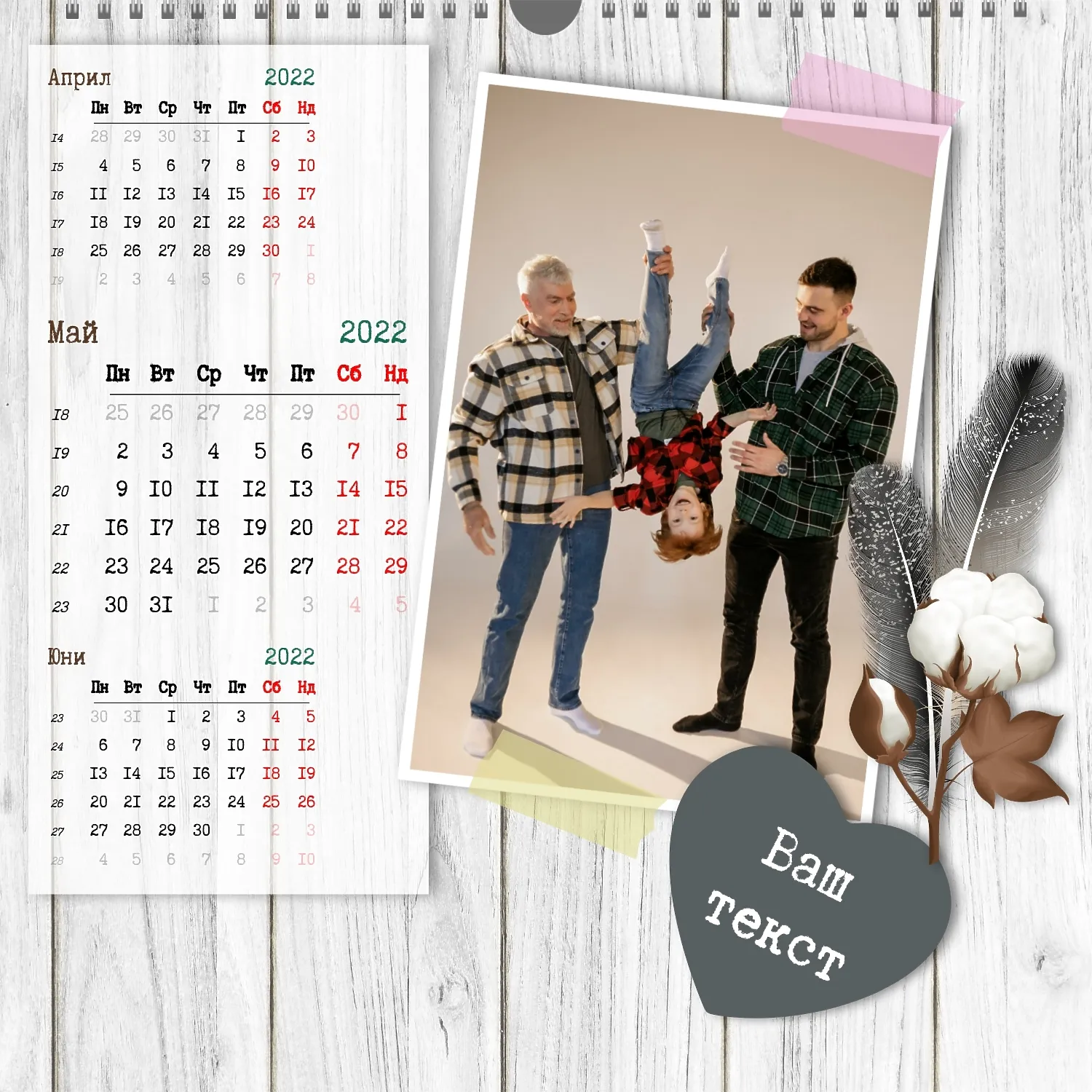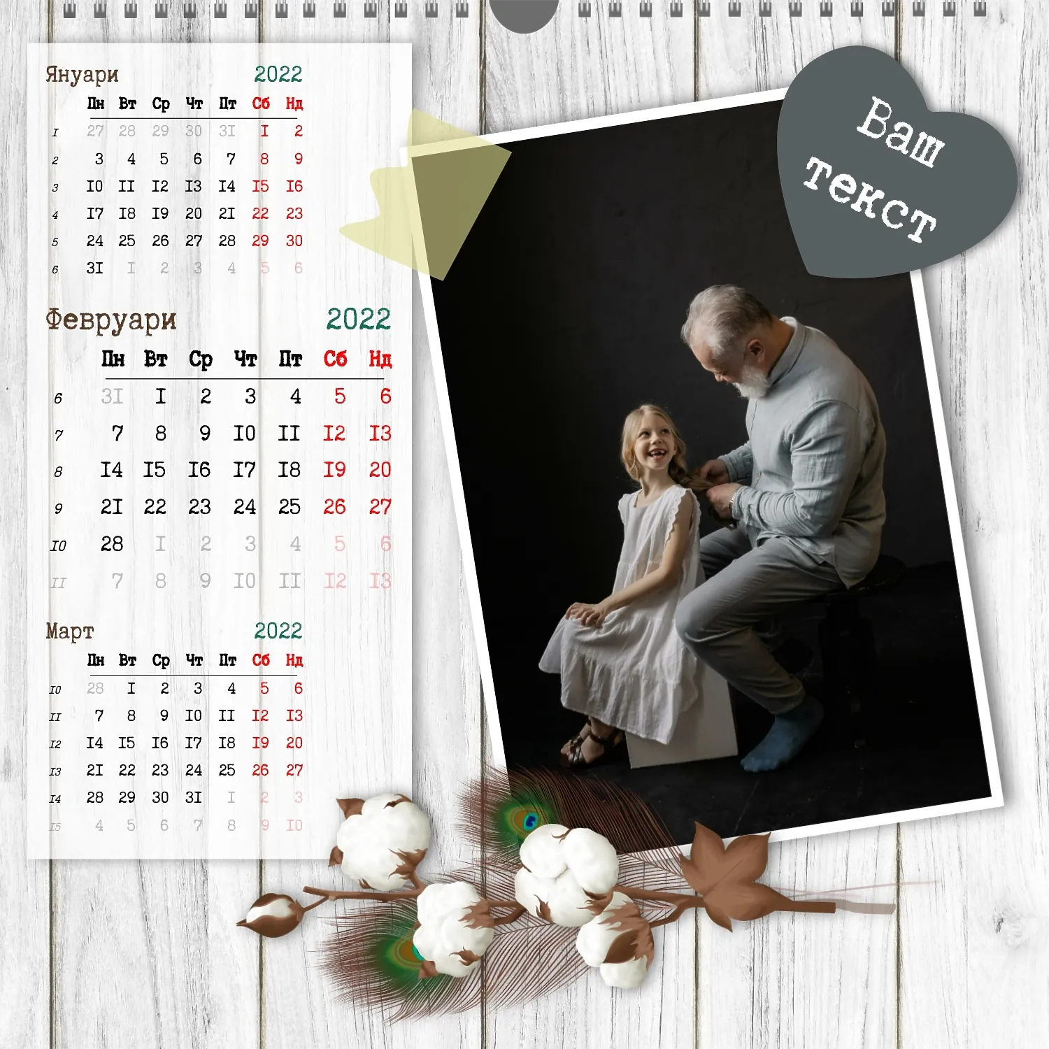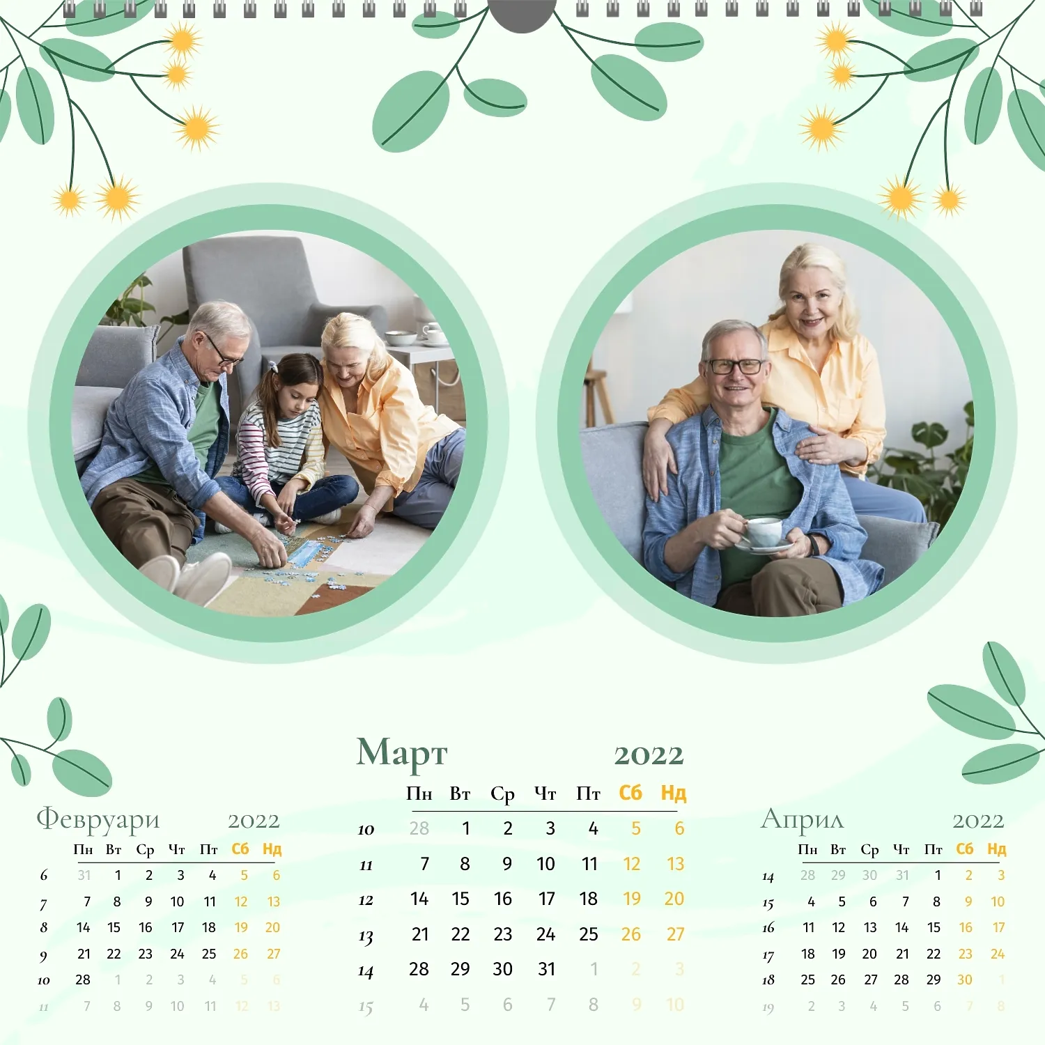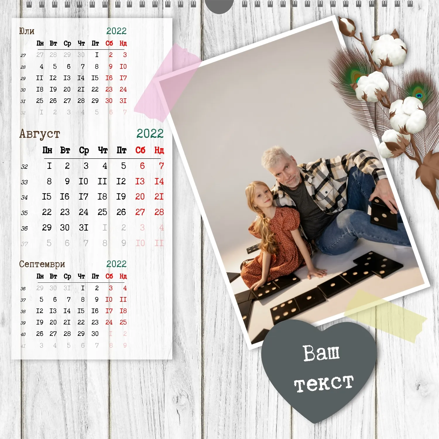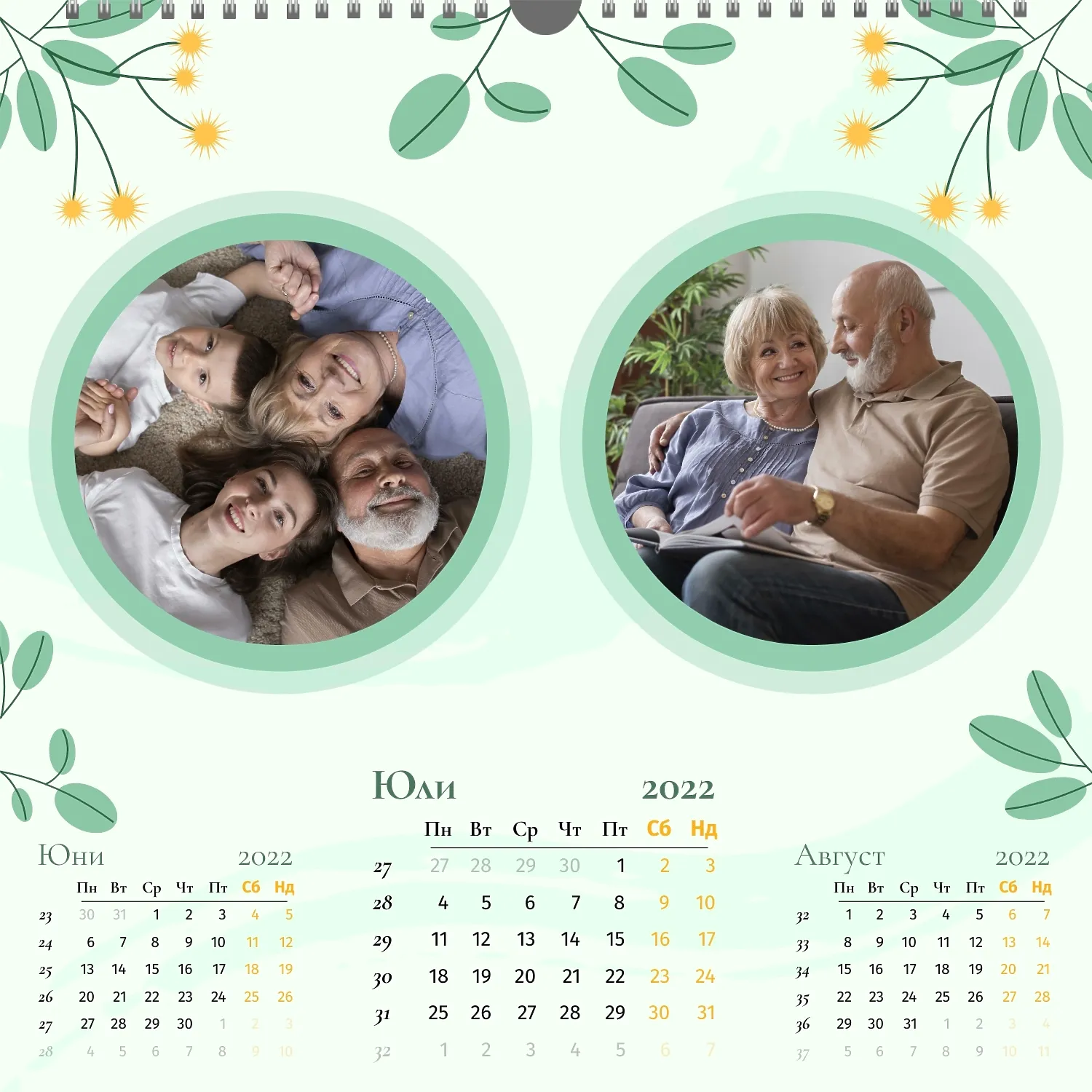 Шаблонът" нашето семейство " за стенен квадратен календар ви предоставя уникалната възможност да създадете персонализиран календар в нашия онлайн конструктор, отразяващ важни моменти и събития в живота на вашето семейство. Персонализирайте всеки месец според вашите предпочитания, поставете снимки, Добавете специални дати и важни събития. Ще можете да променяте цветовата схема, шрифтовете и стиловете, така че календарът да отговаря на вашия уникален стил и предпочитания. Персонализирайте заглавията на месеците, подчертайте важни дати и събития с цвят, за да направите календара си по-жив и запомнящ се.