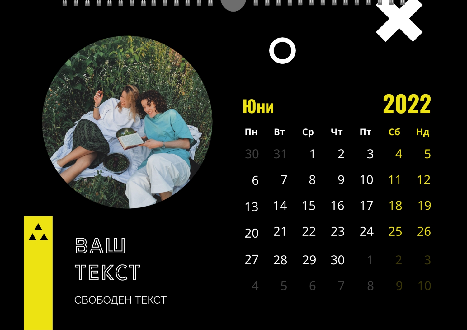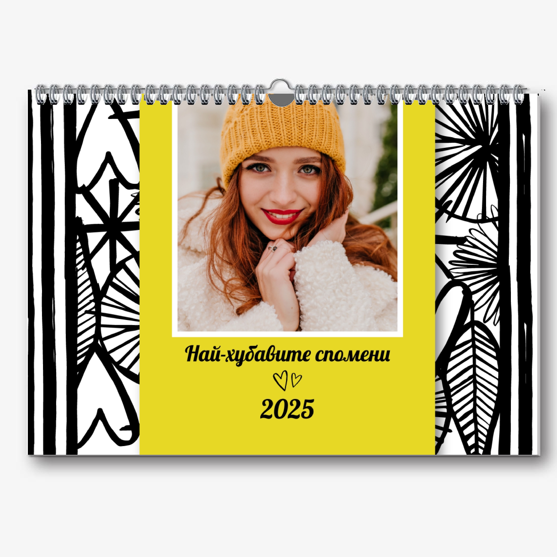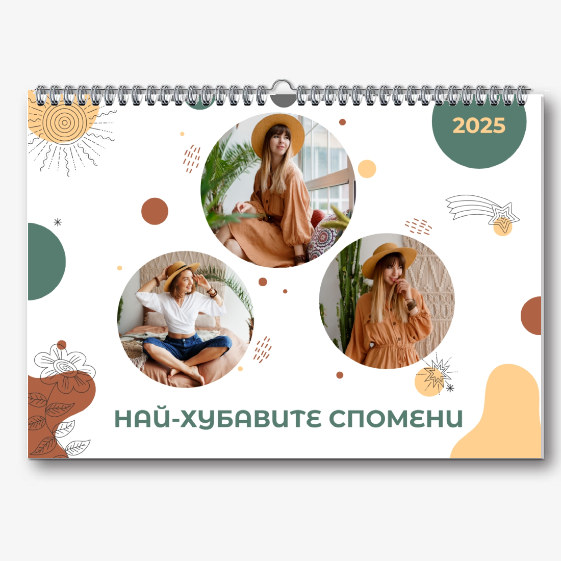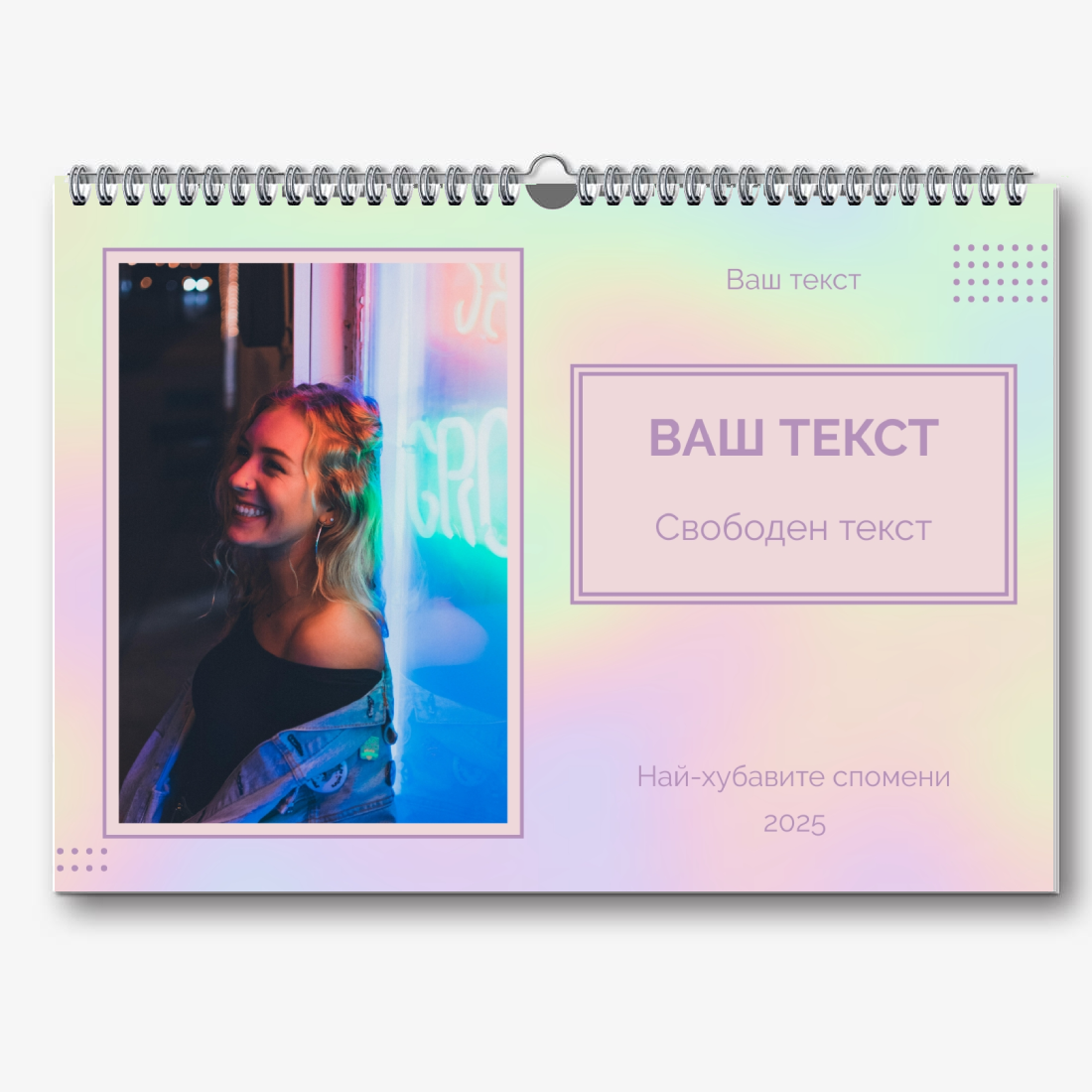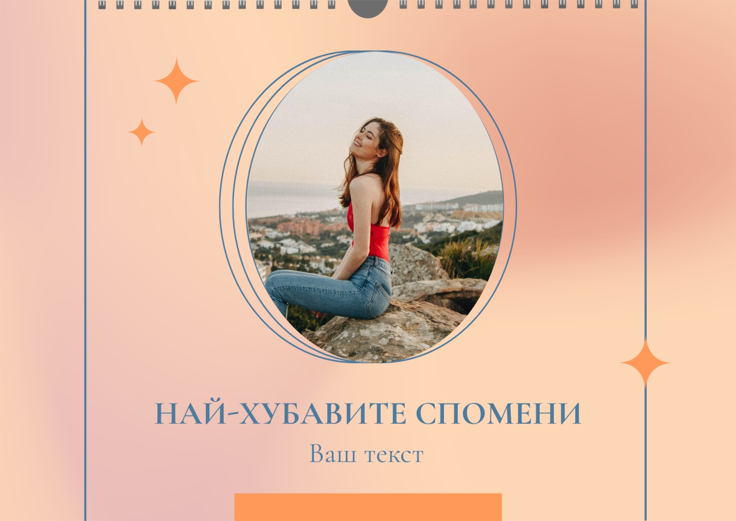 Шаблонът" най-добри спомени " за стенен широк календар в нашия онлайн конструктор предоставя уникална възможност да оживите най-ярките си моменти. Вдъхновен от мили спомени, този шаблон е създаден, за да можете лесно и креативно да проектирате календара си. С внимание към детайлите и лекота на използване, нашият онлайн конструктор ви позволява да персонализирате всеки елемент от този шаблон. Можете да променяте цветове, шрифтове, да добавяте свои снимки и текст, правейки всеки месец уникален. Персонализираният дизайн ще бъде отражение на вашия уникален стил и спомени. Създаването на вашия уникален хоризонтален стенен календар с помощта на шаблона "най-добри спомени" в нашия онлайн конструктор е възможност не само да запазите ценни моменти, но и да изразите своята индивидуалност чрез творческия процес на проектиране. Празнувайте всеки ден, вдъхвайки живот на спомените си и създайте календар, който ще ви радва през цялата година.