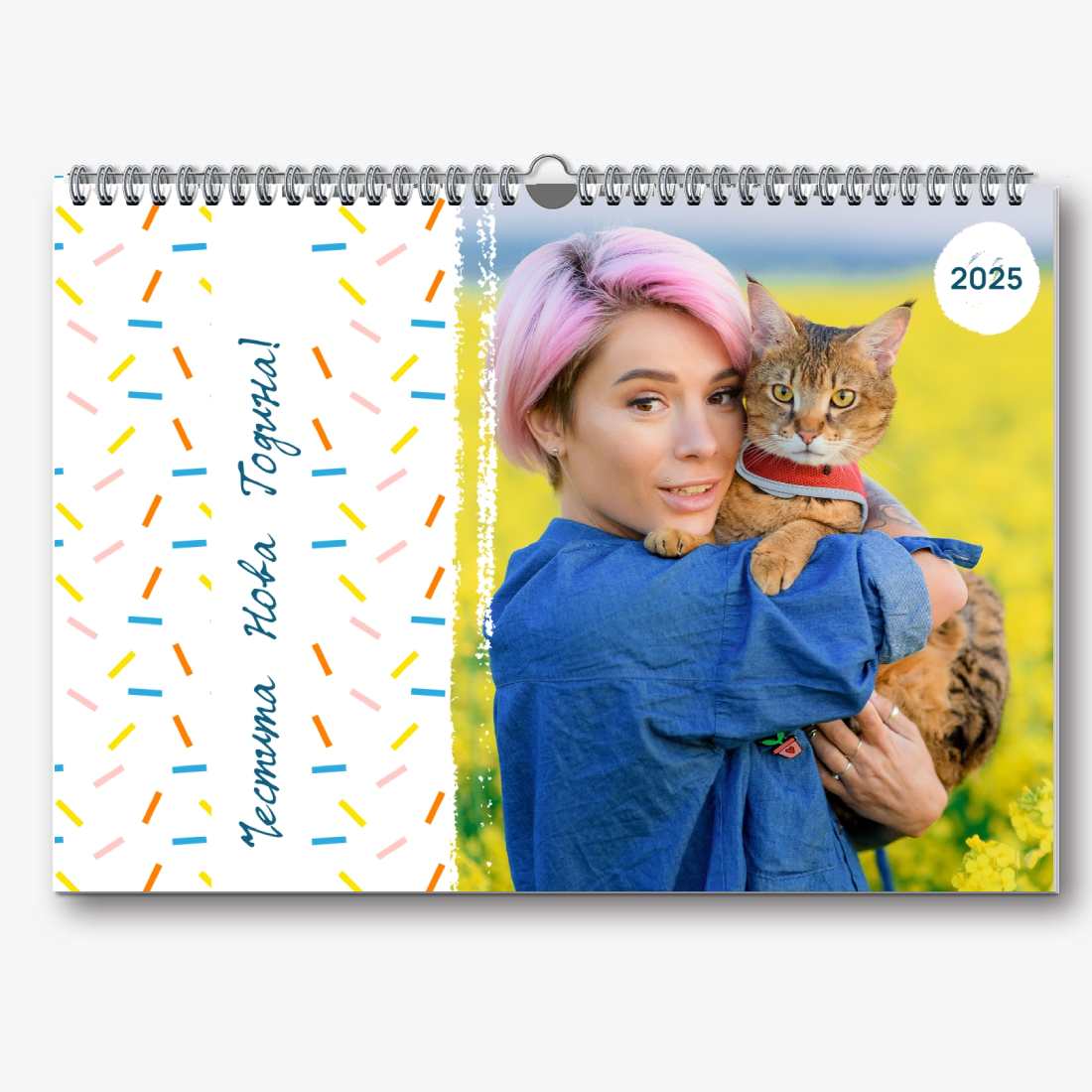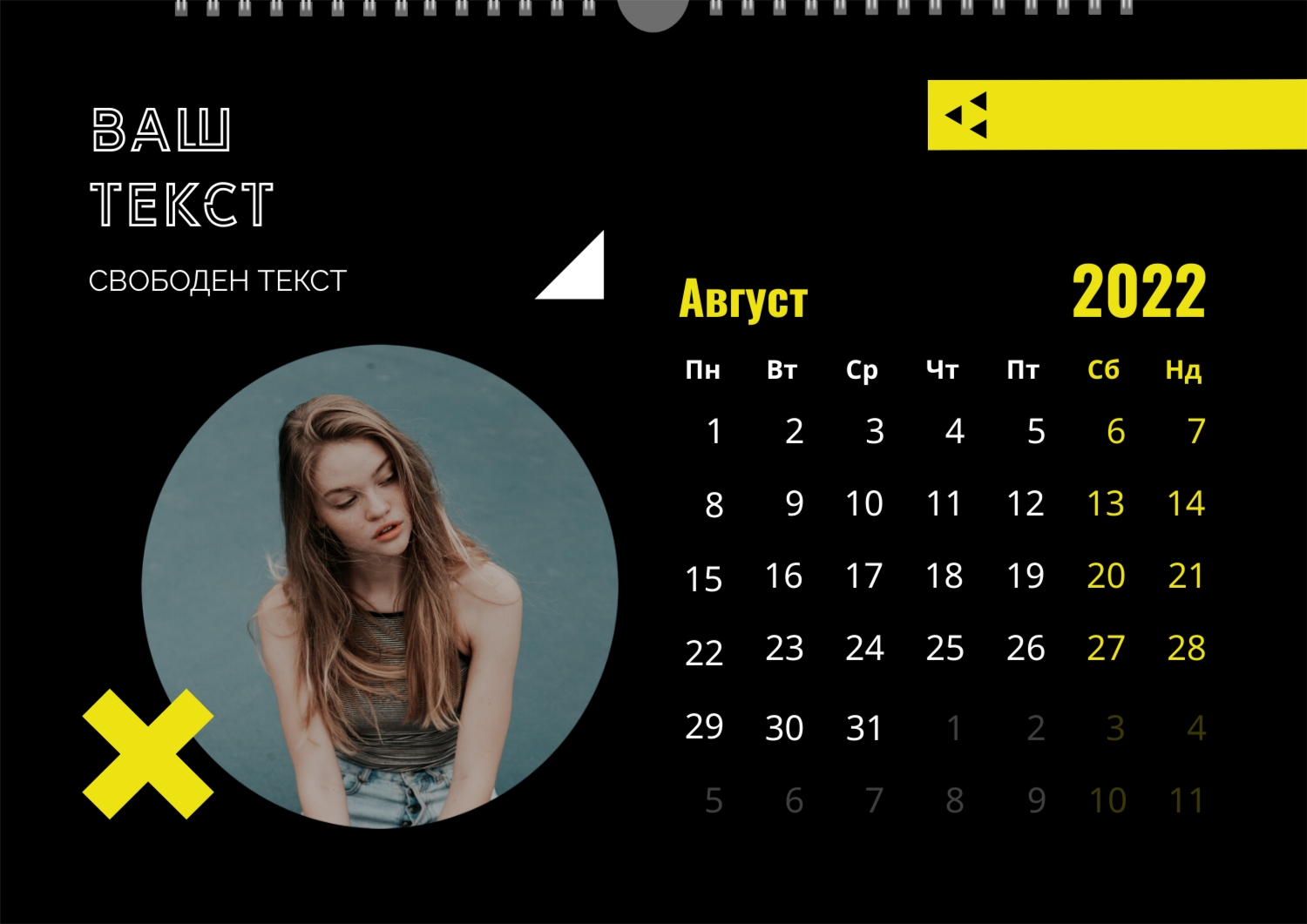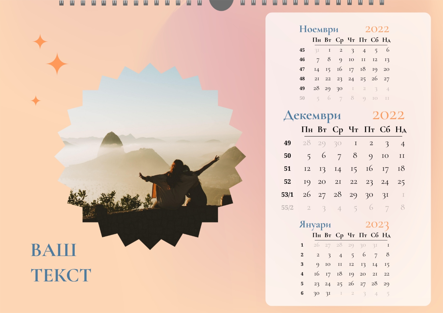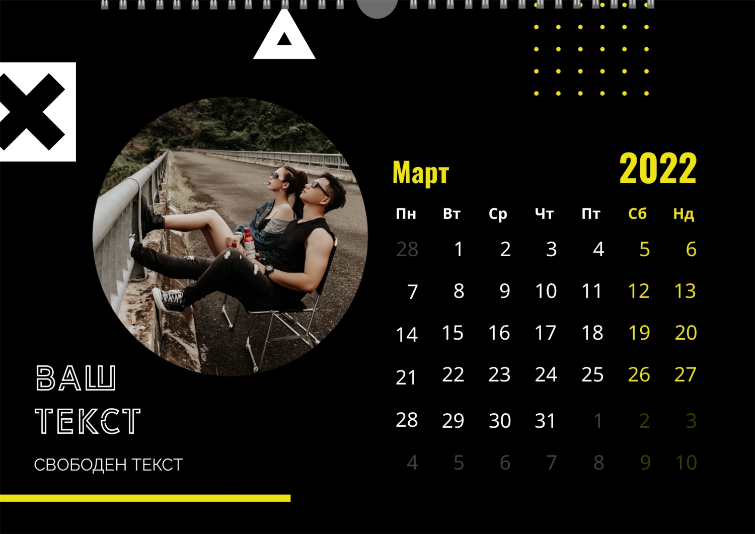 Шаблонът" най-добри спомени " за стенен широк календар в нашия онлайн конструктор предоставя уникална възможност да оживите най-ярките си моменти. Вдъхновен от мили спомени, този шаблон е създаден, за да можете лесно и креативно да проектирате календара си. С внимание към детайлите и лекота на използване, нашият онлайн конструктор ви позволява да персонализирате всеки елемент от този шаблон. Можете да променяте цветове, шрифтове, да добавяте свои снимки и текст, правейки всеки месец уникален. Персонализираният дизайн ще бъде отражение на вашия уникален стил и спомени. Създаването на вашия уникален хоризонтален стенен календар с помощта на шаблона "най-добри спомени" в нашия онлайн конструктор е възможност не само да запазите ценни моменти, но и да изразите своята индивидуалност чрез творческия процес на проектиране. Празнувайте всеки ден, вдъхвайки живот на спомените си и създайте календар, който ще ви радва през цялата година.