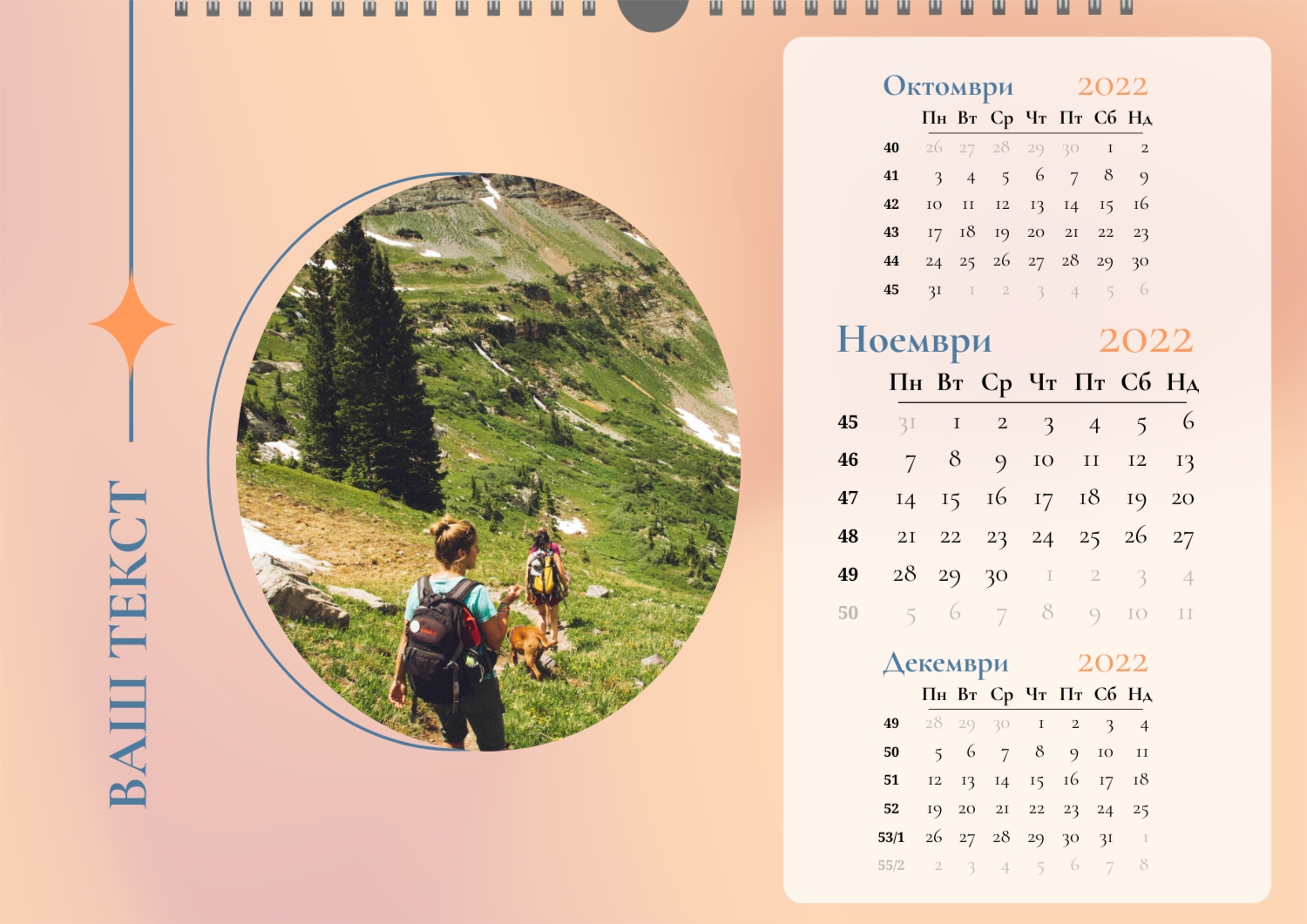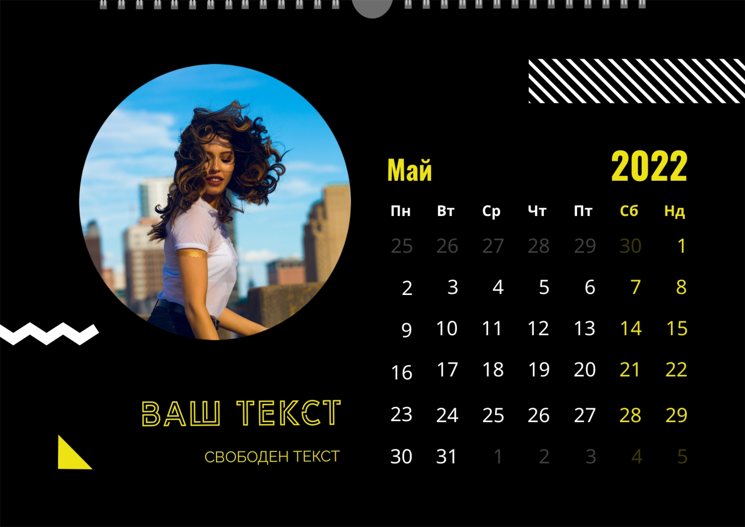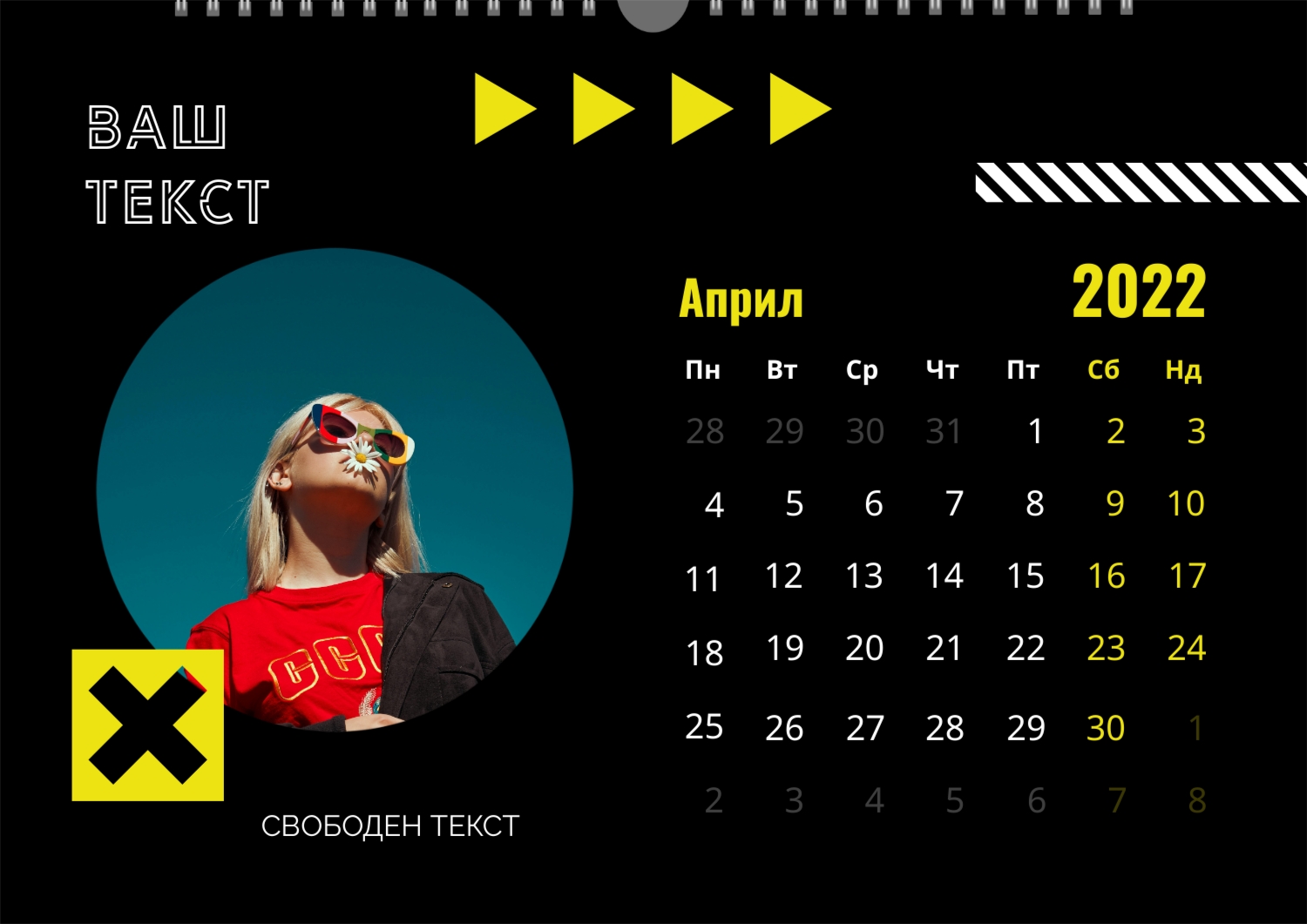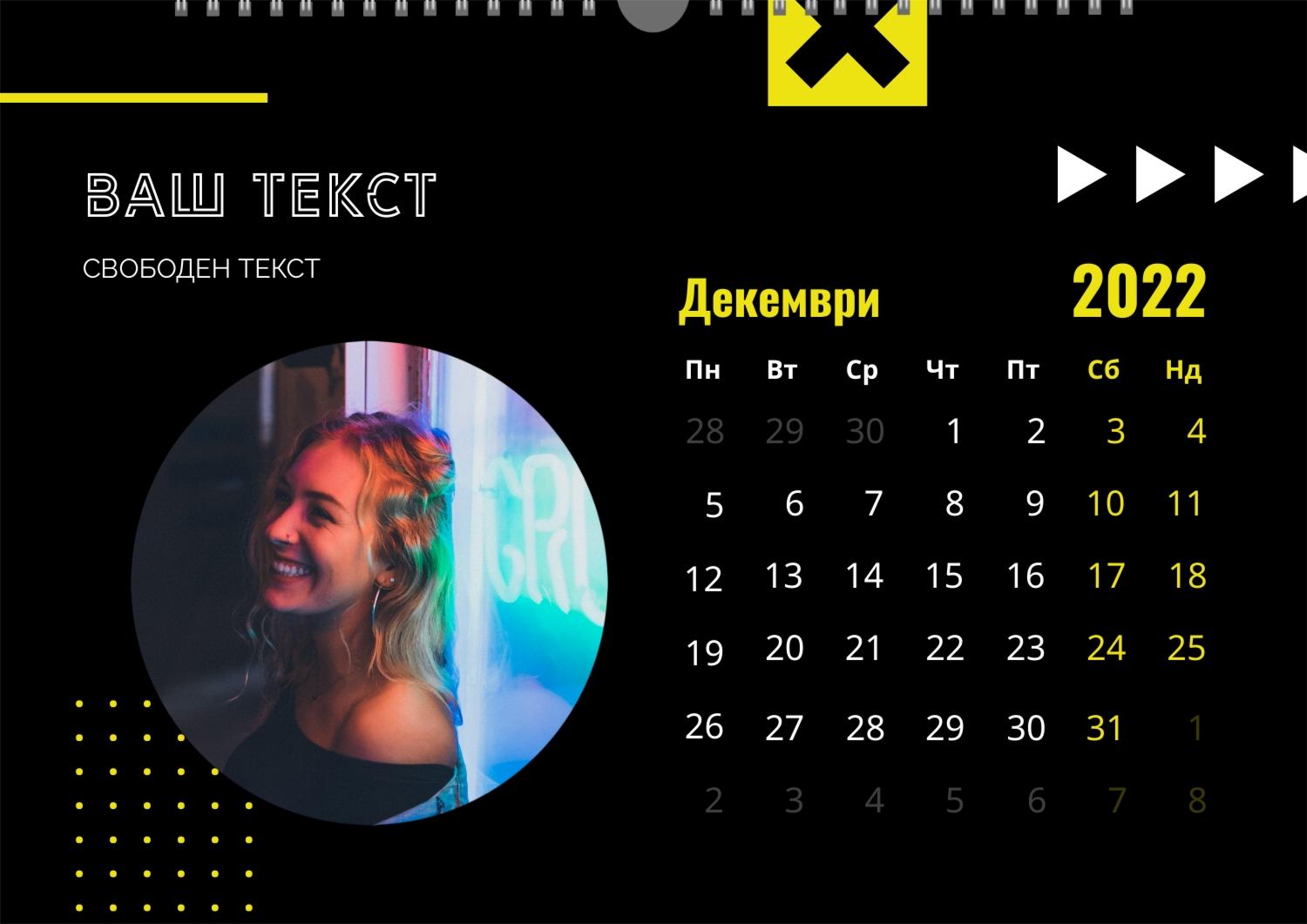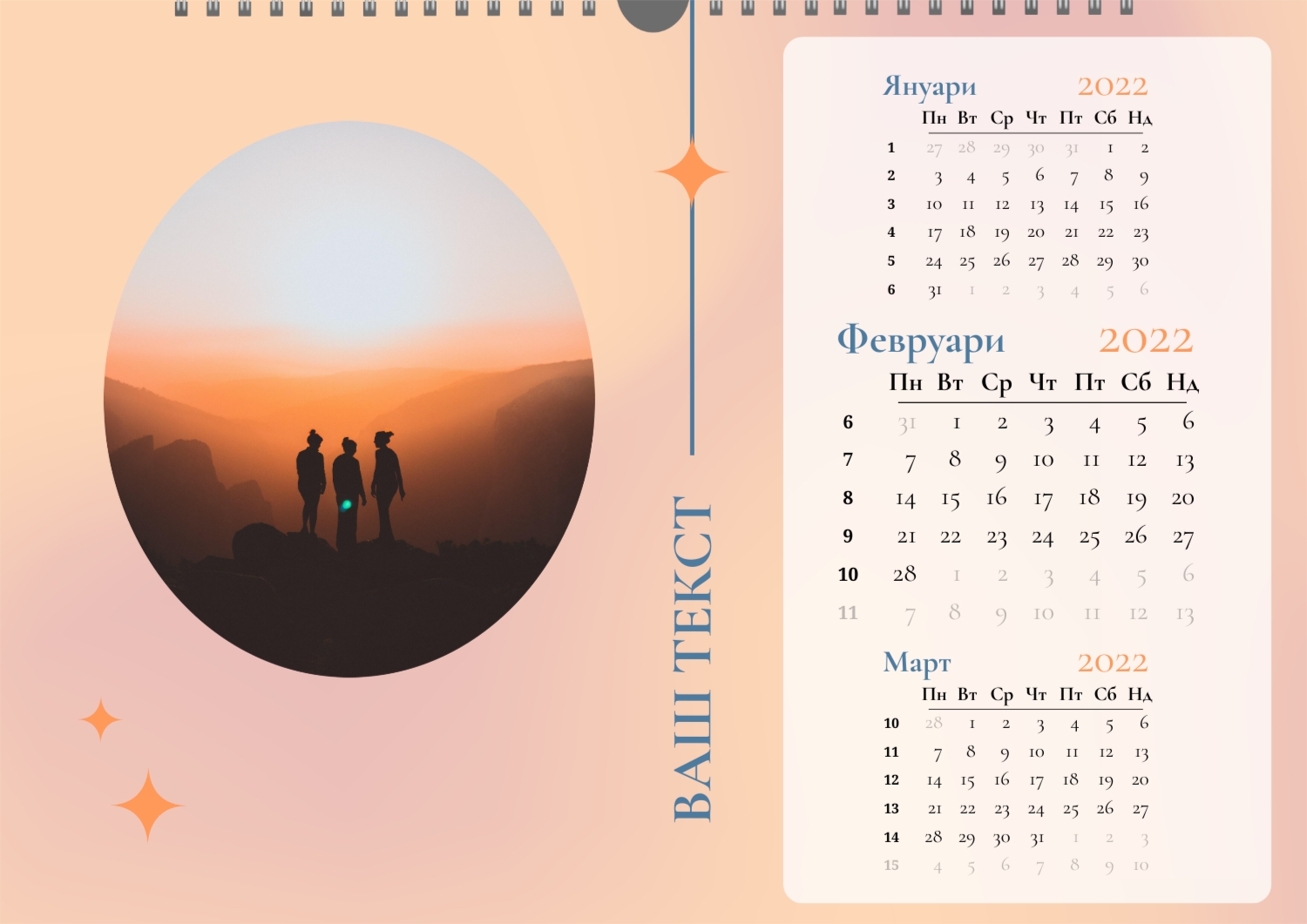 Шаблонът" най-добри спомени " за стенен широк календар в нашия онлайн конструктор предоставя уникална възможност да оживите най-ярките си моменти. Вдъхновен от мили спомени, този шаблон е създаден, за да можете лесно и креативно да проектирате календара си. С внимание към детайлите и лекота на използване, нашият онлайн конструктор ви позволява да персонализирате всеки елемент от този шаблон. Можете да променяте цветове, шрифтове, да добавяте свои снимки и текст, правейки всеки месец уникален. Персонализираният дизайн ще бъде отражение на вашия уникален стил и спомени. Създаването на вашия уникален хоризонтален стенен календар с помощта на шаблона "най-добри спомени" в нашия онлайн конструктор е възможност не само да запазите ценни моменти, но и да изразите своята индивидуалност чрез творческия процес на проектиране. Празнувайте всеки ден, вдъхвайки живот на спомените си и създайте календар, който ще ви радва през цялата година.