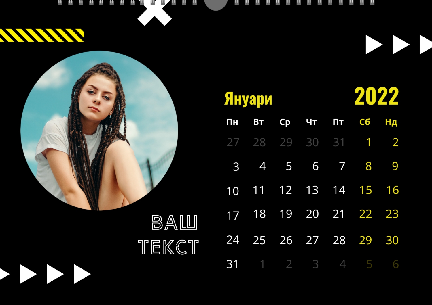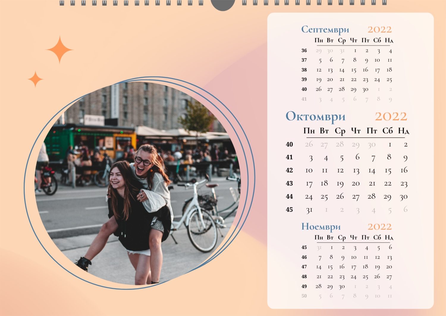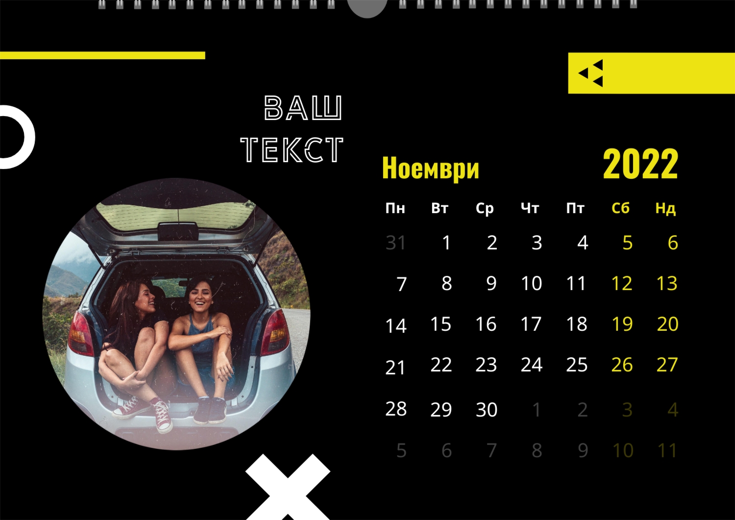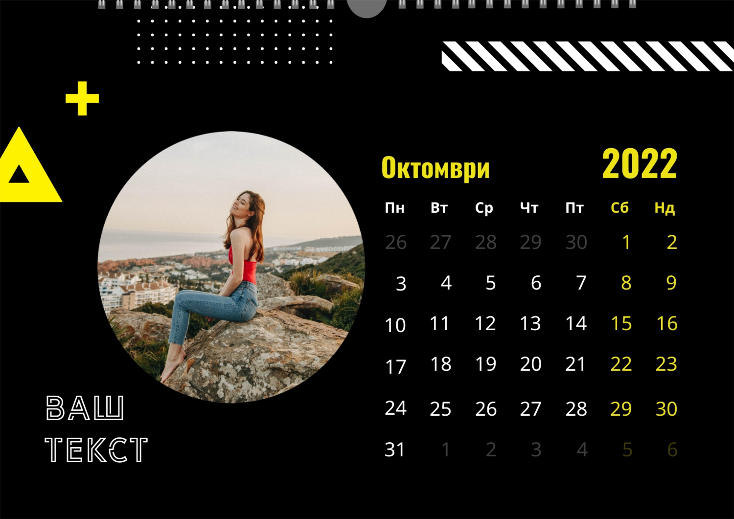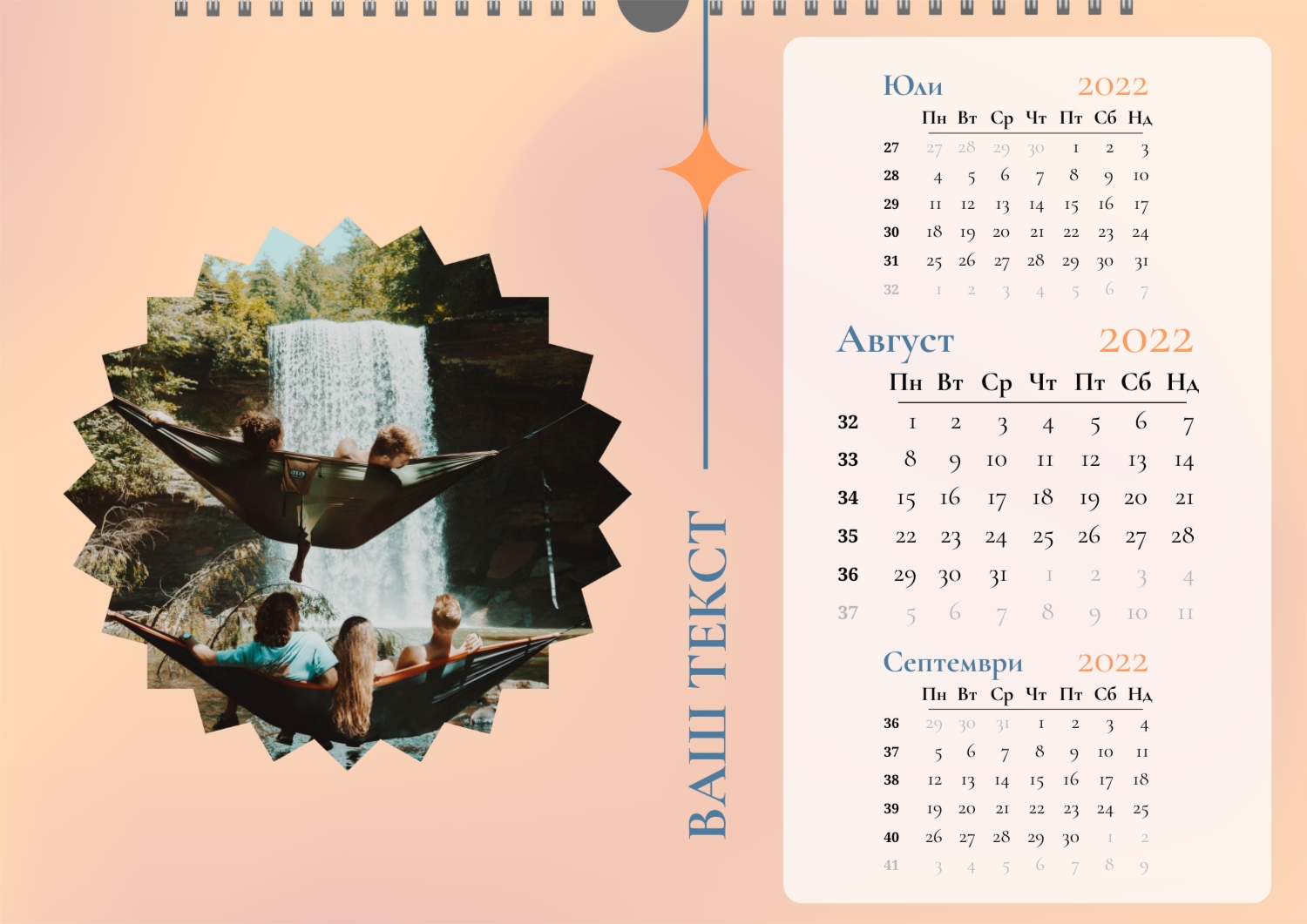 Шаблонът" най-добри спомени " за стенен широк календар в нашия онлайн конструктор предоставя уникална възможност да оживите най-ярките си моменти. Вдъхновен от мили спомени, този шаблон е създаден, за да можете лесно и креативно да проектирате календара си. С внимание към детайлите и лекота на използване, нашият онлайн конструктор ви позволява да персонализирате всеки елемент от този шаблон. Можете да променяте цветове, шрифтове, да добавяте свои снимки и текст, правейки всеки месец уникален. Персонализираният дизайн ще бъде отражение на вашия уникален стил и спомени. Създаването на вашия уникален хоризонтален стенен календар с помощта на шаблона "най-добри спомени" в нашия онлайн конструктор е възможност не само да запазите ценни моменти, но и да изразите своята индивидуалност чрез творческия процес на проектиране. Празнувайте всеки ден, вдъхвайки живот на спомените си и създайте календар, който ще ви радва през цялата година.