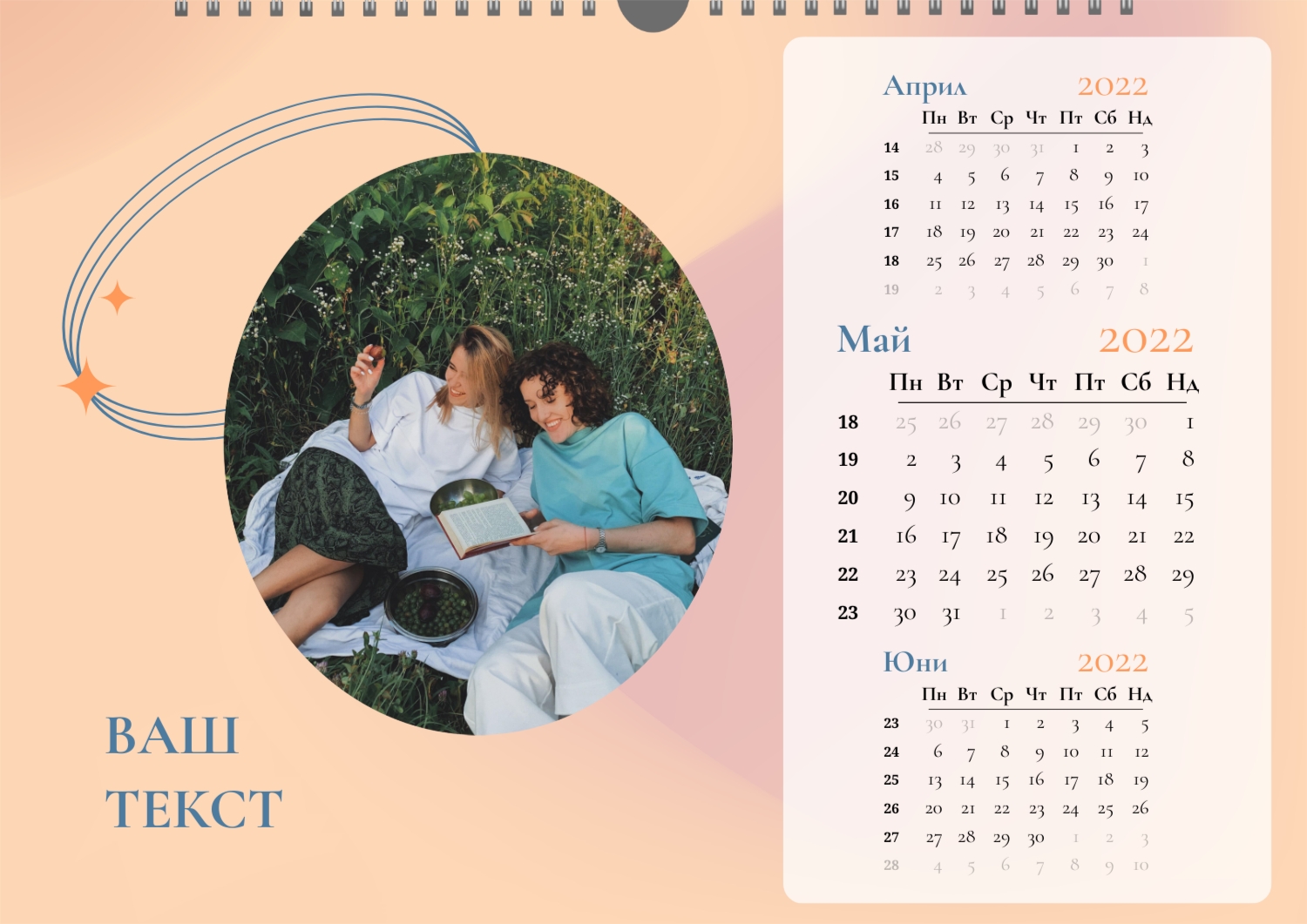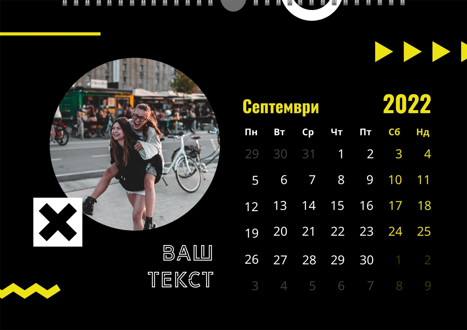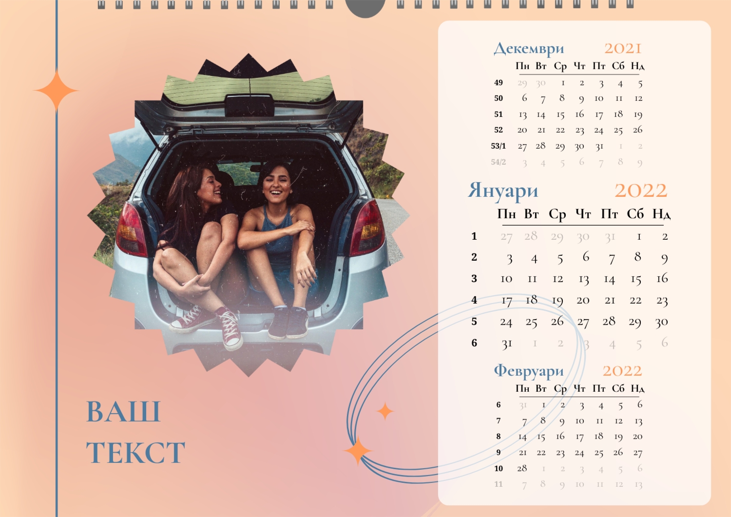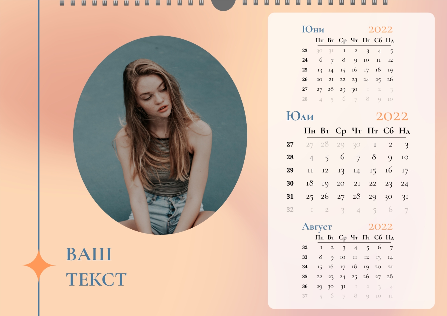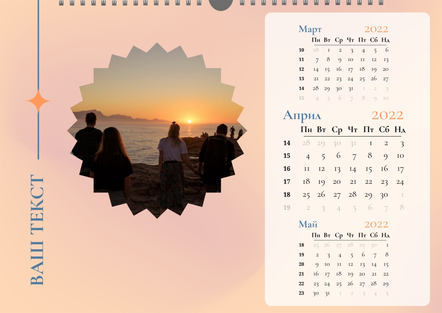 Шаблонът" най-добри спомени " за стенен широк календар в нашия онлайн конструктор предоставя уникална възможност да оживите най-ярките си моменти. Вдъхновен от мили спомени, този шаблон е създаден, за да можете лесно и креативно да проектирате календара си. С внимание към детайлите и лекота на използване, нашият онлайн конструктор ви позволява да персонализирате всеки елемент от този шаблон. Можете да променяте цветове, шрифтове, да добавяте свои снимки и текст, правейки всеки месец уникален. Персонализираният дизайн ще бъде отражение на вашия уникален стил и спомени. Създаването на вашия уникален хоризонтален стенен календар с помощта на шаблона "най-добри спомени" в нашия онлайн конструктор е възможност не само да запазите ценни моменти, но и да изразите своята индивидуалност чрез творческия процес на проектиране. Празнувайте всеки ден, вдъхвайки живот на спомените си и създайте календар, който ще ви радва през цялата година.