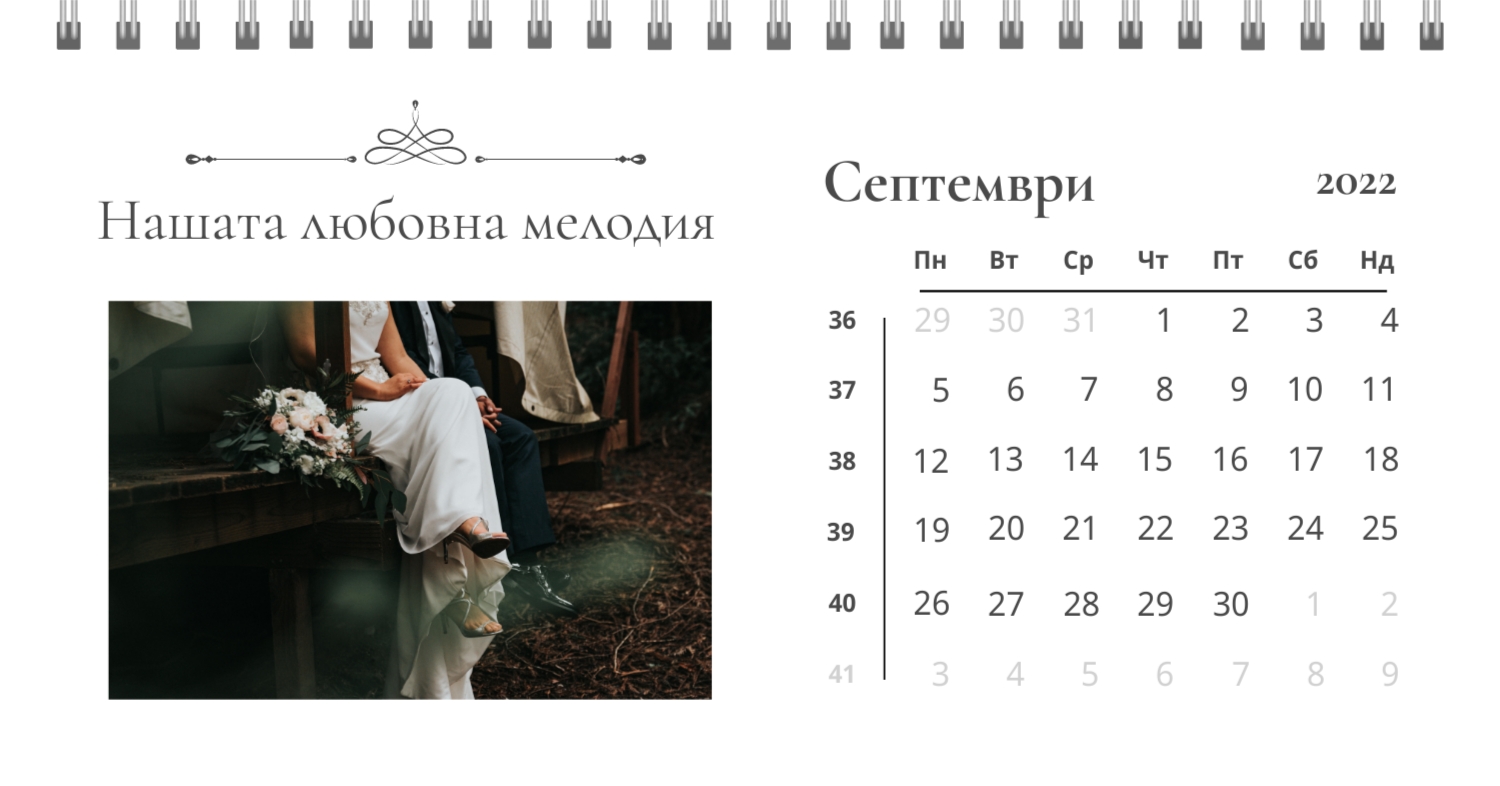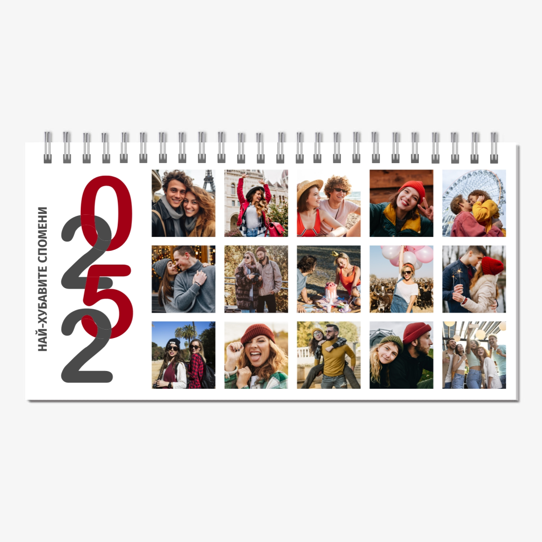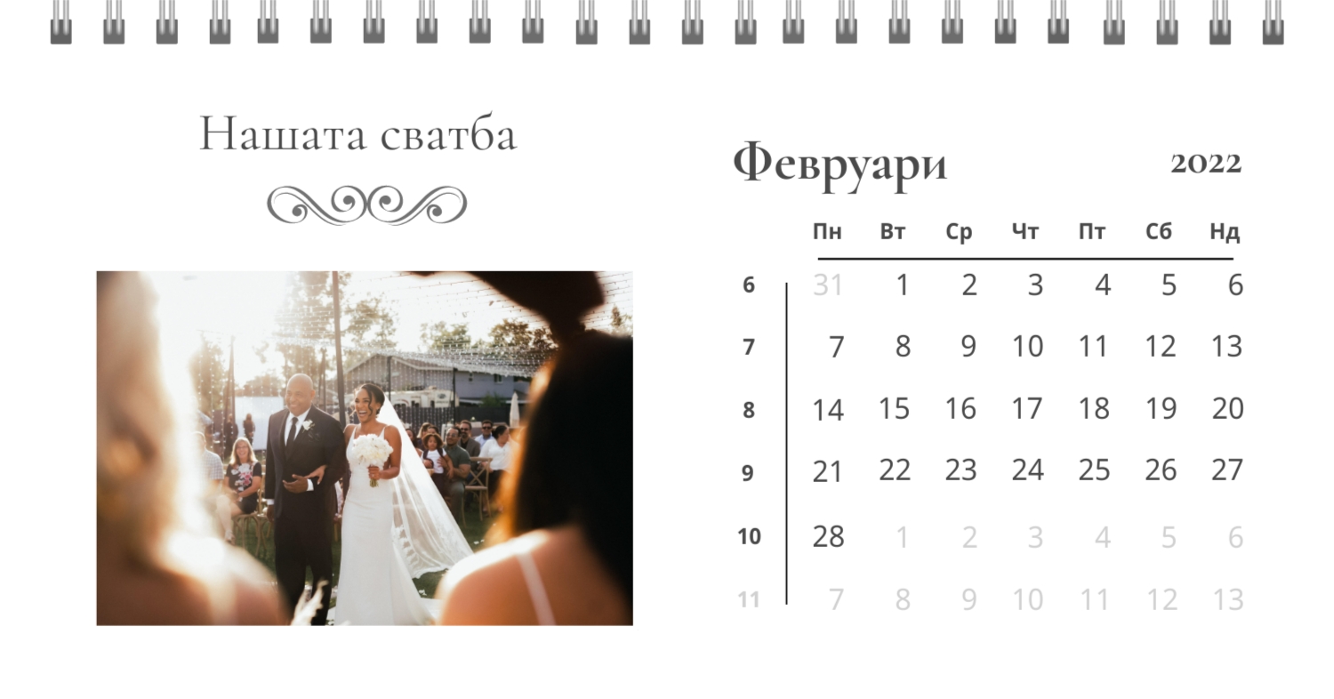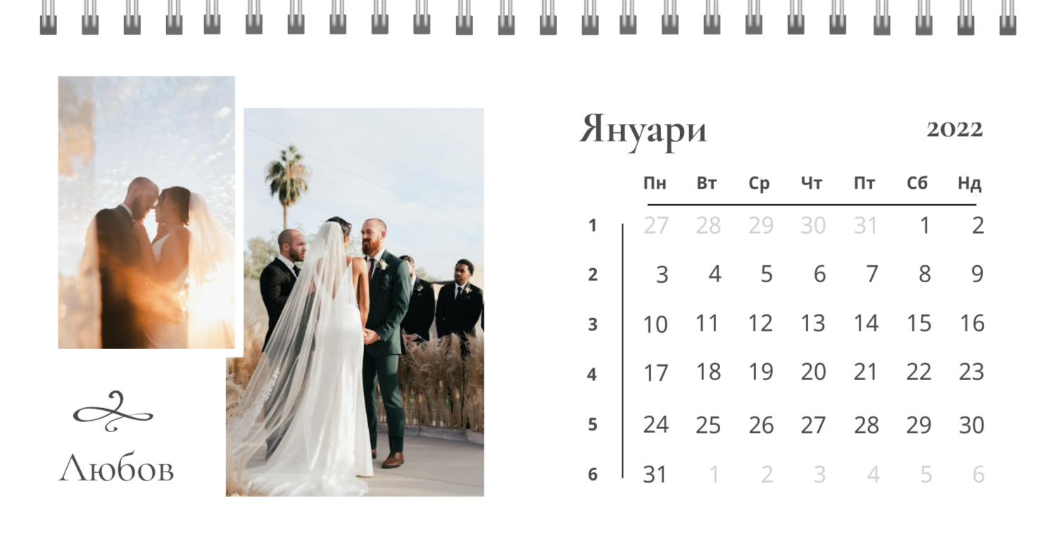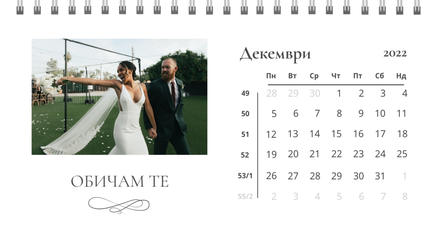 Шаблонът" щастлива зима за влюбени " е перфектната комбинация от уют и романтика, създадена специално за двойки, които искат да отпразнуват важните си дати в топла зимна атмосфера. Всички елементи на този календар са насочени към създаване на топло и вдъхновяващо настроение. Онлайн конструкторът предоставя широк спектър от възможности за персонализиране на този шаблон. Можете лесно да промените цветовата схема, като изберете онези нюанси, които отразяват вашата уникална любов. Шаблонът" щастлива зима за влюбените " ви дава възможност не само да следвате датите, но и да създадете заедно със спомените си уникална картина на вашето съвместно време.
