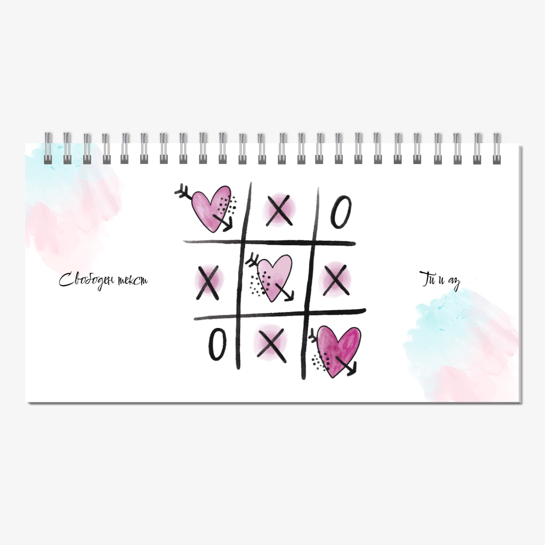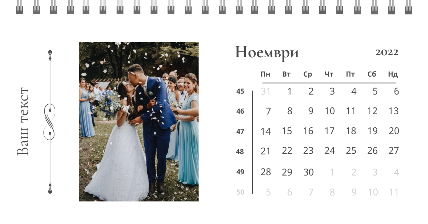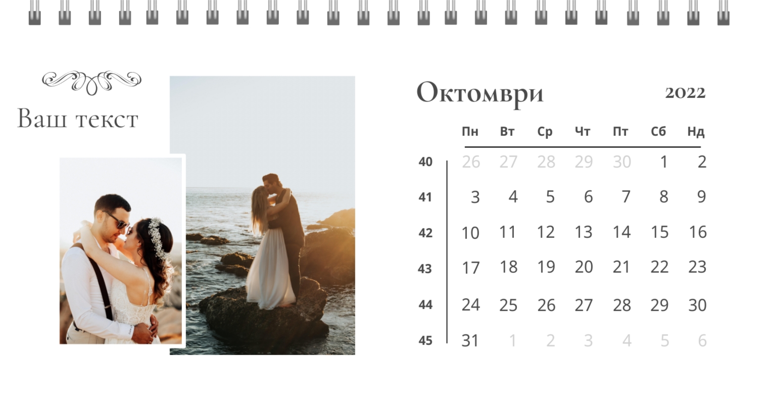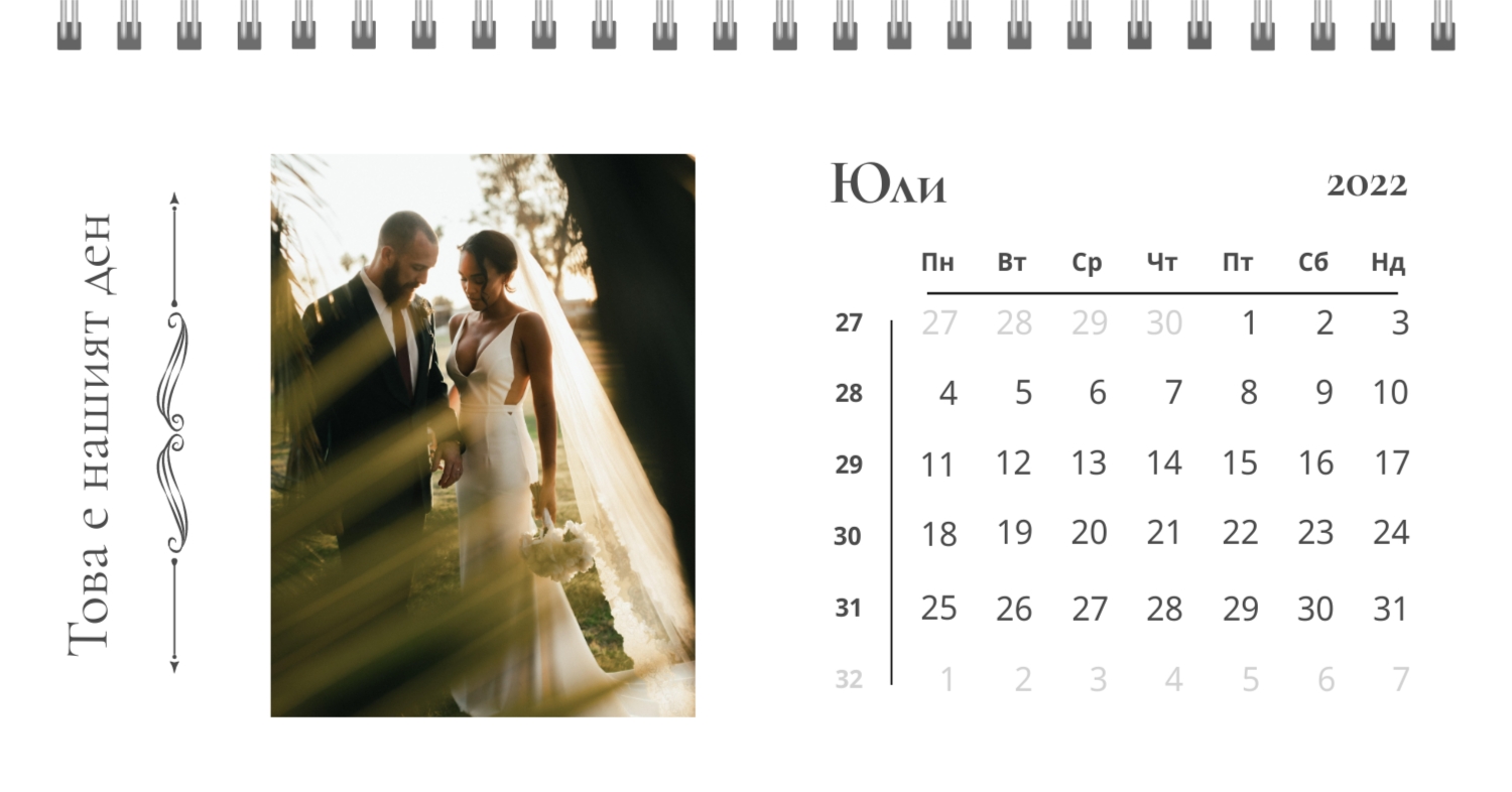 Шаблонът" щастлива зима за влюбени " е перфектната комбинация от уют и романтика, създадена специално за двойки, които искат да отпразнуват важните си дати в топла зимна атмосфера. Всички елементи на този календар са насочени към създаване на топло и вдъхновяващо настроение. Онлайн конструкторът предоставя широк спектър от възможности за персонализиране на този шаблон. Можете лесно да промените цветовата схема, като изберете онези нюанси, които отразяват вашата уникална любов. Шаблонът" щастлива зима за влюбените " ви дава възможност не само да следвате датите, но и да създадете заедно със спомените си уникална картина на вашето съвместно време.