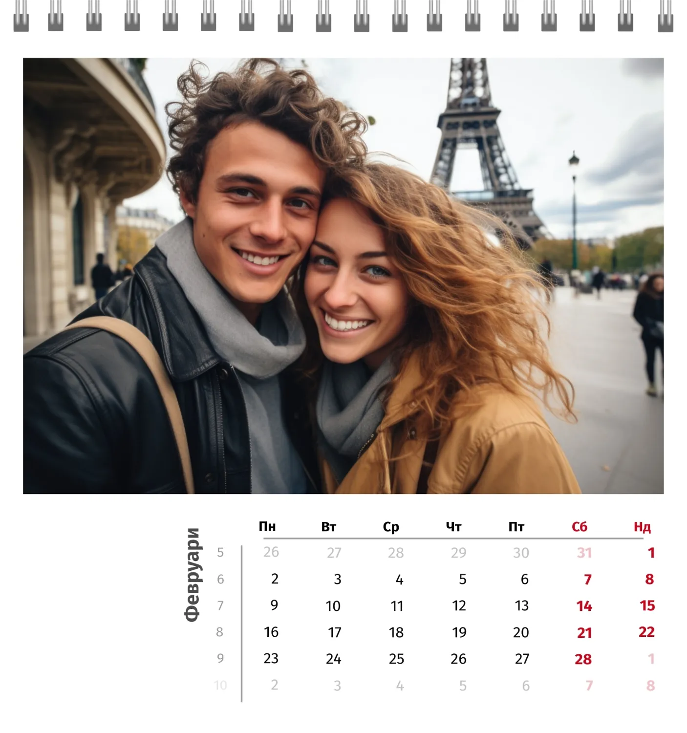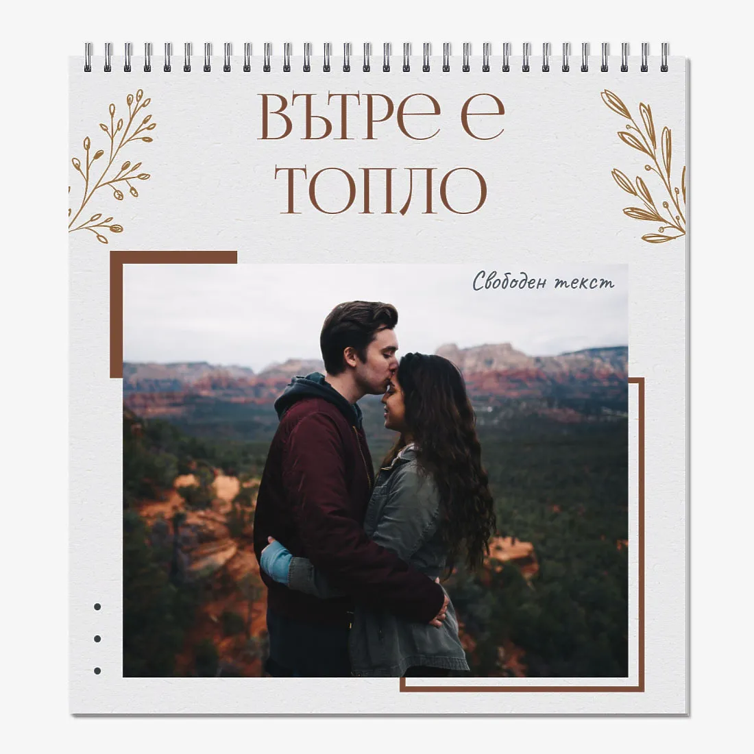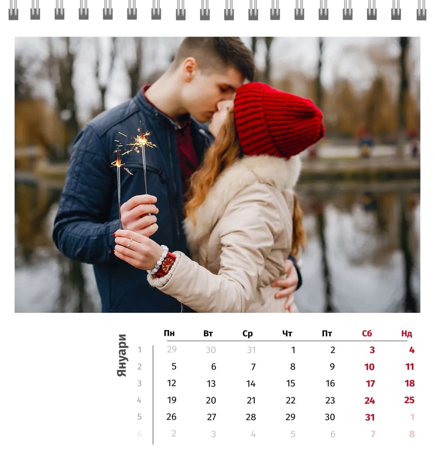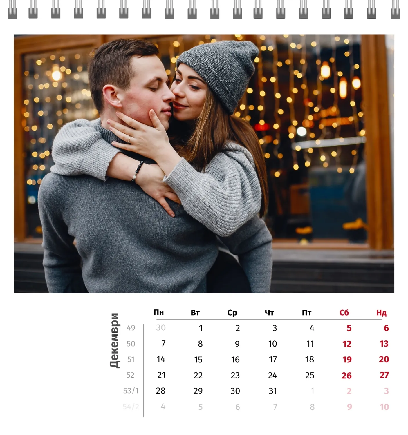 Шаблонът" щастлива зима за влюбени " е перфектната комбинация от уют и романтика, създадена специално за двойки, които искат да отпразнуват важните си дати в топла зимна атмосфера. Онлайн конструкторът предоставя широка гама от възможности за персонализиране на този шаблон за настолен календар. Можете лесно да промените цветовата схема, като изберете онези нюанси, които отразяват вашата уникална любов. Шаблонът" щастлива зима за влюбените " ви дава възможност не само да следвате датите, но и да създадете заедно със спомените си уникална картина на вашето съвместно време. Процесът на редактиране стъпка по стъпка в онлайн конструктора осигурява лекота на използване, като ви позволява да се съсредоточите върху това, което е наистина важно-вашата любов и уникалните моменти, които споделяте.
