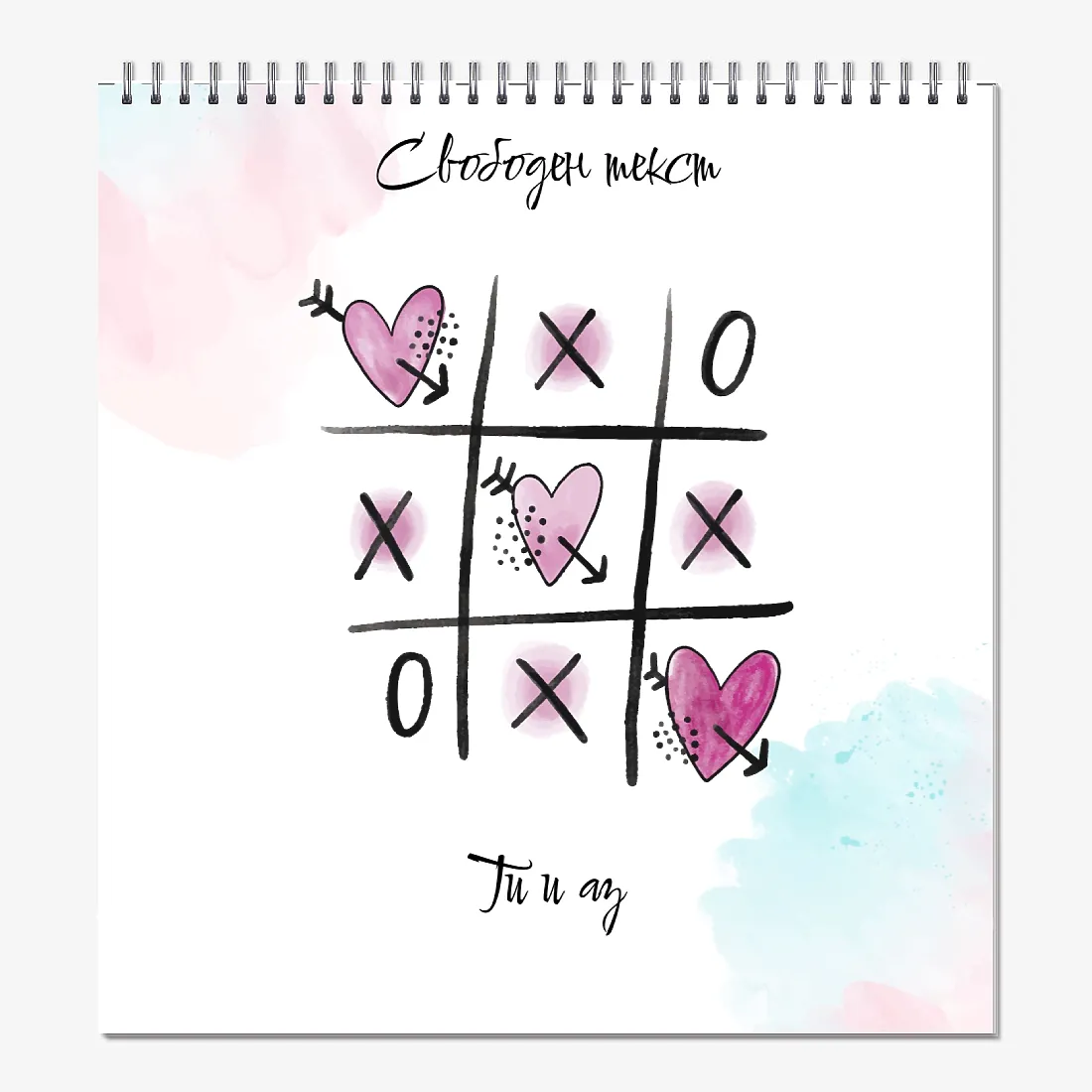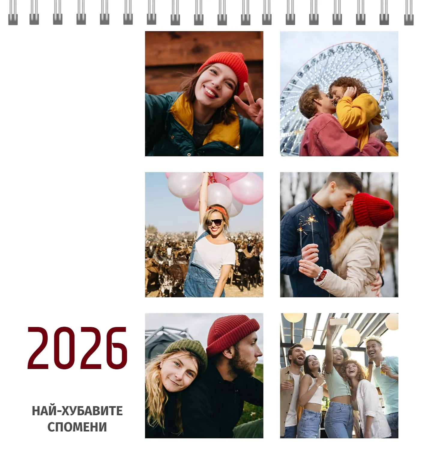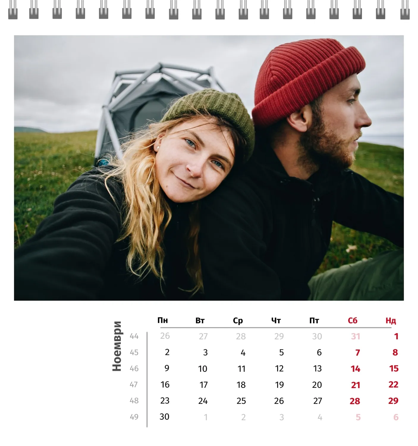 Шаблонът" щастлива зима за влюбени " е перфектната комбинация от уют и романтика, създадена специално за двойки, които искат да отпразнуват важните си дати в топла зимна атмосфера. Онлайн конструкторът предоставя широка гама от възможности за персонализиране на този шаблон за настолен календар. Можете лесно да промените цветовата схема, като изберете онези нюанси, които отразяват вашата уникална любов. Шаблонът" щастлива зима за влюбените " ви дава възможност не само да следвате датите, но и да създадете заедно със спомените си уникална картина на вашето съвместно време. Процесът на редактиране стъпка по стъпка в онлайн конструктора осигурява лекота на използване, като ви позволява да се съсредоточите върху това, което е наистина важно-вашата любов и уникалните моменти, които споделяте.