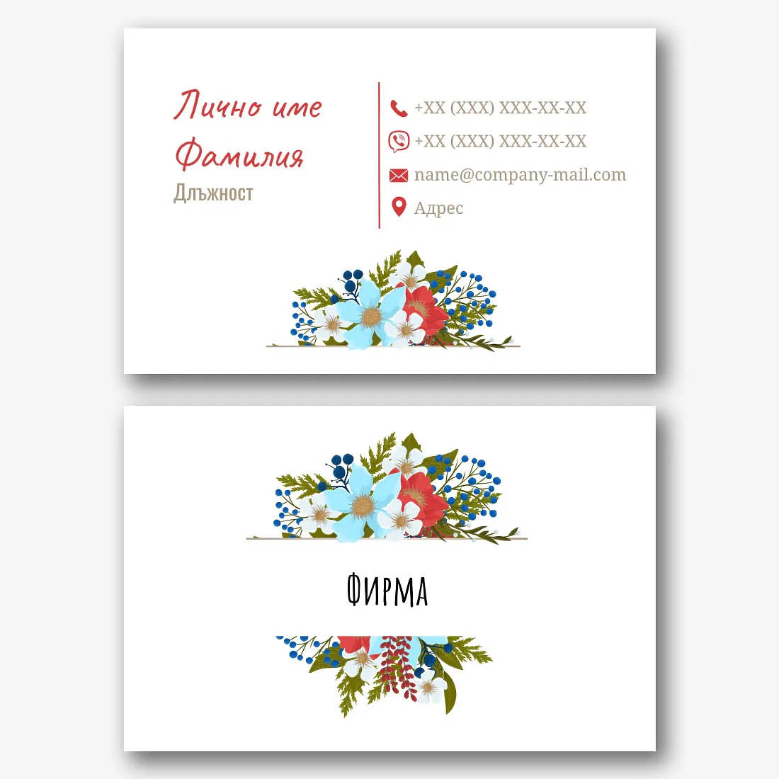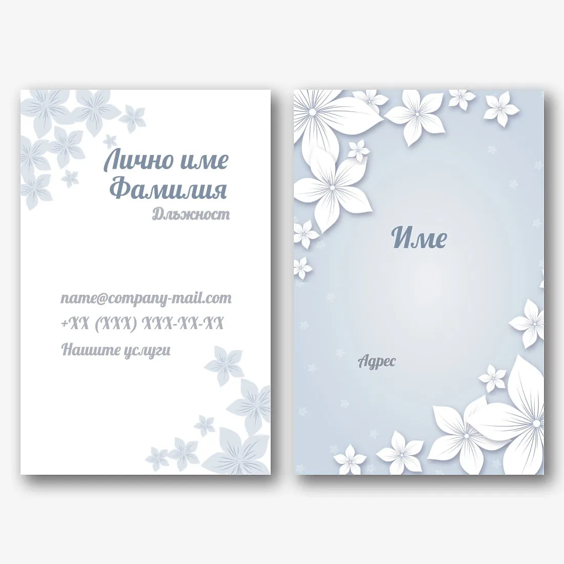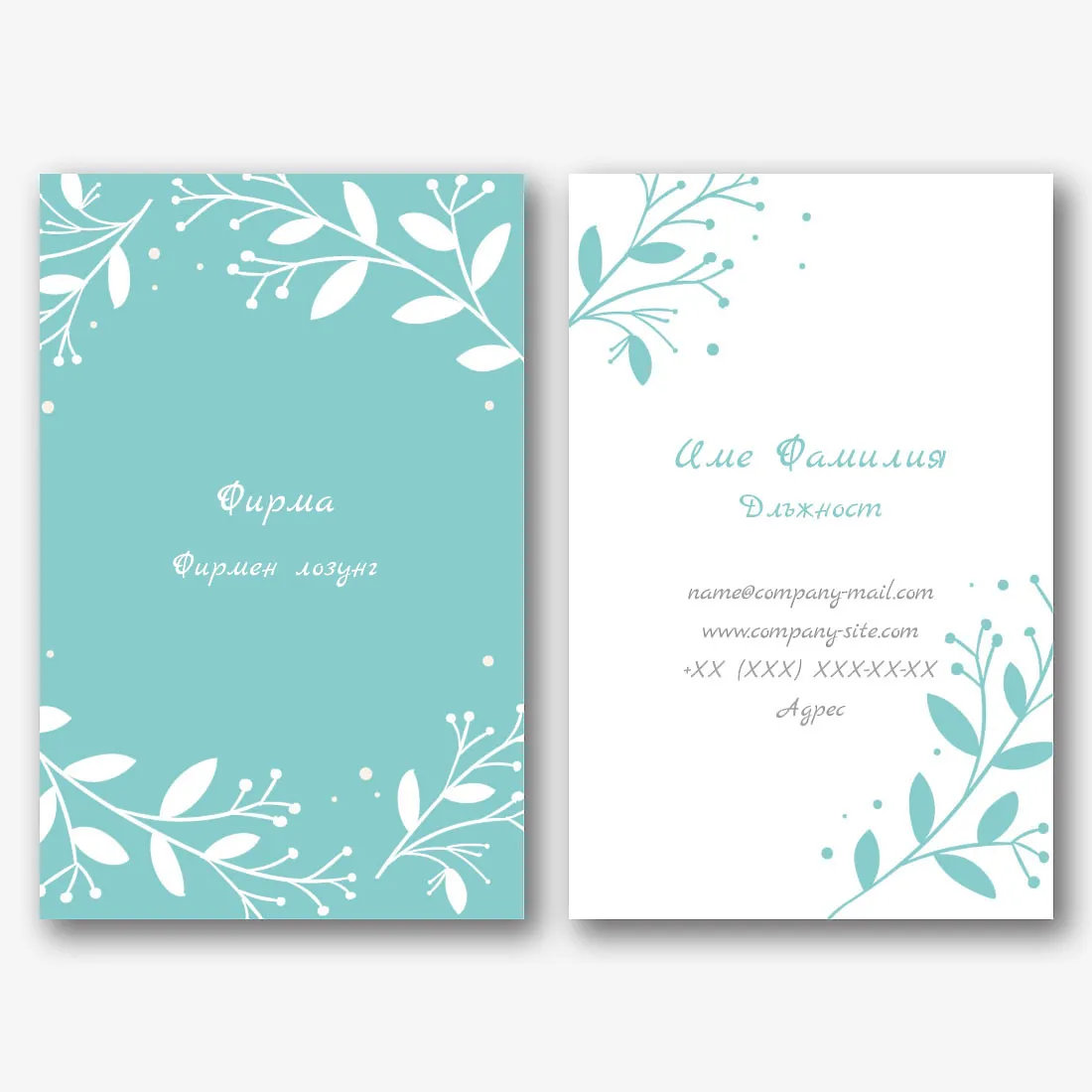 Визитката на цветаря е отражение на вашия талант, стил и индивидуалност. Нашият готин и стилен шаблон за евро визитка за цветар е проектиран с всички тези аспекти, за да можете да се откроите от конкуренцията и да оставите незабравимо впечатление на клиентите си. Насладете се на професионален дизайн, който съчетава елегантност и креативност с флоралното изкуство. Ярки и деликатни нюанси, елегантни флорални елементи и изискани шрифтове правят тази визитка идеален избор за тези, които ценят красотата и хармонията. Използвайте нашия онлайн дизайнер, за да създадете уникална визитка със собствените си ръце. Персонализирайте шаблона, като добавите вашето име, данни за контакт и логото на вашия бизнес. Това е бързо и лесно — можете да получите готовия резултат само за няколко минути. Не пропускайте възможността да се откроите от конкурентите и да създадете уникален образ на вашия бизнес с цветя. Използвайте нашия стилен шаблон за визитка за цветар и дайте възможност на вашата марка да процъфтява в света на красотата и творчеството.
