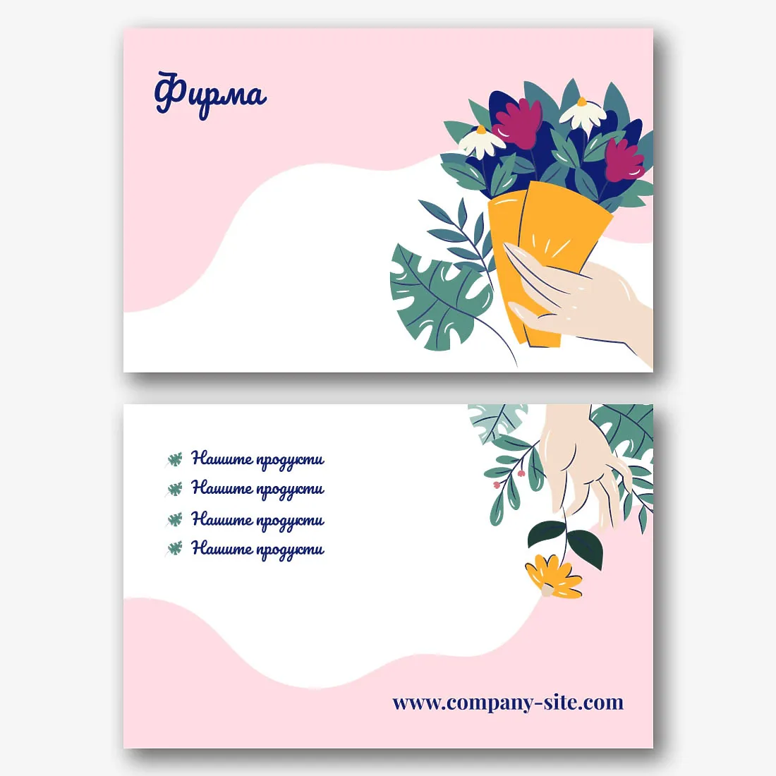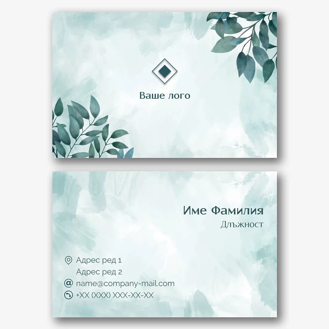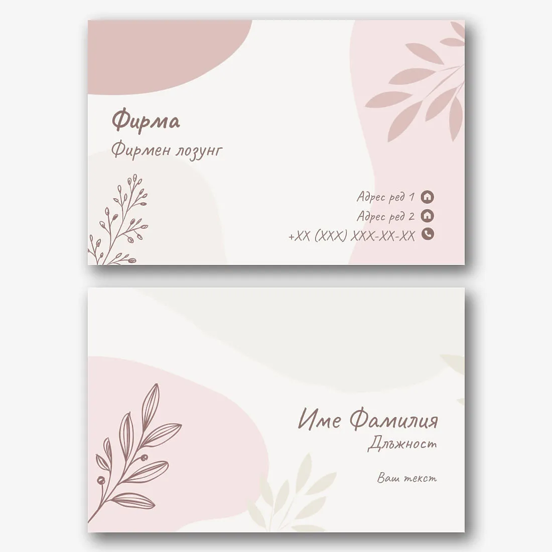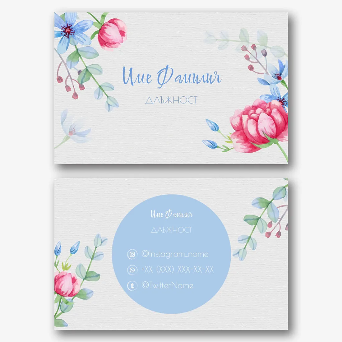 Визитката на цветаря е отражение на вашия талант, стил и индивидуалност. Нашият готин и стилен шаблон за евро визитка за цветар е проектиран с всички тези аспекти, за да можете да се откроите от конкуренцията и да оставите незабравимо впечатление на клиентите си. Насладете се на професионален дизайн, който съчетава елегантност и креативност с флоралното изкуство. Ярки и деликатни нюанси, елегантни флорални елементи и изискани шрифтове правят тази визитка идеален избор за тези, които ценят красотата и хармонията. Използвайте нашия онлайн дизайнер, за да създадете уникална визитка със собствените си ръце. Персонализирайте шаблона, като добавите вашето име, данни за контакт и логото на вашия бизнес. Това е бързо и лесно — можете да получите готовия резултат само за няколко минути. Не пропускайте възможността да се откроите от конкурентите и да създадете уникален образ на вашия бизнес с цветя. Използвайте нашия стилен шаблон за визитка за цветар и дайте възможност на вашата марка да процъфтява в света на красотата и творчеството.