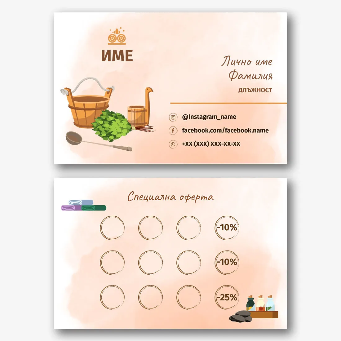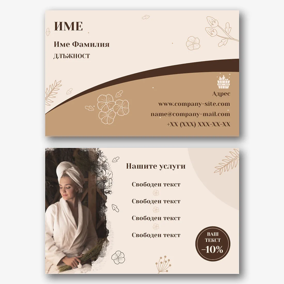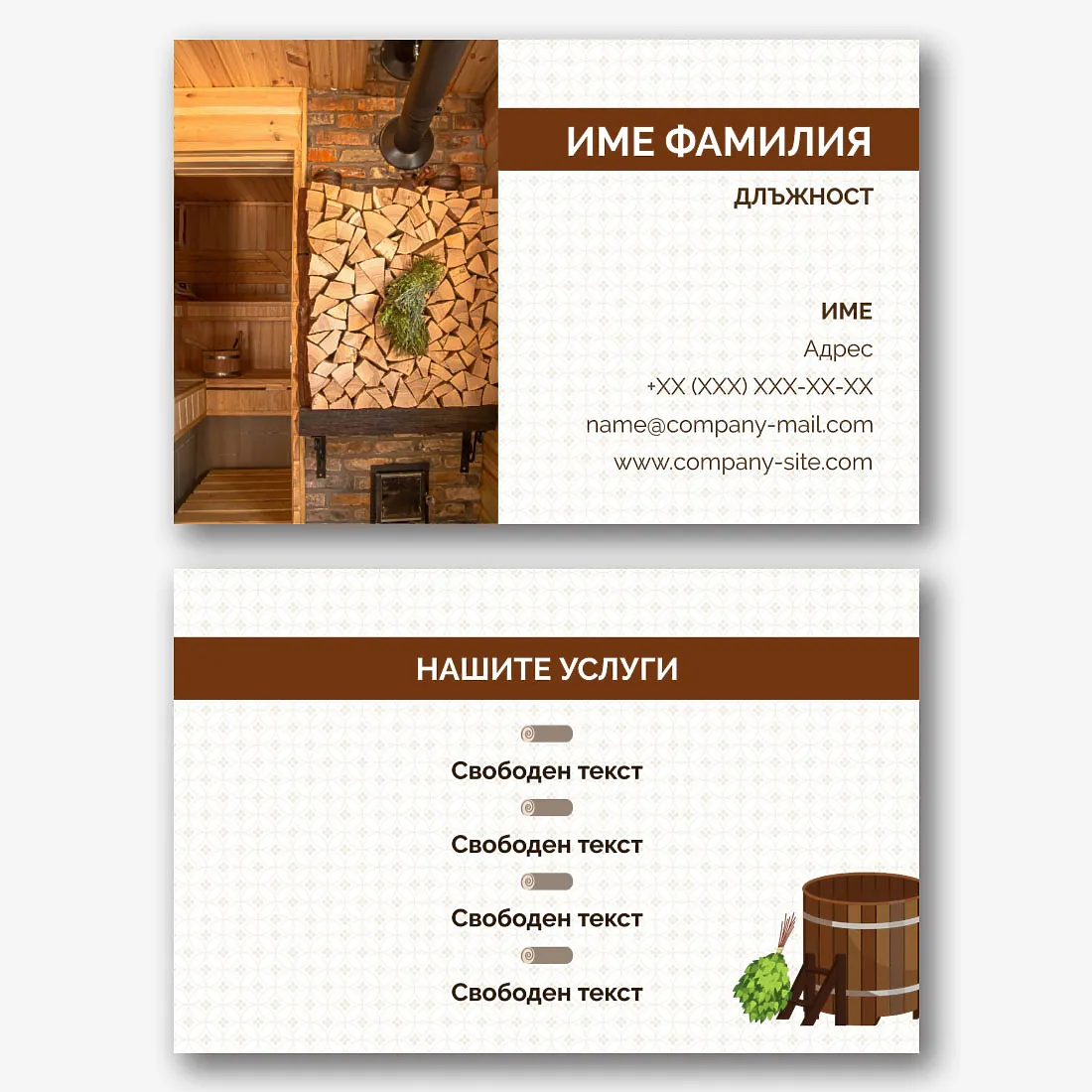 Нашият нов шаблон за евро визитки за бани и сауни е перфектната комбинация от елегантност и практичност. С него можете да представите бизнеса си в най-добрата светлина, привличайки клиенти със своя професионализъм и стил. На тази визитка ще намерите изискан дизайн, който директно отразява атмосферата на вашето заведение. Той включва фини линии, изискани шрифтове и детайли, които му придават уникален вид. Използвайки този шаблон в нашия удобен онлайн конструктор, можете лесно да направите промени и да създадете визитка, която напълно отговаря на вашия вкус и корпоративен стил. Това е чудесен начин да се откроите от конкуренцията и да убедите потенциалните клиенти в качеството на вашите услуги.