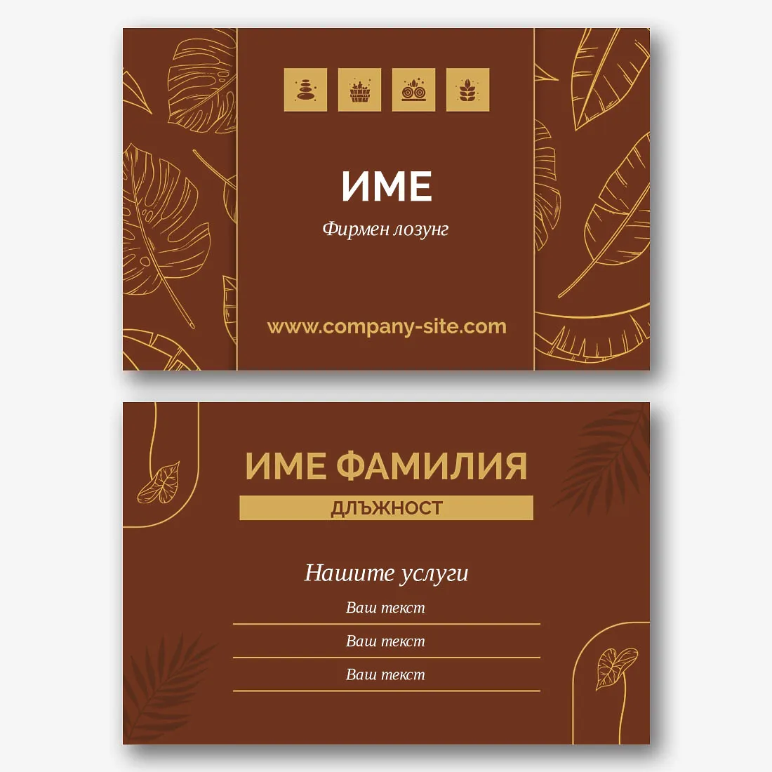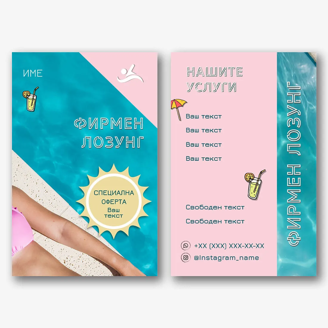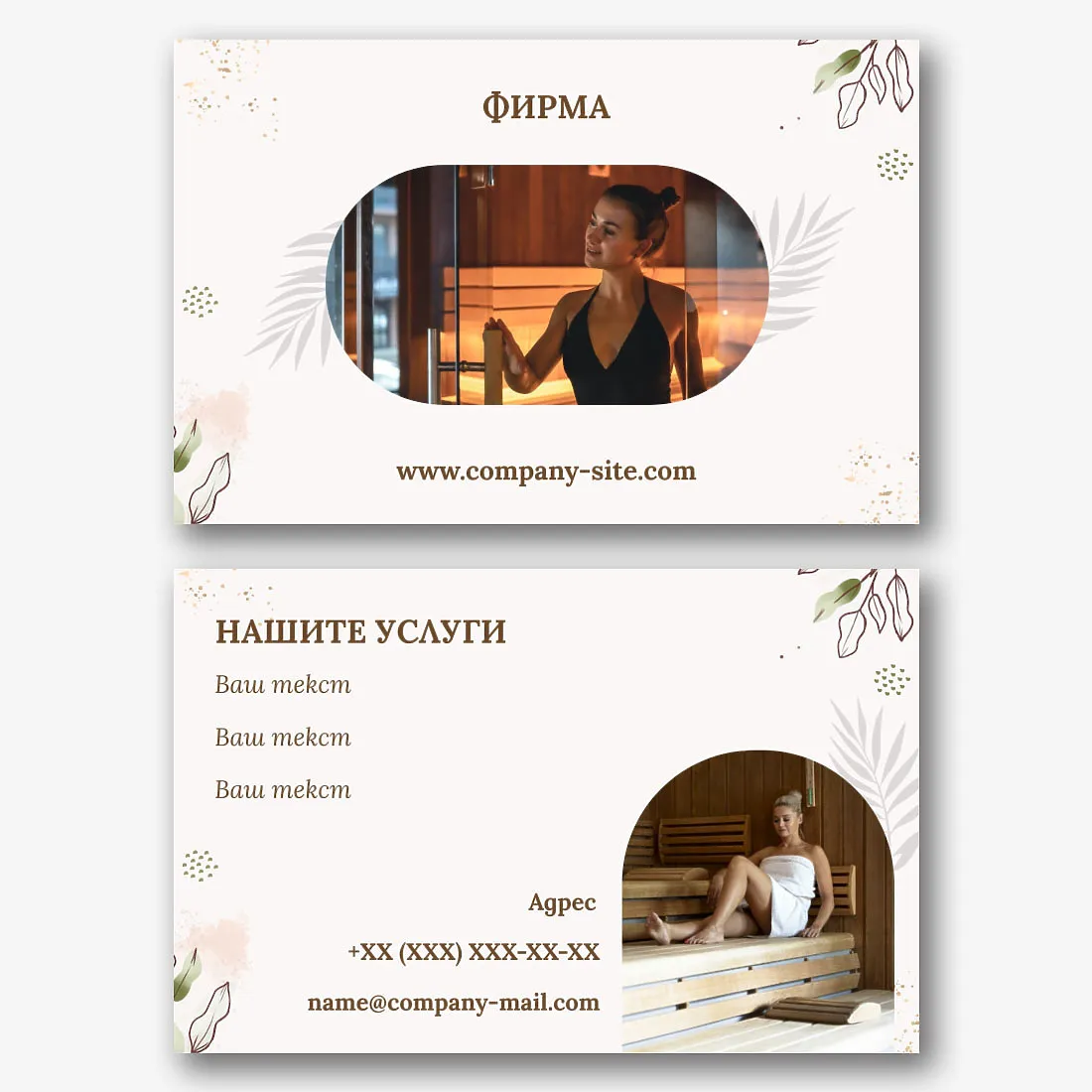 Нашият нов шаблон за евро визитки за бани и сауни е перфектната комбинация от елегантност и практичност. С него можете да представите бизнеса си в най-добрата светлина, привличайки клиенти със своя професионализъм и стил. На тази визитка ще намерите изискан дизайн, който директно отразява атмосферата на вашето заведение. Той включва фини линии, изискани шрифтове и детайли, които му придават уникален вид. Използвайки този шаблон в нашия удобен онлайн конструктор, можете лесно да направите промени и да създадете визитка, която напълно отговаря на вашия вкус и корпоративен стил. Това е чудесен начин да се откроите от конкуренцията и да убедите потенциалните клиенти в качеството на вашите услуги.