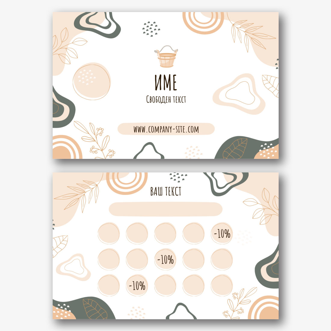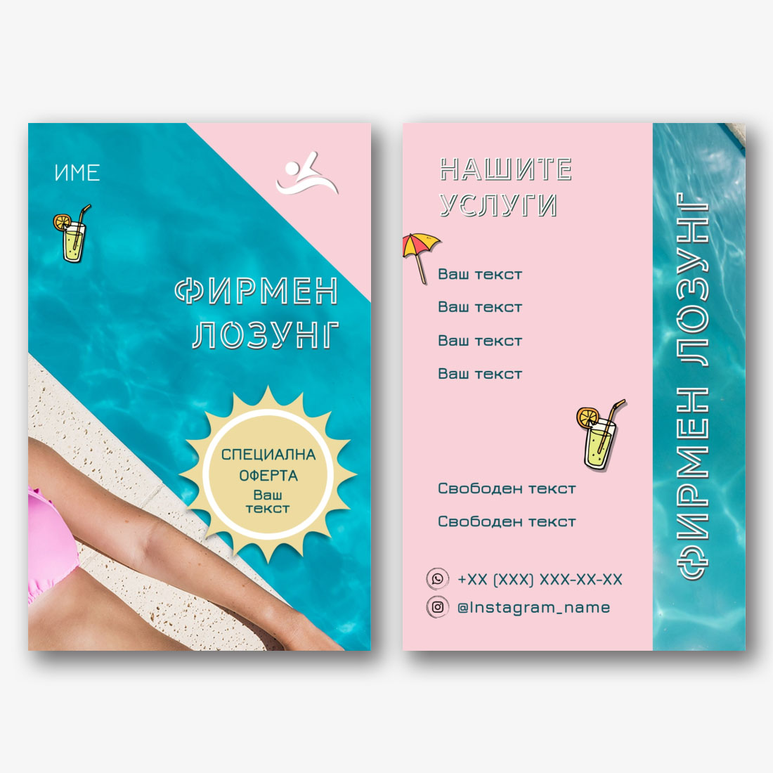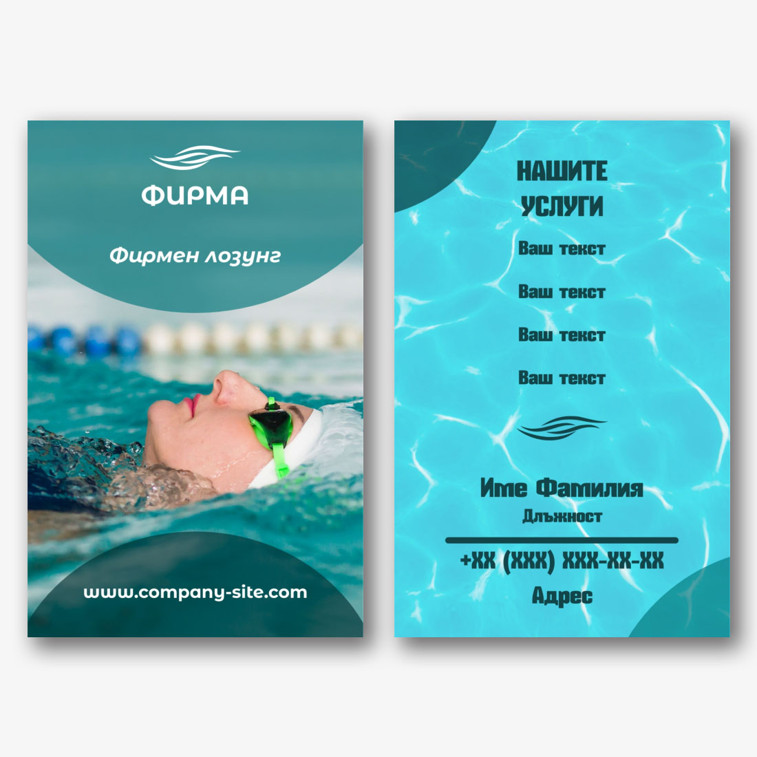 Този шаблон за евро визитка има за цел да отличи вашата компания от конкуренцията, като добави визуален ефект и професионализъм. Онлайн дизайнерът предоставя възможност на всеки да създаде уникален дизайн на визитка, съответстващ на индивидуалните предпочитания и нужди. Лесен за използване и гъвкав, този инструмент ви позволява сами да придадете характер и стил на вашата визитка, което я прави отражение на вашата марка и привлекателен маркетингов инструмент. Шаблонът за визитни картички за сауни и бани е идеалното решение за тези, които се стремят към професионален и стилен образ на своя бизнес. Той предлага простота и използваемост, като същевременно поддържа високо качество и естетика на дизайна, което го прави незаменим инструмент за създаване на уникални визитки със собствените си ръце. Изберете нашите шаблони и се опитайте да реализирате всичките си идеи заедно с онлайн конструктора!