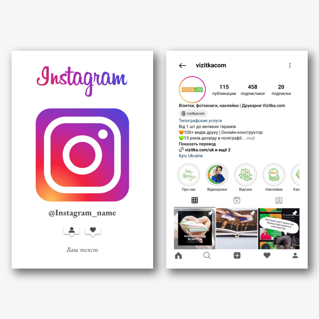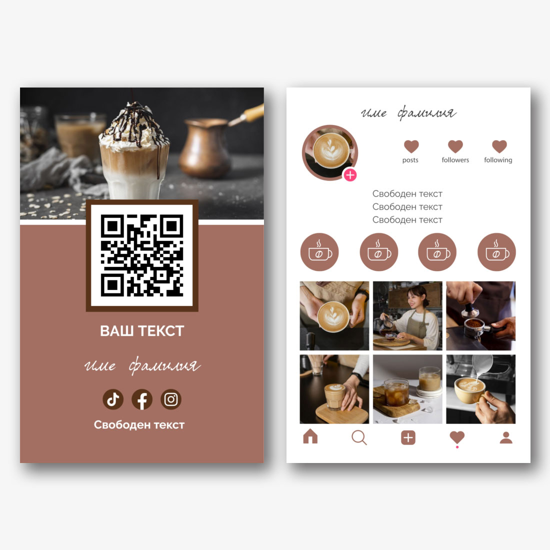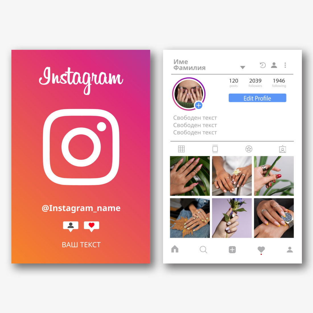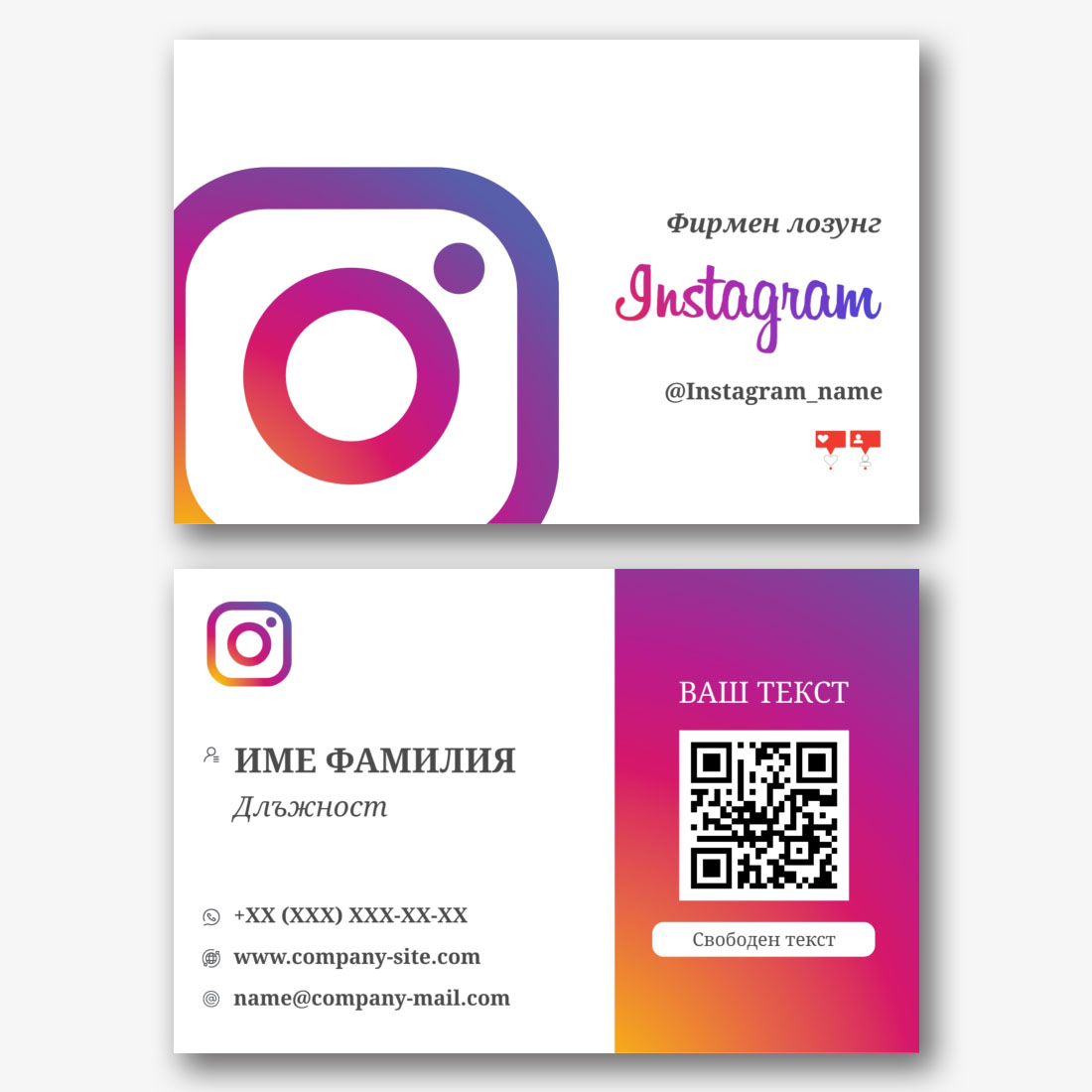 Онлайн конструкторът за създаване на инстаграм визитки е чудесен инструмент, за да направите профила си истински привлекателен и запомнящ.. Започнете, като изберете шаблон за евро визитка, който отразява Вашата уникална естетика и стил. Имате богат избор от теми и дизайни, което ви позволява да изберете най-подходящия. След това персонализирайте шаблона, като добавите информация, която ще бъде полезна за вашите последователи: вашето име или име на профил, данни за контакт, връзки към други социални мрежи или уебсайт. Сега вашата визитка ще служи като ефективен инструмент за привличане на нови последователи и засилване на присъствието ви в социалната мрежа.
