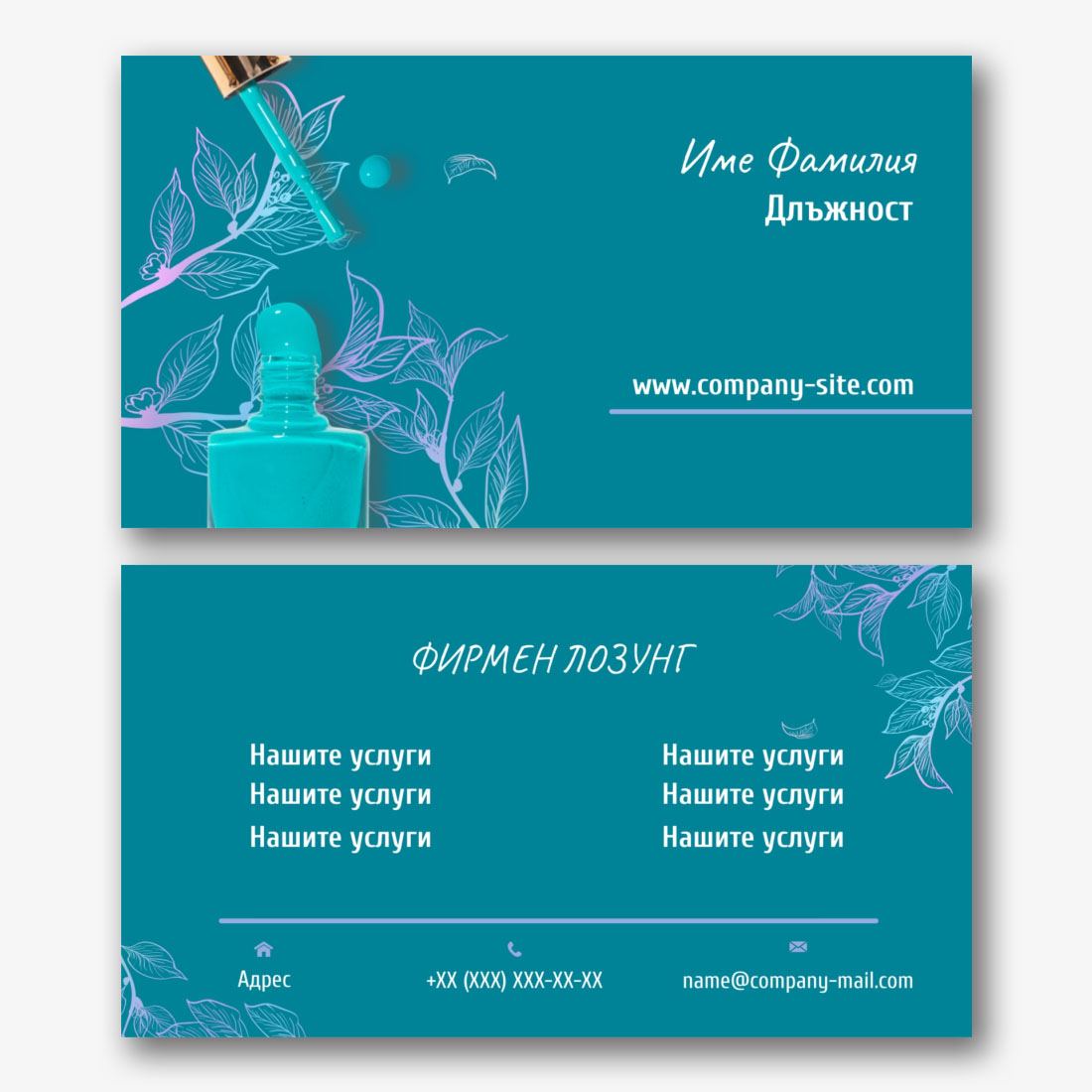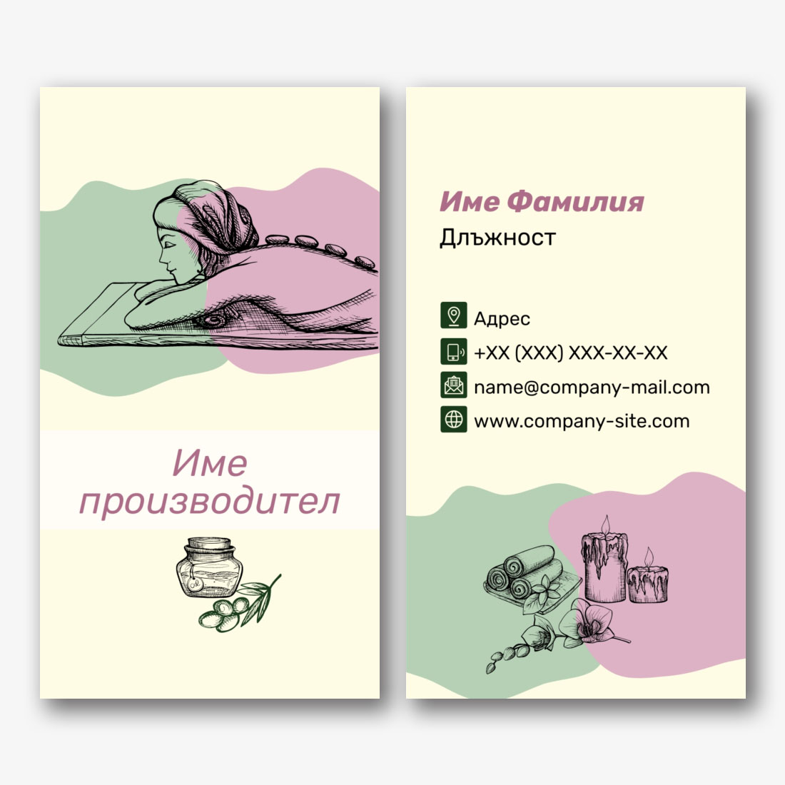 Готовият шаблон за визитка за масажист е подходящ за специалисти, работещи в областта на масажа и уелнес индустрията. Този шаблон е проектиран така, че да отговаря на нуждите на професионалисти като масажисти, физиотерапевти, хиропрактици, акупунктури и други уелнес експерти. Визитката е направена в модерен и атрактивен стил, който веднага привлича вниманието и създава положително впечатление. Едно от основните предимства на нашия шаблон е възможността за лесно редактиране в онлайн конструктора. Потребителят може да промени всеки детайл от визитката, вариращ от цвят и шрифтове до поставяне на елементи и добавяне на собствени лога или изображения. Това ви позволява да създадете уникална и персонализирана визитка, която напълно ще отразява индивидуалността и професионалния подход на специалиста. Нашият онлайн конструктор е интуитивен и лесен за използване, което прави процеса на създаване на визитка бърз и забавен. Можете да добавите вашата информация за контакт, да посочите специализация и да поставите връзки към социални медии или уебсайт. Благодарение на вградените инструменти за редактиране, всеки елемент от визитката може да бъде персонализиран, както желаете, осигурявайки максимална гъвкавост и творческа свобода.